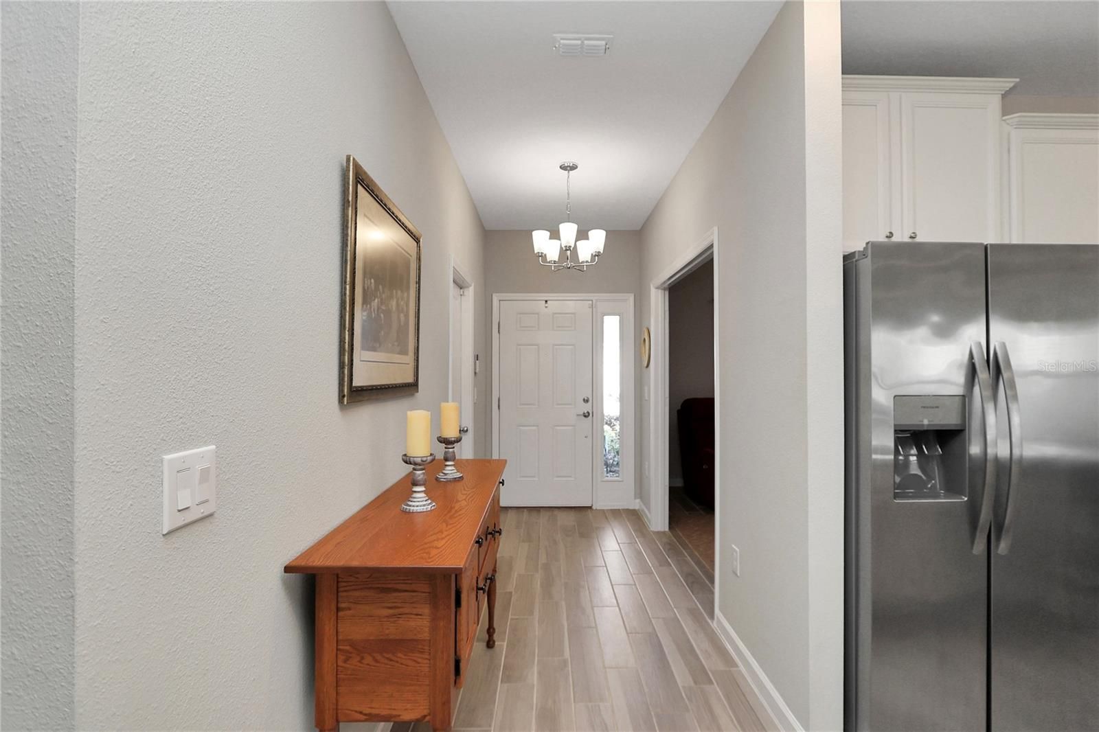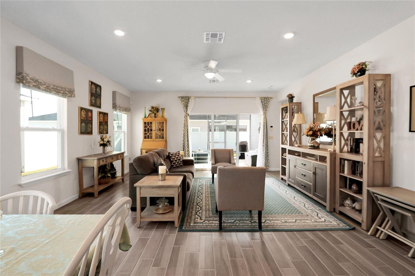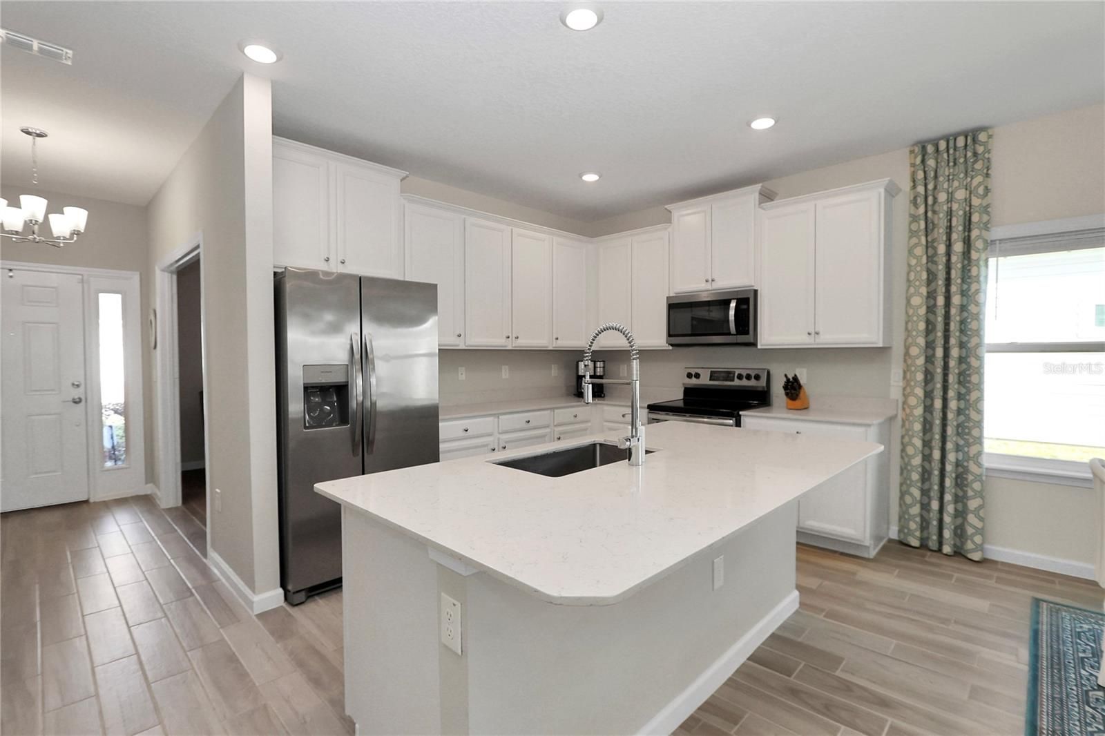 This beautifully upgraded former model home combines modern elegance with everyday comfort, offering the perfect balance of style, function, and designer finishes. From the moment you step inside, you’re welcomed by stunning 42-inch white cabinets with crown molding, sleek quartz countertops, and a spacious island—an ideal setting for entertaining and gathering. A rolling wall of glass doors creates a seamless transition to the covered, screened lanai, where you can relax and unwind. Inside, wood-inspired tile flows throughout the main living areas, adding warmth and a sophisticated touch. With three generously sized bedrooms, a den, and two full bathrooms, there’s plenty of space for both relaxation and privacy. The primary suite serves as a true retreat, featuring a large closet, dual vanities, and an expansive walk-in shower. Thoughtful upgrades by the seller further elevate the home, including soft light gray interior paint. The exterior is equally impressive, with beautiful curb appeal. Close to the Amenities center. Residents of the community enjoy a covered pavilion, resort-style pool, and recreational amenities such as bocce, pickleball, and shuffleboard—perfect for an active and social lifestyle. Ideally located near shopping and dining, and just 15 minutes from the renowned World Equestrian Center, this home offers both convenience and a vibrant, upscale living experience.
