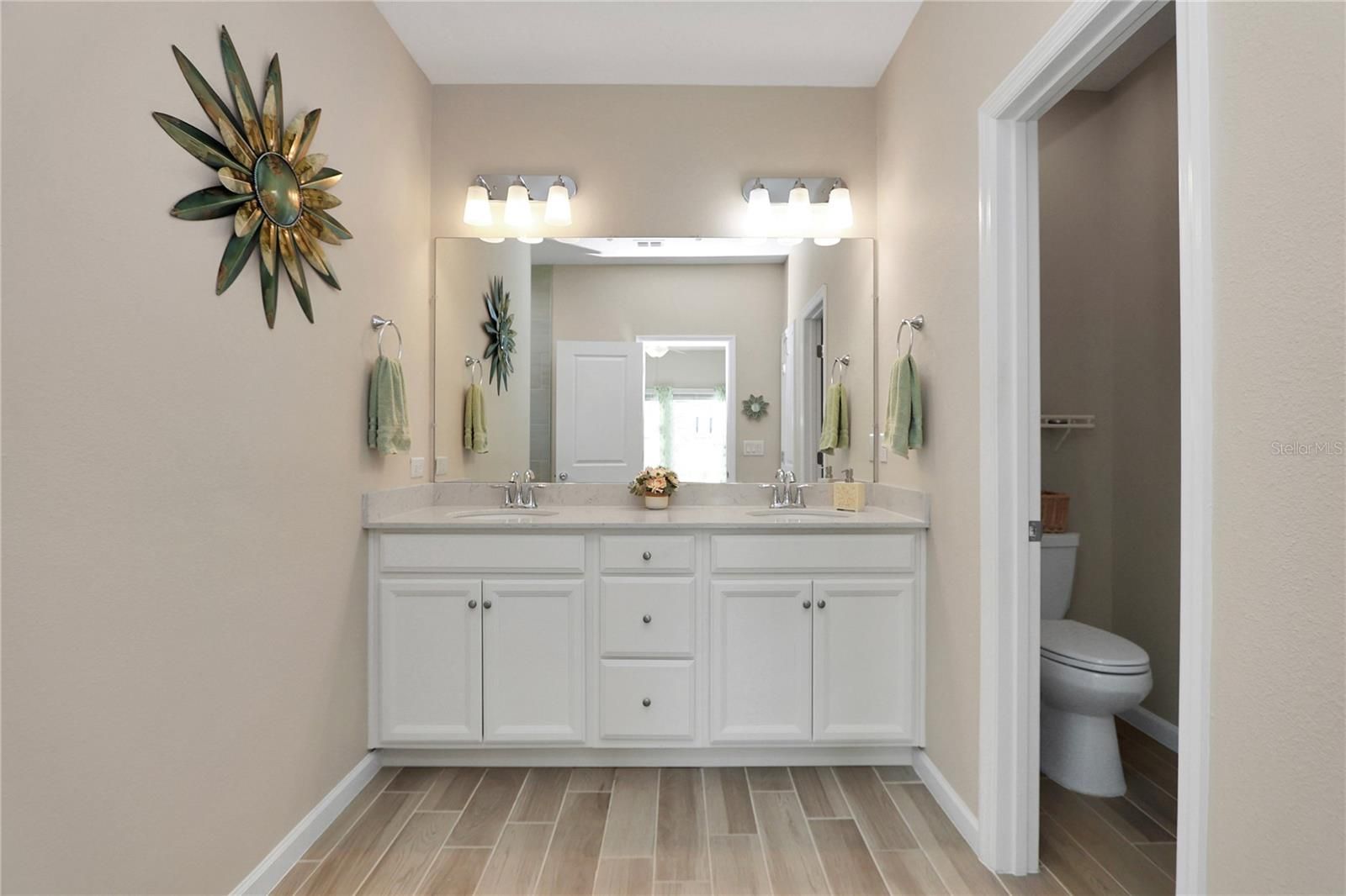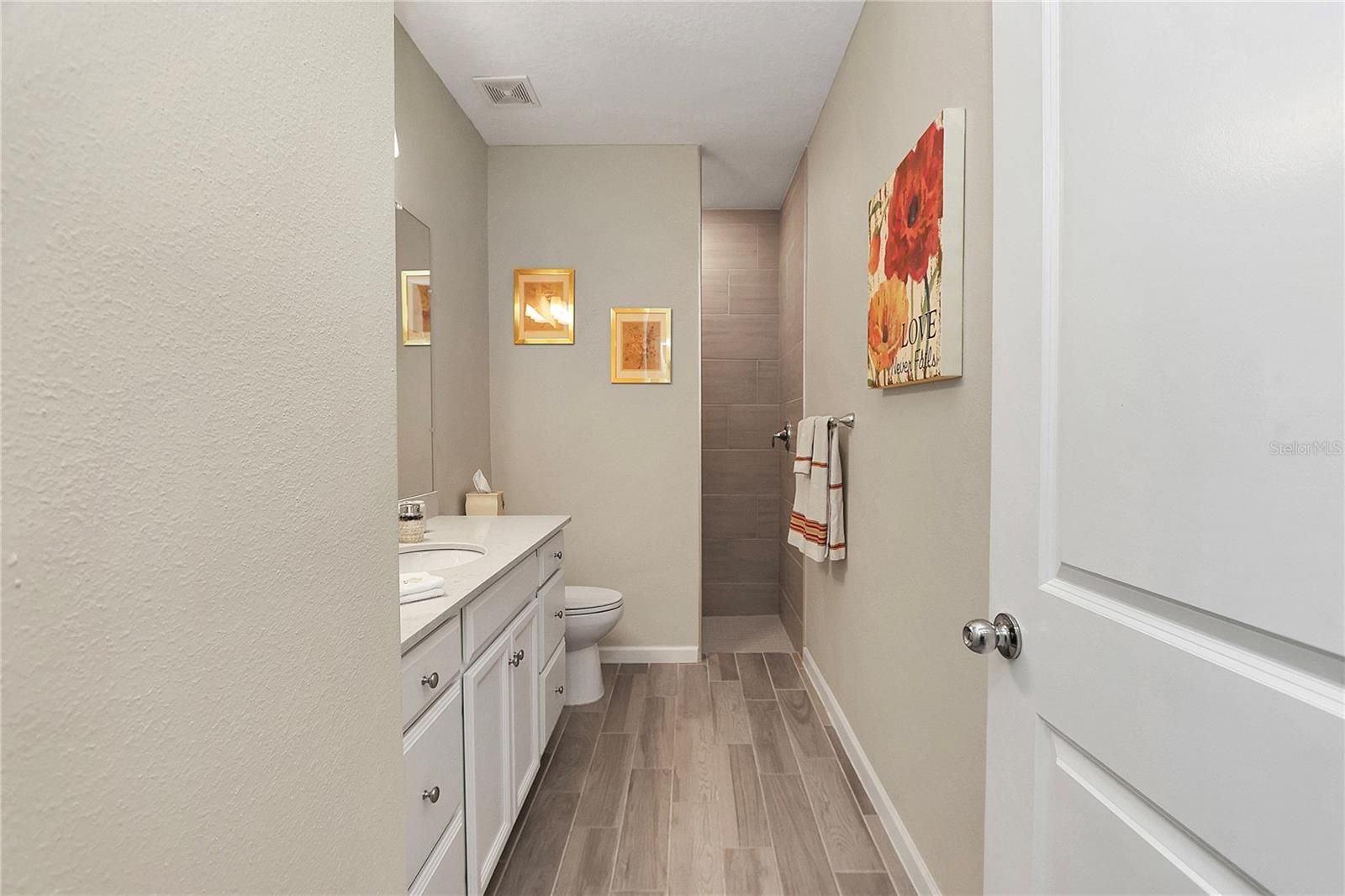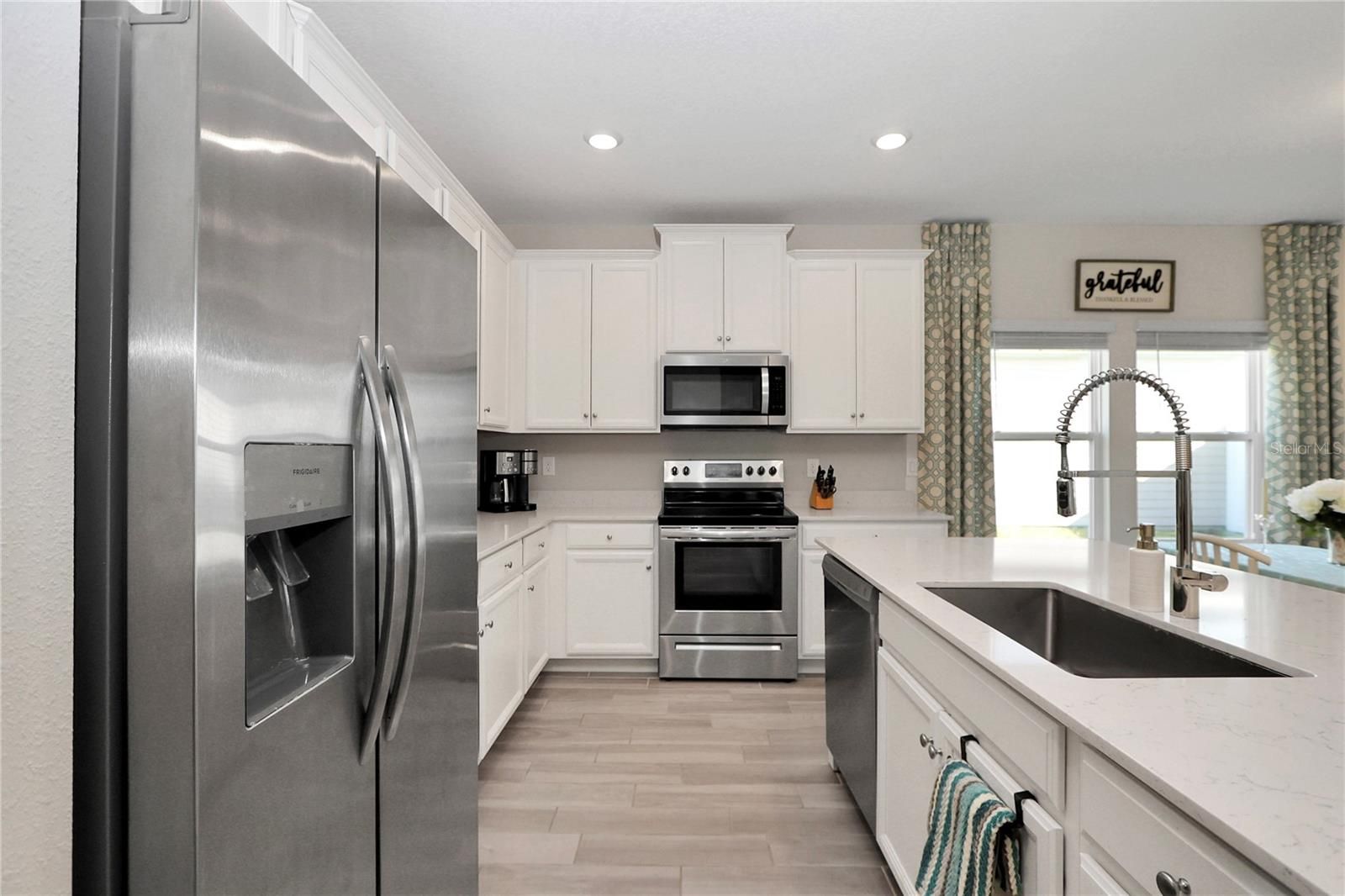 This beautifully upgraded former model home combines modern elegance with everyday comfort, offering the perfect balance of style, function, and designer finishes. From the moment you step inside, you’re welcomed by stunning 42-inch white cabinets with crown molding, sleek quartz countertops, and a spacious island—an ideal setting for entertaining and gathering. A rolling wall of glass doors creates a seamless transition to the covered, screened lanai, where you can relax and unwind. Inside, wood-inspired tile flows throughout the main living areas, adding warmth and a sophisticated touch. With three generously sized bedrooms, a den, and two full bathrooms, there’s plenty of space for both relaxation and privacy. The primary suite serves as a true retreat, featuring a large closet, dual vanities, and an expansive walk-in shower. Thoughtful upgrades by the seller further elevate the home, including soft light gray interior paint. The exterior is equally impressive, with beautiful curb appeal. Close to the Amenities center. Residents of the community enjoy a covered pavilion, resort-style pool, and recreational amenities such as bocce, pickleball, and shuffleboard—perfect for an active and social lifestyle. Ideally located near shopping and dining, and just 15 minutes from the renowned World Equestrian Center, this home offers both convenience and a vibrant, upscale living experience.