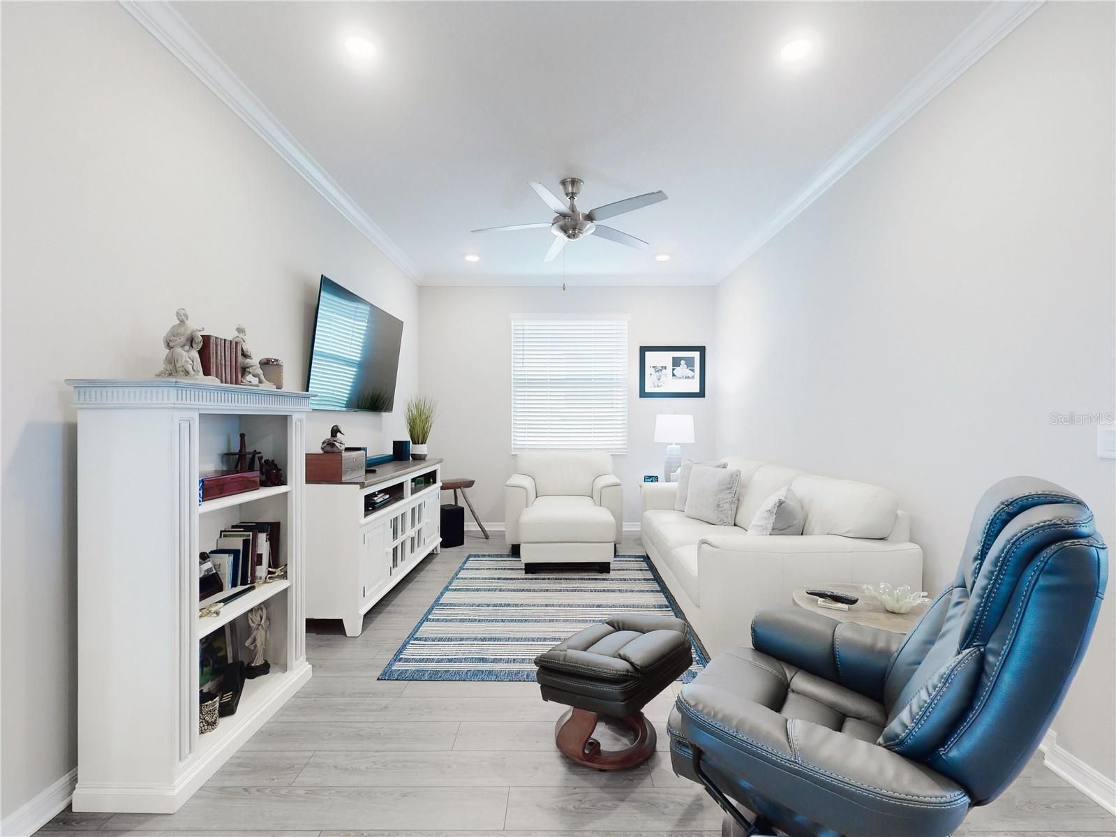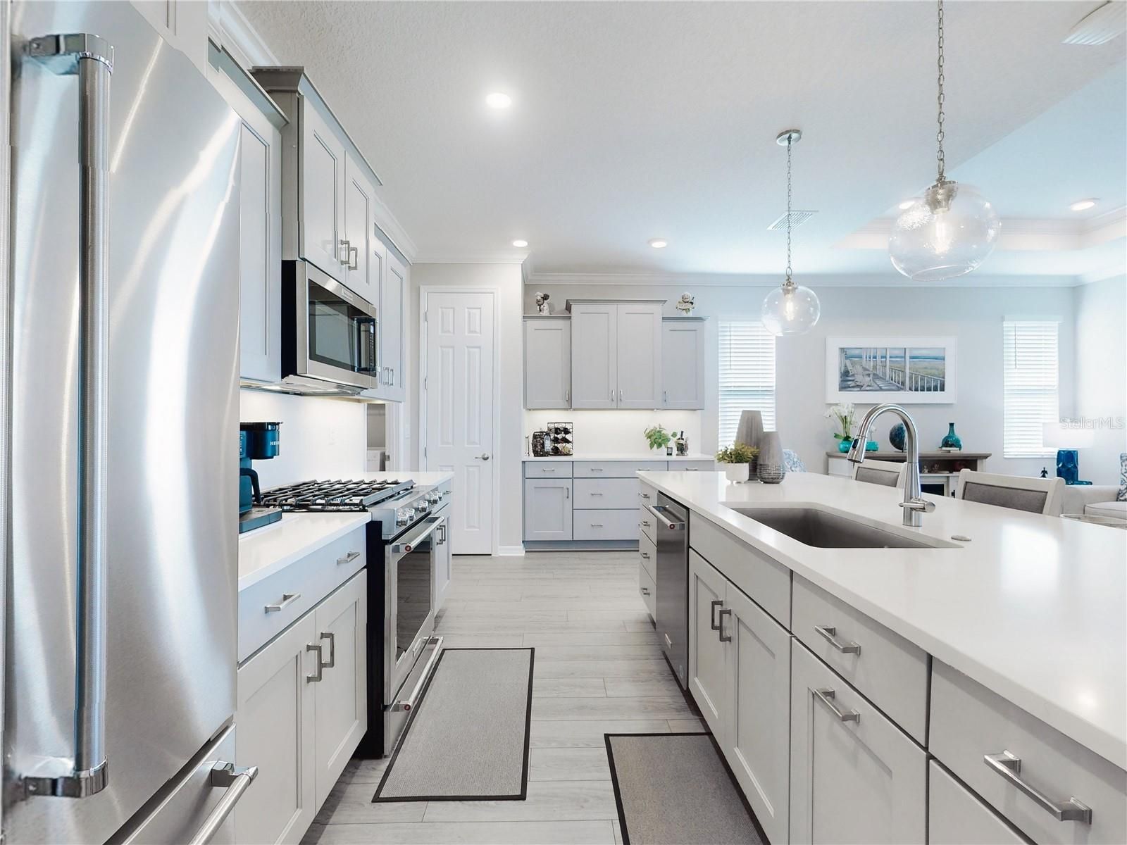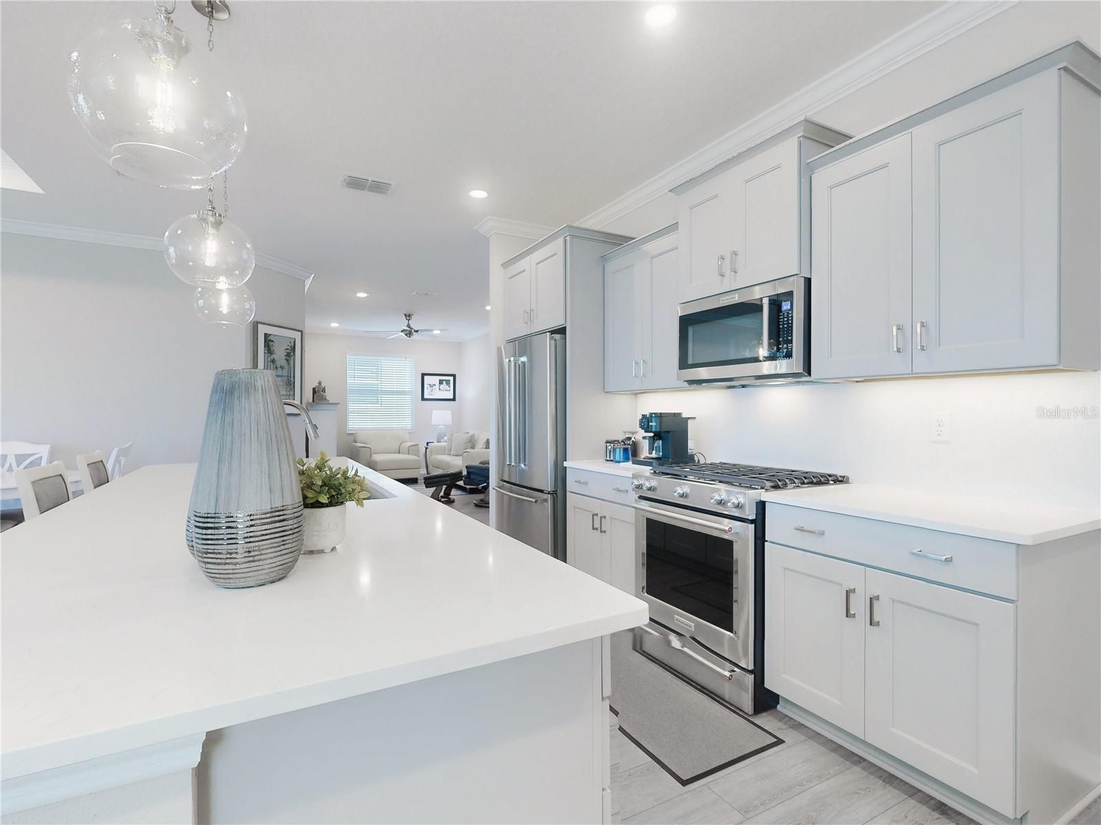 Discover refined living in this beautifully enhanced Ginger model home located in the highly desirable Weybourne Landing community. This residence offers $74,000 in premium upgrades, exceptional blend of comfort, style, and functionality, featuring 2 bedrooms, 2 bathrooms, and a flex room ideal for a home office, craft space, or guest suite. Home offers window shades with 2" cordless blinds, The Great Room impresses with tray ceilings, crown molding, 8-foot interior doors, 9ft 4"ceilings throughout, and luxury vinyl plank flooring throughout, creating a seamless flow. The chef’s kitchen showcases staggerd cabinets 36-inch uppers, quartz countertops, Breakfast Bar, stone backsplash, under cabinet lighting, upgraded soft-close cabinetry, a five-burner gas range, French-door counter-depth refrigerator, Kitchen upgraded with Kitchen Aid stainless steel appliances. The Primary Suite offers a private retreat, custom closet system, and a spa-inspired bathroom featuring a quartz dual vanity with oval undermount sinks and an upgraded walk-in shower with built-in seat. The guest bedroom and secondary bath offers a walk-in shower to provide both comfort and style for family or visitors. Relax and entertain year-round in the enclosed, covered, and screened lanai with a 24-inch masonry knee wall offering privacy and comfort. Lanai also offers natural gas to outside grill. Additional highlights include 2 ft widened driveway to corner of garage which adds storage or workspace, cascade windows, garage door with outside coded garage door opener, water softener. Interior laundry room with cabinetry, washer and dryer (1yr old is included). Premier Lighting, This property offers a serene backyard setting with no neighboring homes behind, backing to a natural dry pond area that enhances privacy and openness, added features, irrigation system, ring door bell. This home is truly move-in ready, showcasing high-end finishes and meticulous attention to detail—an exceptional opportunity to enjoy the best of Weybourne Landing living. Furniture is negotiable, golf cart is for sale, has upgraded Lithium battery with wall mounted charger (1 yr. old). Residents enjoy a clubhouse, pool, fitness center, pickleball courts, and with a Gateway Pass, access to all On Top of the World amenities.
