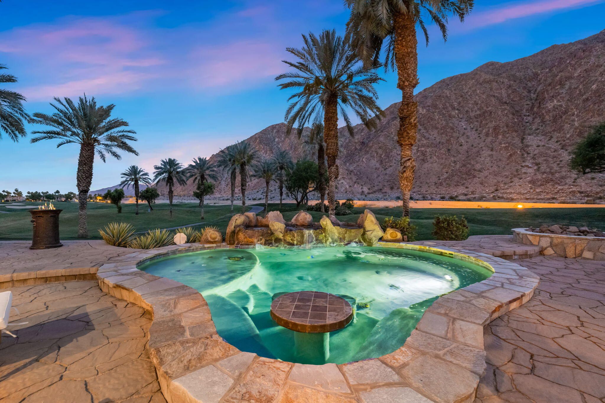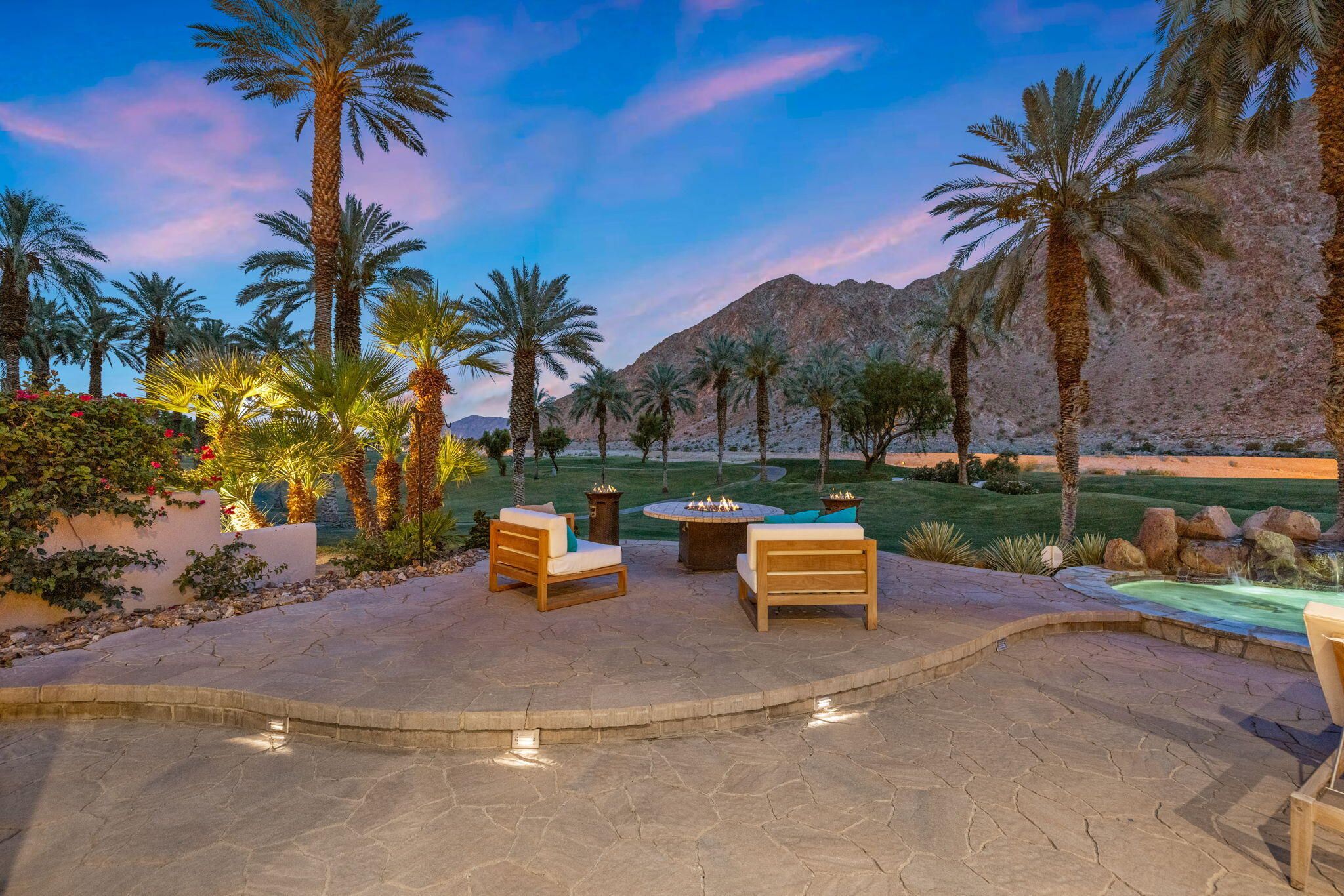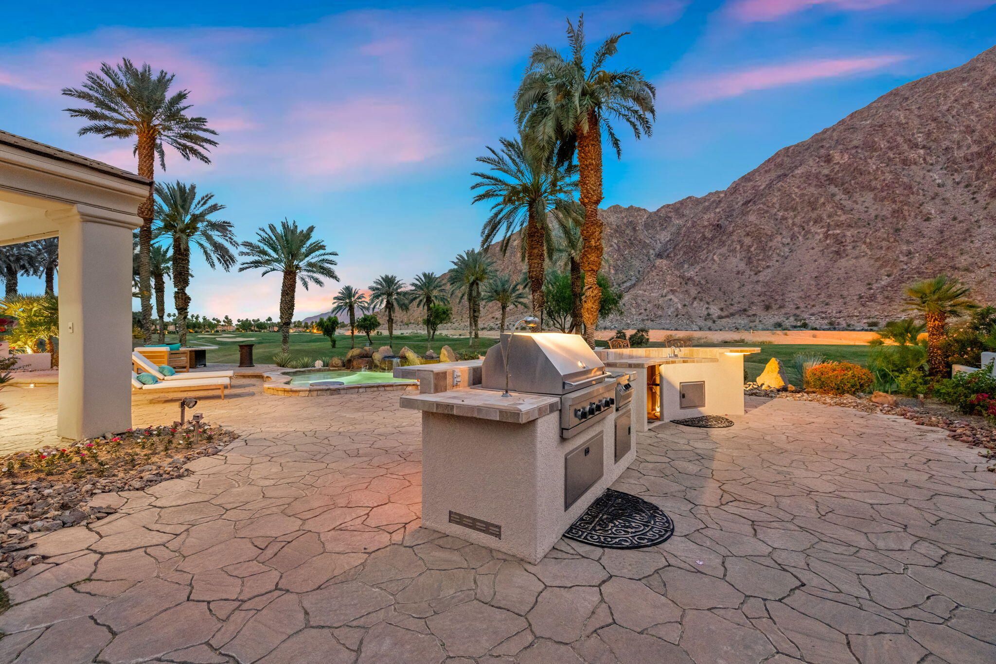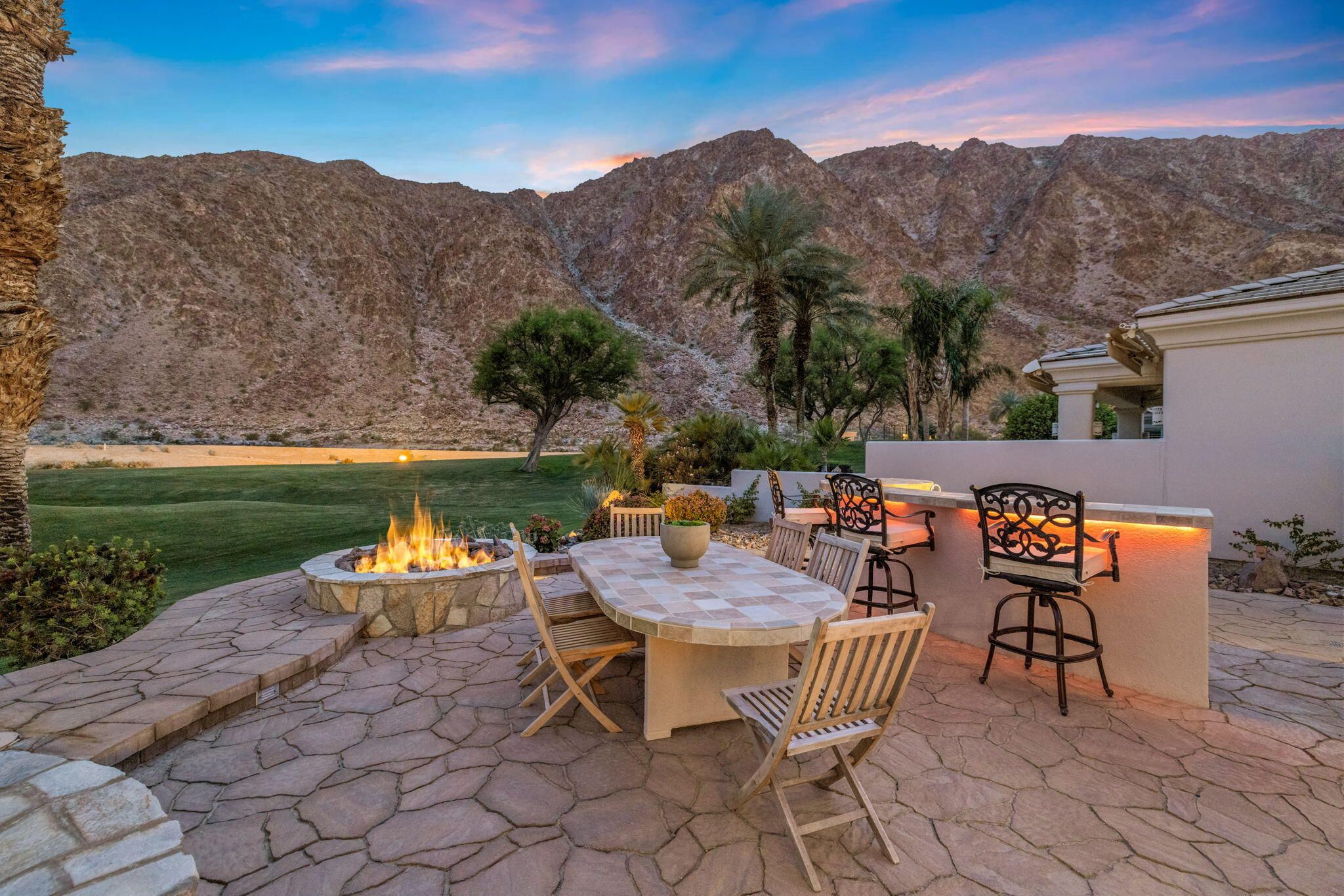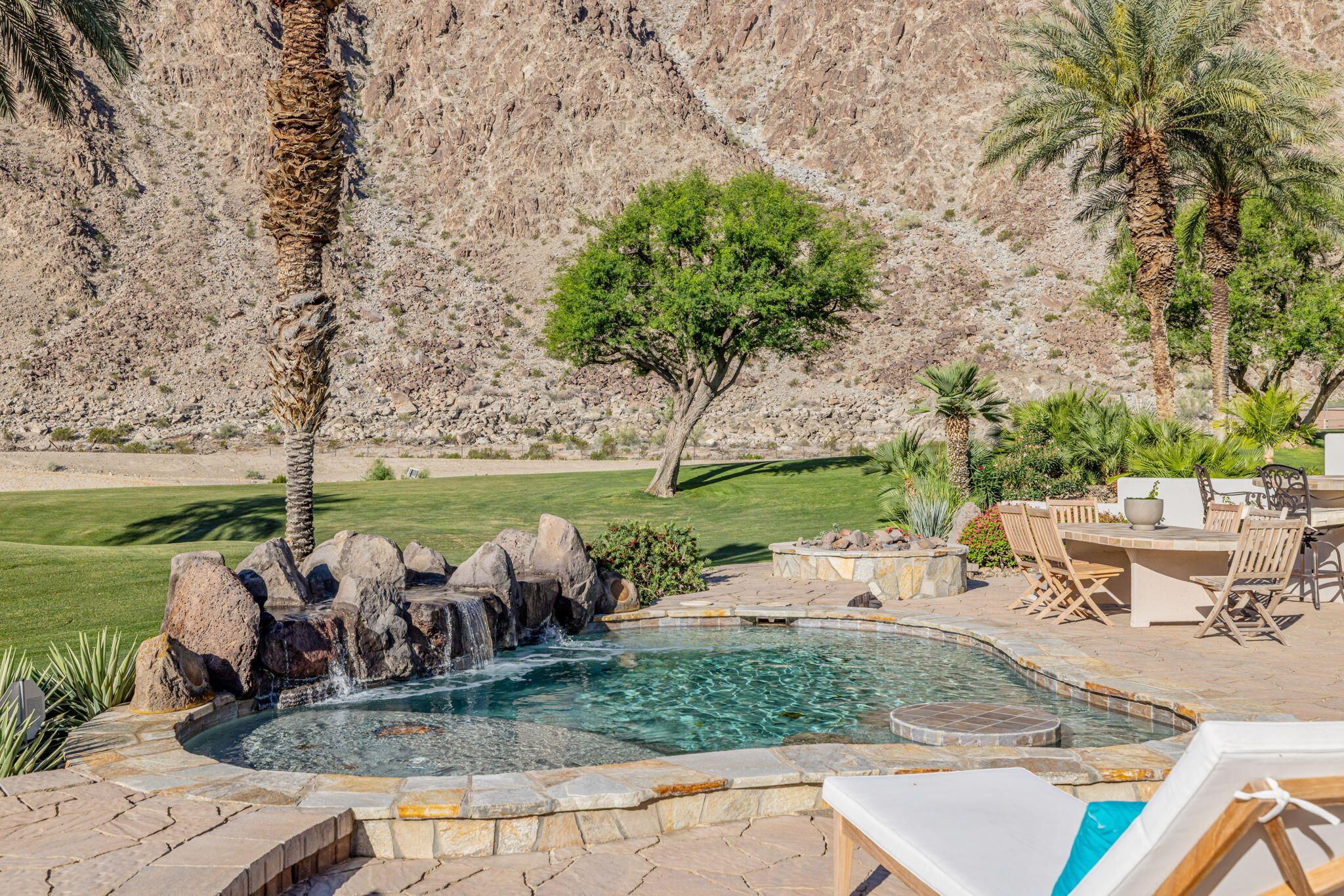 PGA Palmer Private: **OPEN This Saturday 4/18, 11:00AM-1:00PM. COME SEE!!** Do you want an upgraded fairway home with nothing behind you but stunning mountains? This is it!! Perfectly positioned near the 14th tee of the prestigious Palmer Private Course at PGA West, this property offers a rare and highly sought-after combination: wide-open fairway frontage with no homes behind you--just unobstructed mountain views that come alive at night when the Santa Rosas are beautifully illuminated. No rooftops, no back-to-back neighbors--just privacy, space, and dramatic desert scenery. The home has been thoughtfully refreshed and shows beautifully, with a clean, bright interior that is completely move-in ready. With approximately 2,800+ sq ft, 3 bedrooms and 3 bathrooms, the layout is open and functional, designed for easy indoor-outdoor living. The backyard is where this property truly shines. An oversized outdoor space features a private pool with a water feature and built-in cocktail table--perfect for relaxing or entertaining--plus a fire pit and expansive patio, all set against that incredible view. Here's the opportunity: the property comes with HOA-approved plans to build a casita, allowing you to create a 4-bedroom home. Four-bedroom properties with this kind of view in PGA West typically command significantly higher prices, making this a compelling value play. Additional highlights include no cart path behind the home and minimal golf ball exposure--another rare benefit for a fairway property. Located within the guard-gated PGA West community, offering world-class golf, tennis, dining, and resort-style living. Views. Privacy. Upside. Opportunity. Don't miss it!