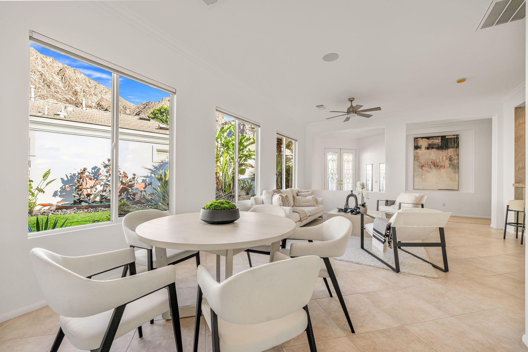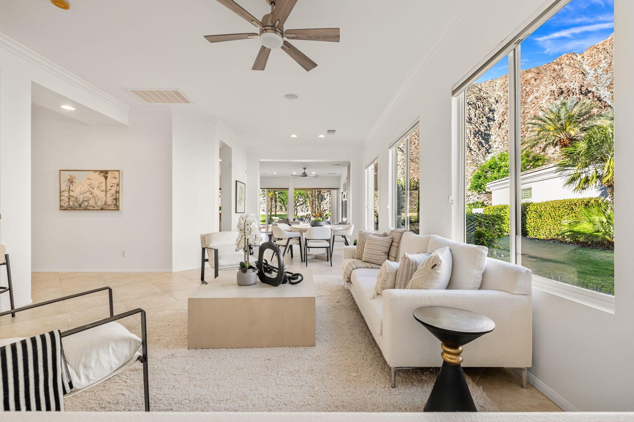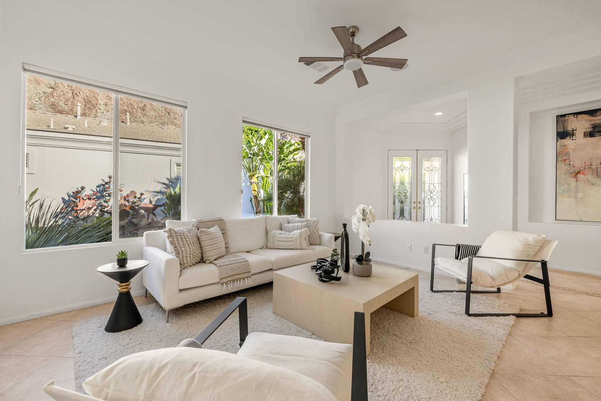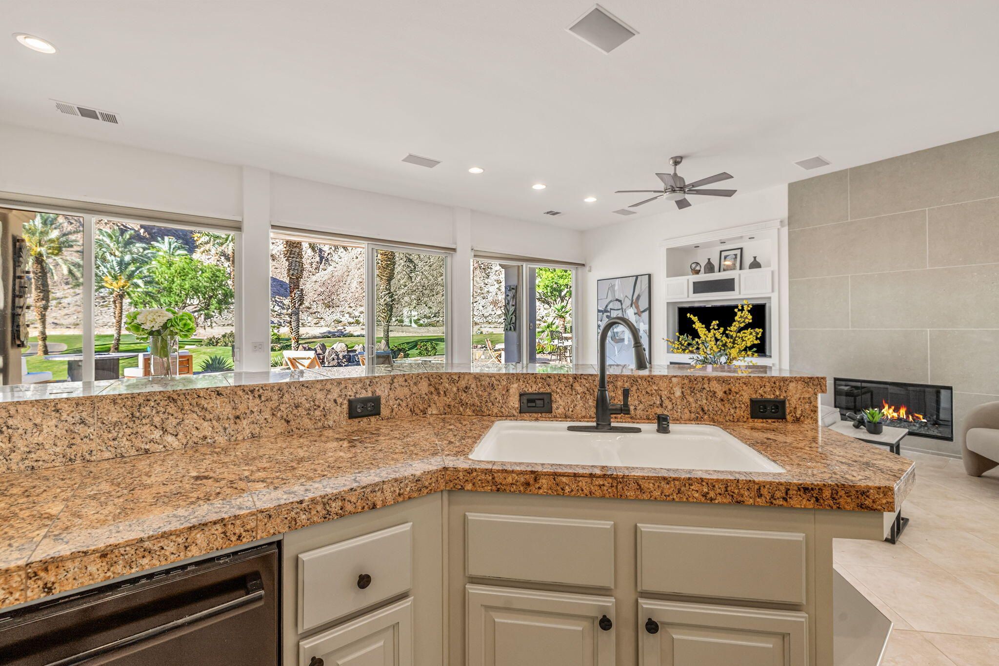 PGA Palmer Private: **OPEN This Saturday 4/18, 11:00AM-1:00PM. COME SEE!!** Do you want an upgraded fairway home with nothing behind you but stunning mountains? This is it!! Perfectly positioned near the 14th tee of the prestigious Palmer Private Course at PGA West, this property offers a rare and highly sought-after combination: wide-open fairway frontage with no homes behind you--just unobstructed mountain views that come alive at night when the Santa Rosas are beautifully illuminated. No rooftops, no back-to-back neighbors--just privacy, space, and dramatic desert scenery. The home has been thoughtfully refreshed and shows beautifully, with a clean, bright interior that is completely move-in ready. With approximately 2,800+ sq ft, 3 bedrooms and 3 bathrooms, the layout is open and functional, designed for easy indoor-outdoor living. The backyard is where this property truly shines. An oversized outdoor space features a private pool with a water feature and built-in cocktail table--perfect for relaxing or entertaining--plus a fire pit and expansive patio, all set against that incredible view. Here's the opportunity: the property comes with HOA-approved plans to build a casita, allowing you to create a 4-bedroom home. Four-bedroom properties with this kind of view in PGA West typically command significantly higher prices, making this a compelling value play. Additional highlights include no cart path behind the home and minimal golf ball exposure--another rare benefit for a fairway property. Located within the guard-gated PGA West community, offering world-class golf, tennis, dining, and resort-style living. Views. Privacy. Upside. Opportunity. Don't miss it!