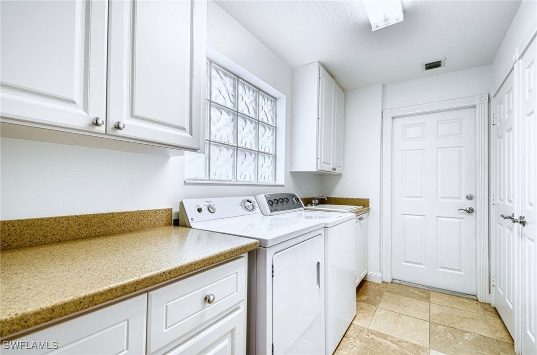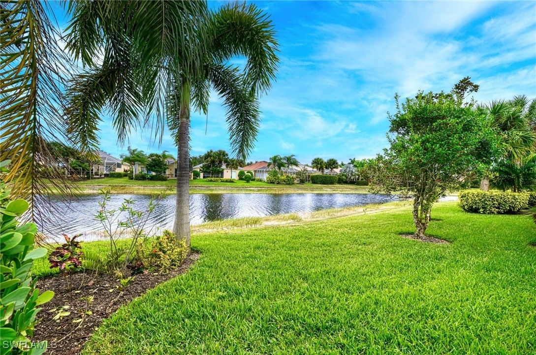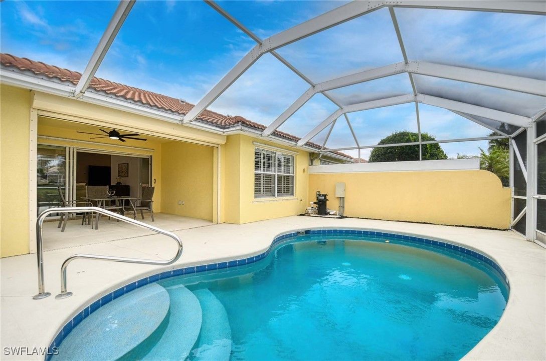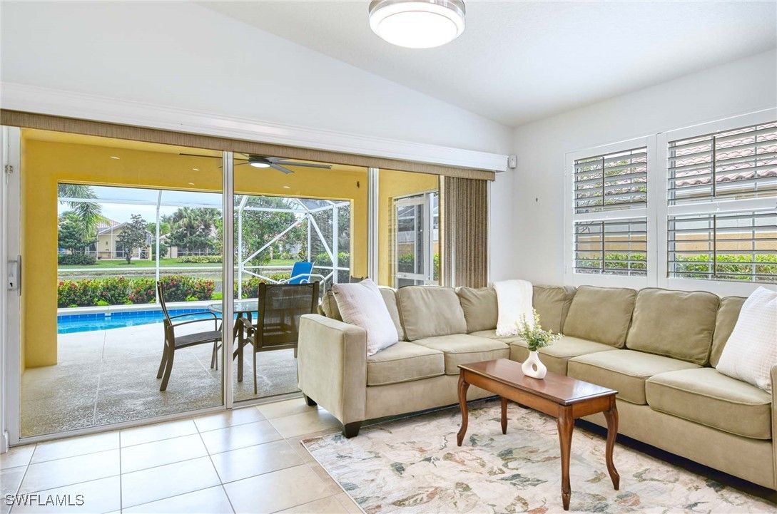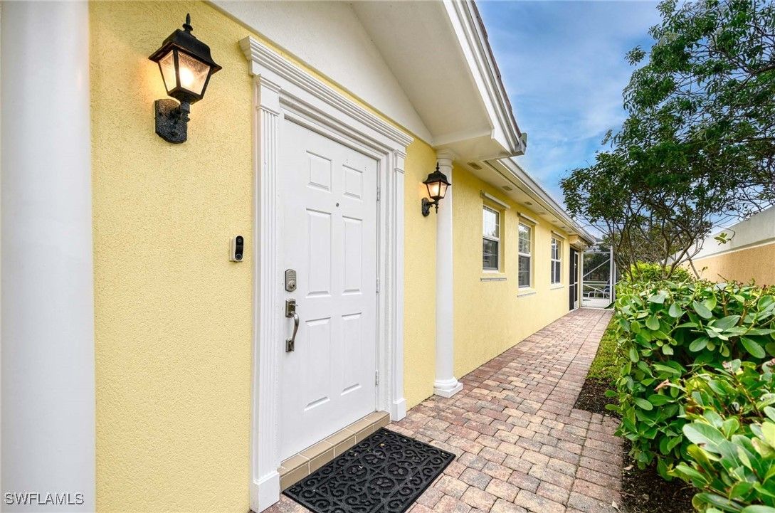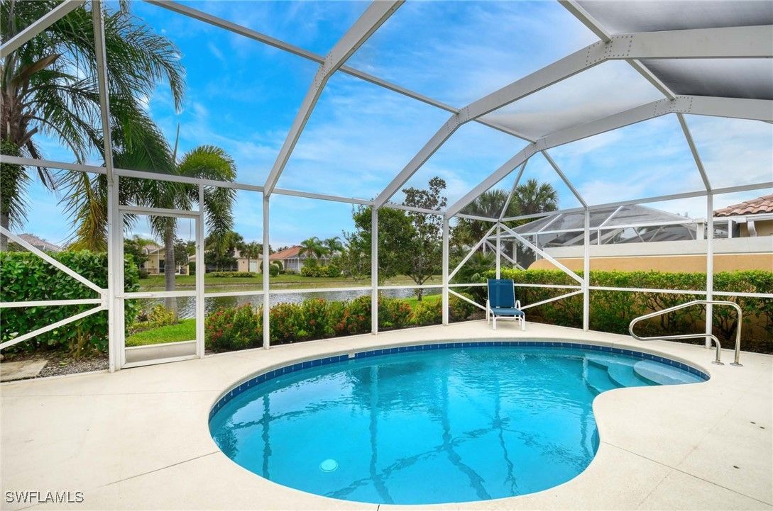 MOVE-IN READY! This Divosta built, solid-poured concrete attached villa is a Capri model with southern exposure on the lake with a pool and has been meticulously maintained. Newer roof (2020), HVAC (2020), water heater (2024), pool pump and filter (2023) all new screens and bolts in pool cage (2024), epoxy garage floor, newer stainless steel appliances, plantation shutters throughout, built-in closets and wall unit in living room, tile throughout, central vac, electric hurricane shutters on lanai and manual shutters throughout. All in a prime location! Just steps to the walking path and bridges that lead to the wonderful Town Center. Enjoy sunset walks around the big lake every night and all of the amenities that Verona Walk offers, including 24-hour guard gated entry, gas station, post office, cafe, ice cream shop, hair salon, har-tru tennis courts, pickleball courts, basketball court, resort-style lagoon pool, lap pool, fitness facility, tot lot, miles and miles of walking paths, and a beautiful clubhouse with countless social activities. Conveniently located between the beautiful beaches of Marco Island and Naples and minutes to shops and dining, Old Naples and quick I-75 access. The low HOA fees provide a care-free lifesyle and include landscaping, irrigation, cable and wi-fi. No flood insurance required! Paradise found!