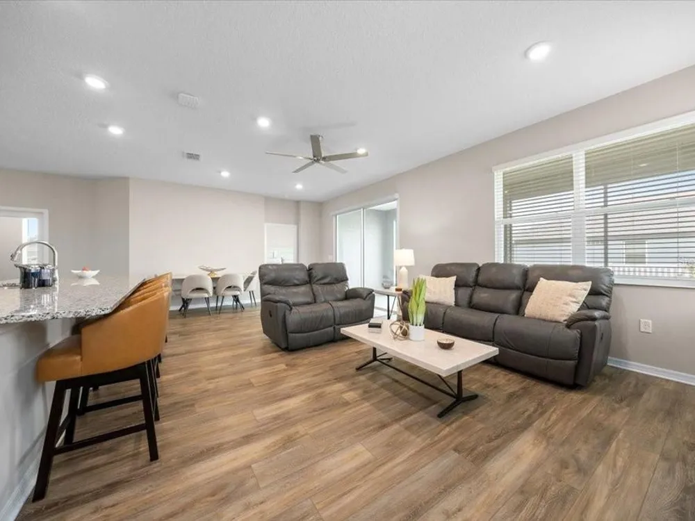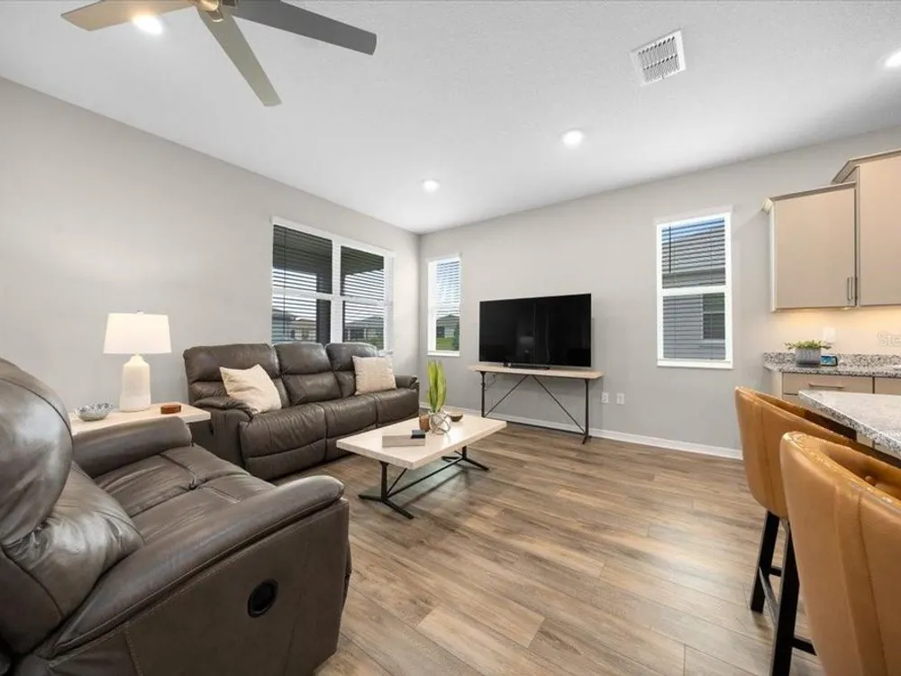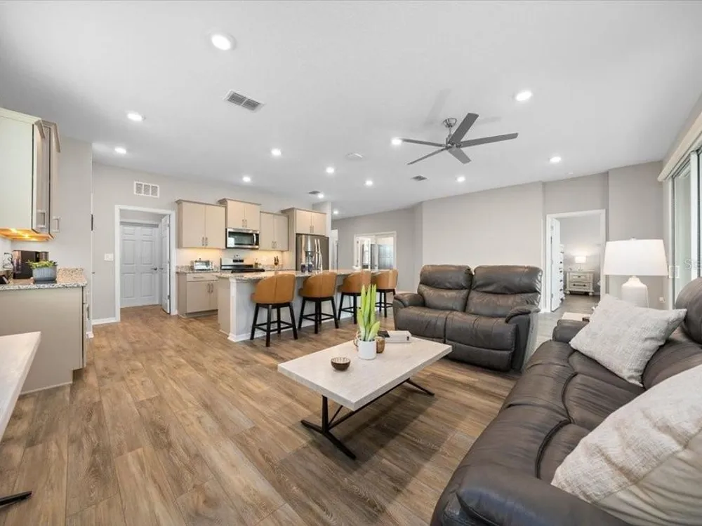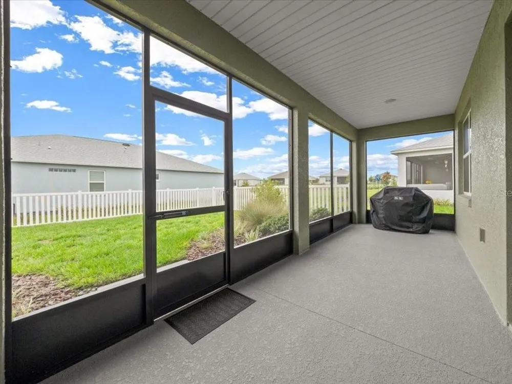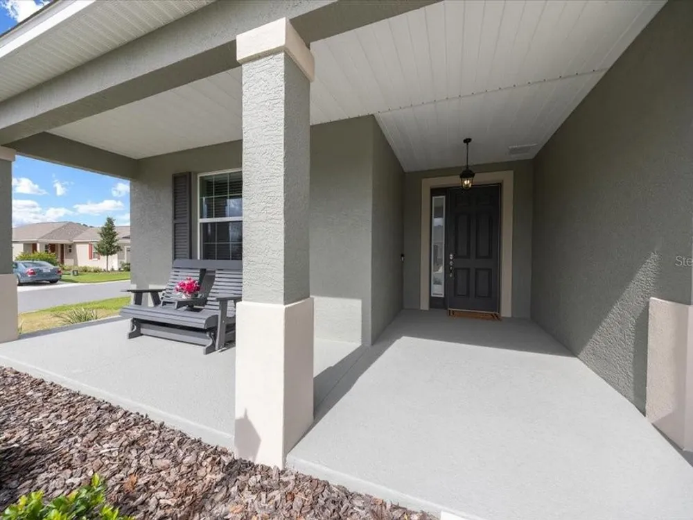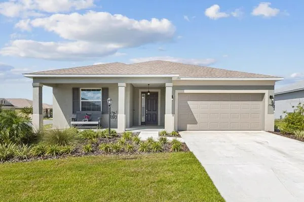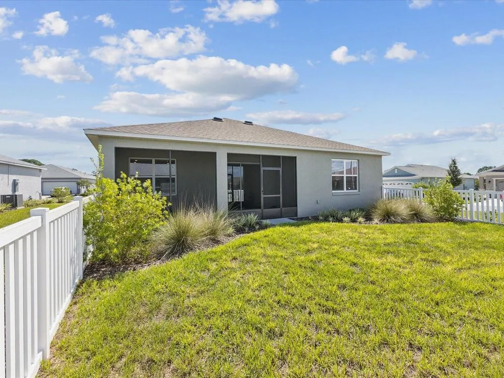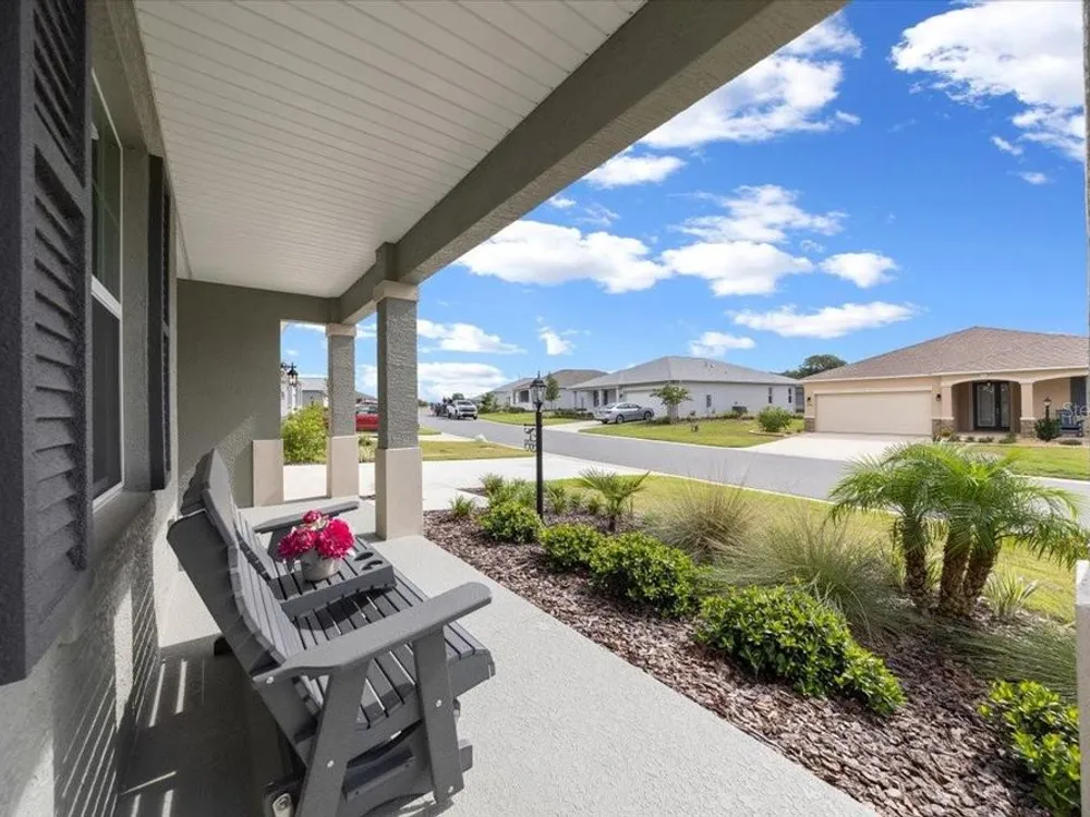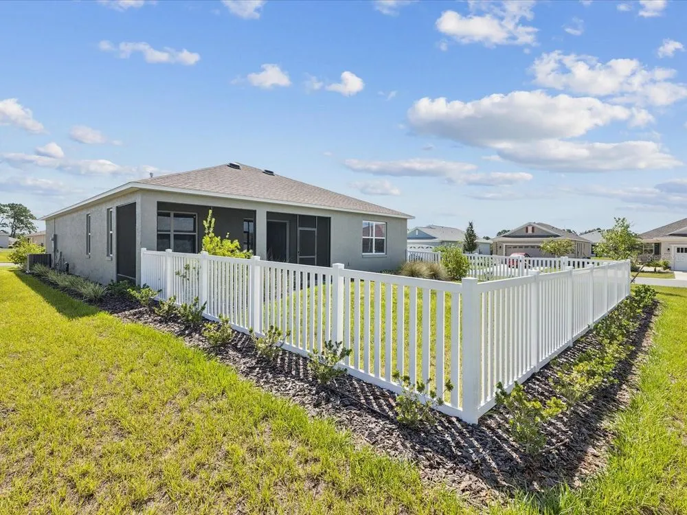 Welcome to this pristine, recently built home located in the highly sought-after 55+ active gated community of Weybourne Landing in On Top of the World. Situated on a large corner lot with a fully fenced backyard, this home offers privacy, space, and modern comfort. Featuring 2 bedrooms, 2 bathrooms, a bonus room with double glass doors, and a 2-car garage, this home is designed with both function and style in mind. Step onto the cozy front porch, then into a bright, spacious foyer with luxury vinyl plank flooring throughout. The guest bedroom and full hallway bathroom (with a tub/shower combo) are located at the front of the home. The primary suite is positioned at the rear for added privacy and includes an en-suite bath with dual sinks, a walk-in shower with bench seating, and a generous walk-in closet. The open-concept living area is perfect for entertaining, offering bar seating and a modern kitchen countertops, soft-close cabinets, and a closet pantry. The laundry room includes added storage cabinets and is plumbed for a sink. Additional upgrades include a water softener, epoxy-coated garage flooring, and built-in storage racks and cabinets in the garage. Residents of Weybourne Landing enjoy resort-style amenities, including a clubhouse, heated pool, ballroom, The Club at Candler Hills Restaurant, fitness center with classes, outdoor pavilion with BBQ area, pickleball courts, mini golf, dog park, meeting rooms, and more. Conveniently located close to shopping, dining, medical facilities, and everything you need for easy, active living.