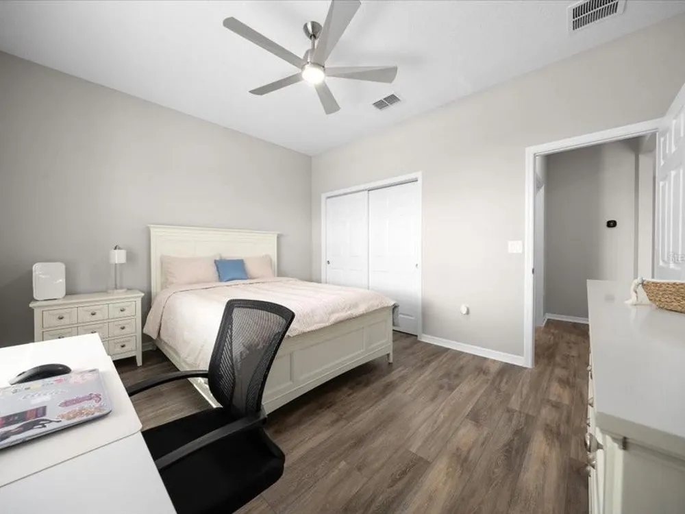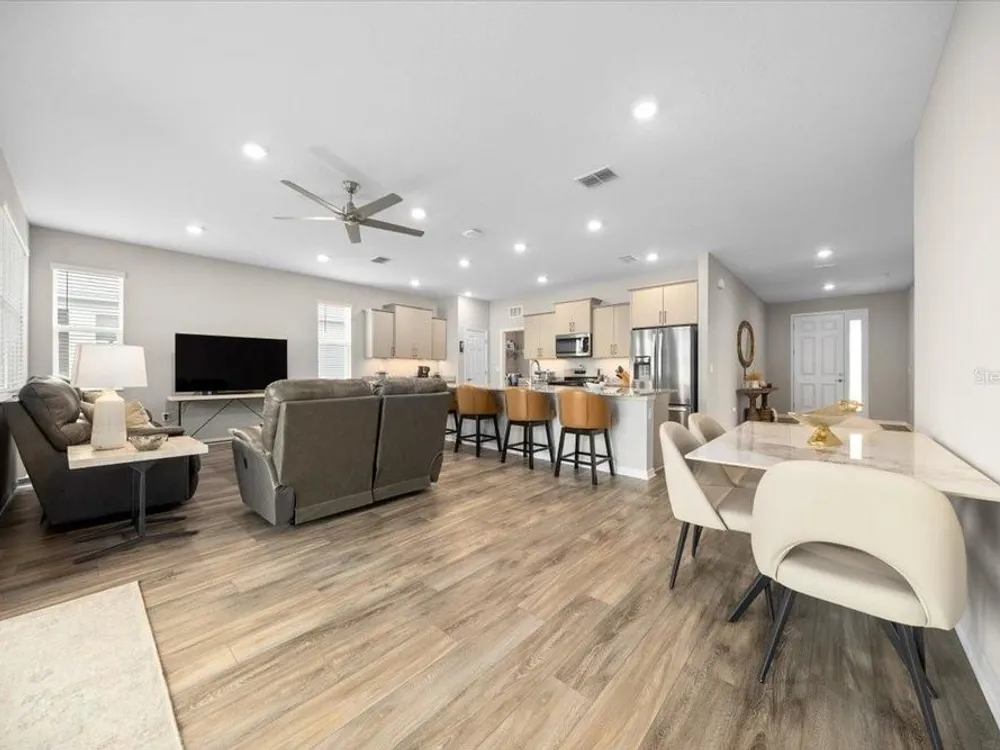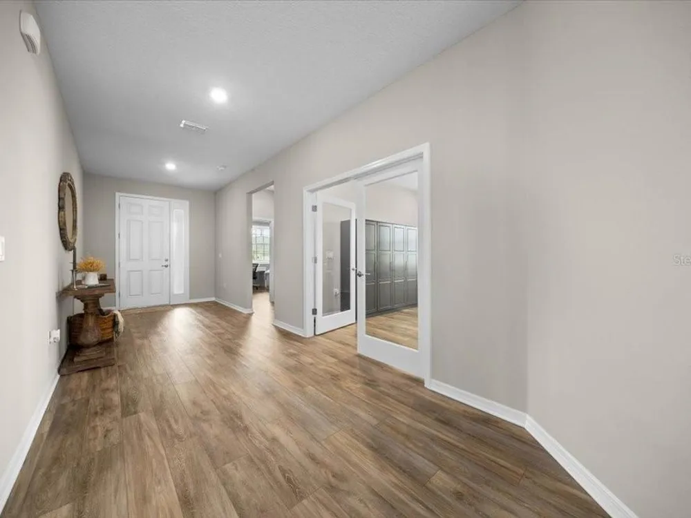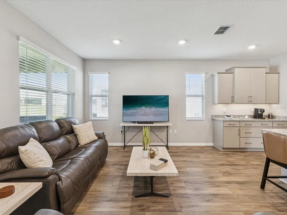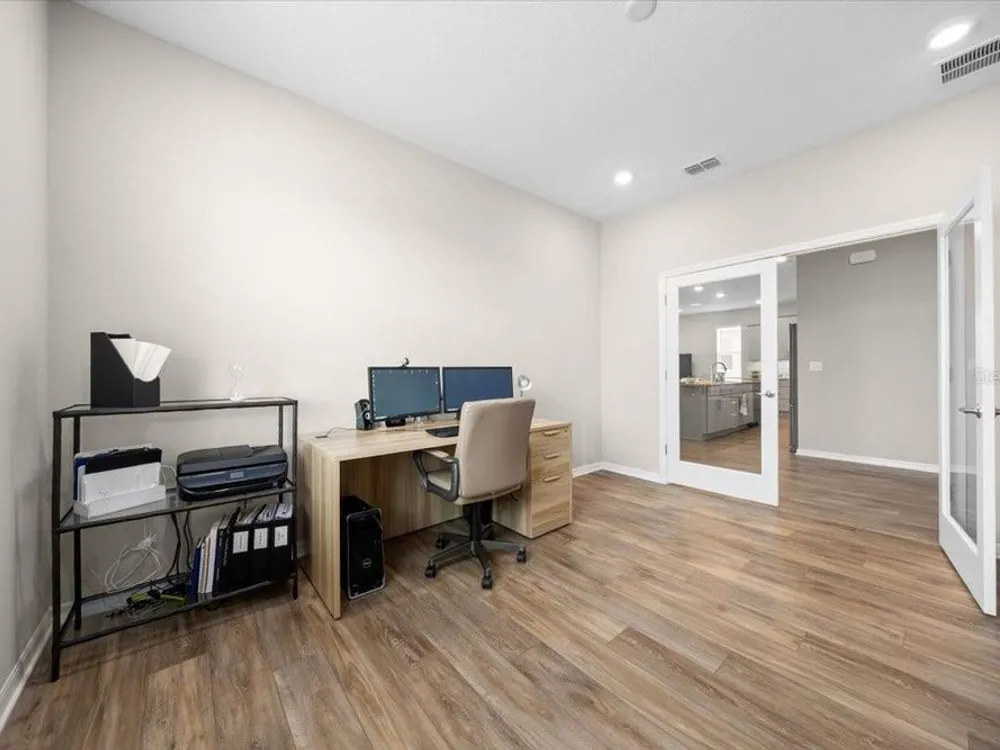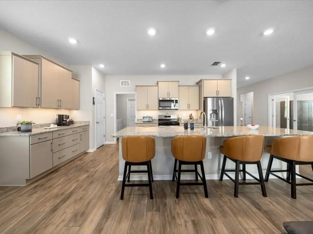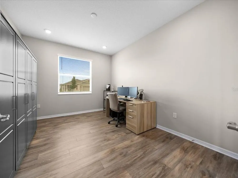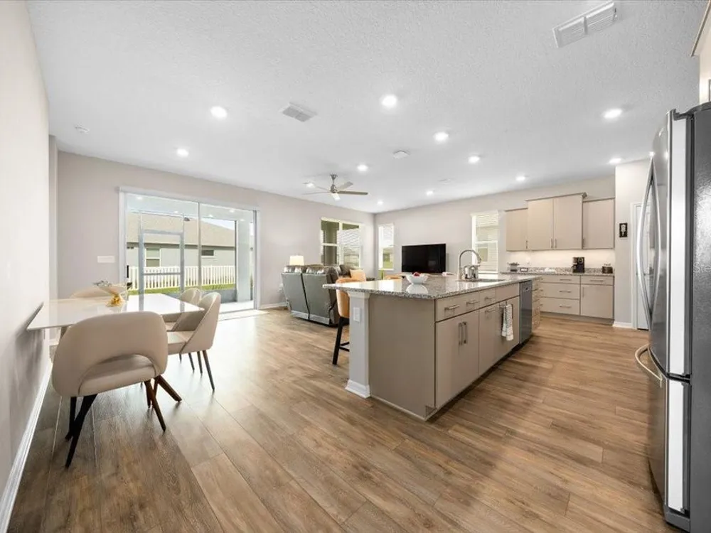 Welcome to this pristine, recently built home located in the highly sought-after 55+ active gated community of Weybourne Landing in On Top of the World. Situated on a large corner lot with a fully fenced backyard, this home offers privacy, space, and modern comfort. Featuring 2 bedrooms, 2 bathrooms, a bonus room with double glass doors, and a 2-car garage, this home is designed with both function and style in mind. Step onto the cozy front porch, then into a bright, spacious foyer with luxury vinyl plank flooring throughout. The guest bedroom and full hallway bathroom (with a tub/shower combo) are located at the front of the home. The primary suite is positioned at the rear for added privacy and includes an en-suite bath with dual sinks, a walk-in shower with bench seating, and a generous walk-in closet. The open-concept living area is perfect for entertaining, offering bar seating and a modern kitchen countertops, soft-close cabinets, and a closet pantry. The laundry room includes added storage cabinets and is plumbed for a sink. Additional upgrades include a water softener, epoxy-coated garage flooring, and built-in storage racks and cabinets in the garage. Residents of Weybourne Landing enjoy resort-style amenities, including a clubhouse, heated pool, ballroom, The Club at Candler Hills Restaurant, fitness center with classes, outdoor pavilion with BBQ area, pickleball courts, mini golf, dog park, meeting rooms, and more. Conveniently located close to shopping, dining, medical facilities, and everything you need for easy, active living.