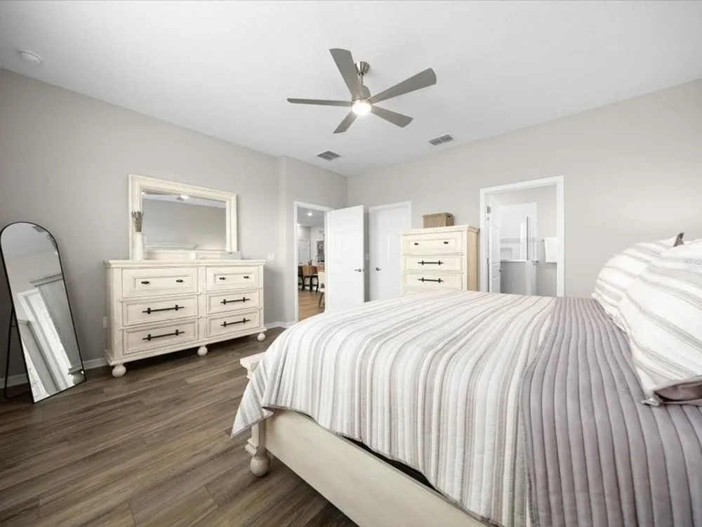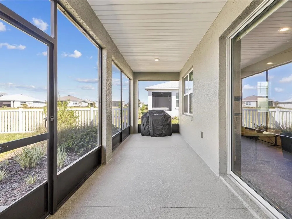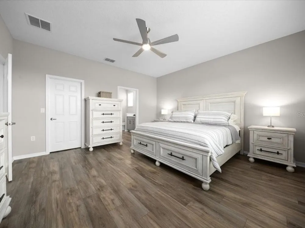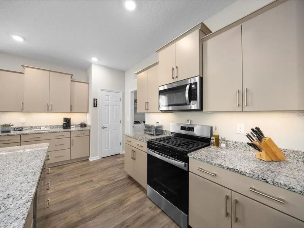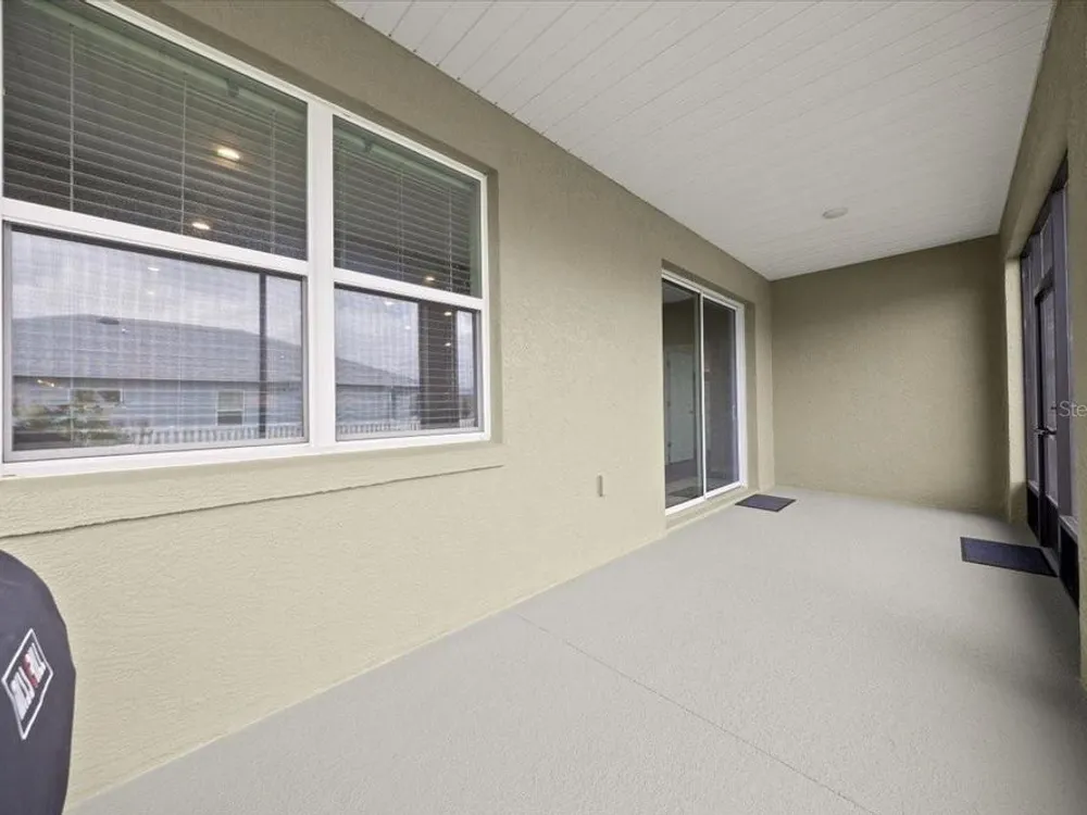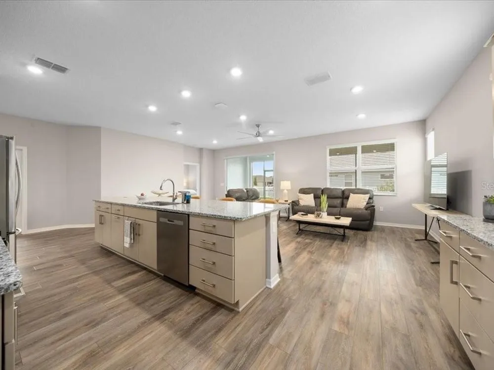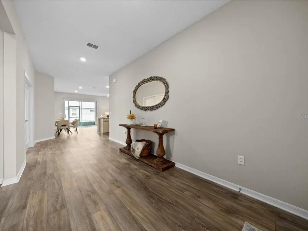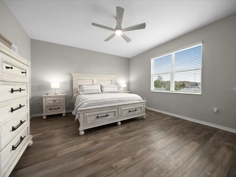 Welcome to this pristine, recently built home located in the highly sought-after 55+ active gated community of Weybourne Landing in On Top of the World. Situated on a large corner lot with a fully fenced backyard, this home offers privacy, space, and modern comfort. Featuring 2 bedrooms, 2 bathrooms, a bonus room with double glass doors, and a 2-car garage, this home is designed with both function and style in mind. Step onto the cozy front porch, then into a bright, spacious foyer with luxury vinyl plank flooring throughout. The guest bedroom and full hallway bathroom (with a tub/shower combo) are located at the front of the home. The primary suite is positioned at the rear for added privacy and includes an en-suite bath with dual sinks, a walk-in shower with bench seating, and a generous walk-in closet. The open-concept living area is perfect for entertaining, offering bar seating and a modern kitchen countertops, soft-close cabinets, and a closet pantry. The laundry room includes added storage cabinets and is plumbed for a sink. Additional upgrades include a water softener, epoxy-coated garage flooring, and built-in storage racks and cabinets in the garage. Residents of Weybourne Landing enjoy resort-style amenities, including a clubhouse, heated pool, ballroom, The Club at Candler Hills Restaurant, fitness center with classes, outdoor pavilion with BBQ area, pickleball courts, mini golf, dog park, meeting rooms, and more. Conveniently located close to shopping, dining, medical facilities, and everything you need for easy, active living.