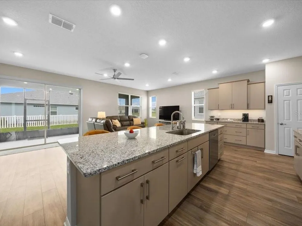 - Ceiling Fan(s), Kitchen/Family Room Combo, Open Floorplan, Main Level Primary, Solid-Wood Cabinets, Split Bedrooms, Stone Counters, Walk-In Closet(s)