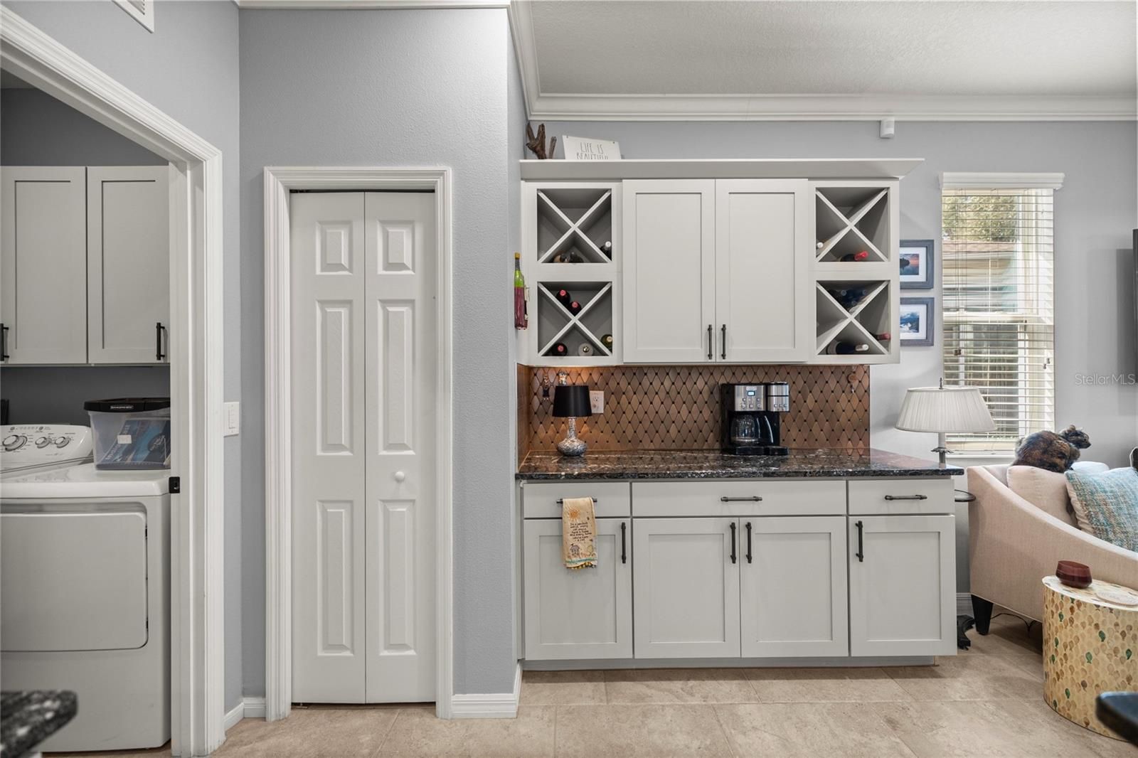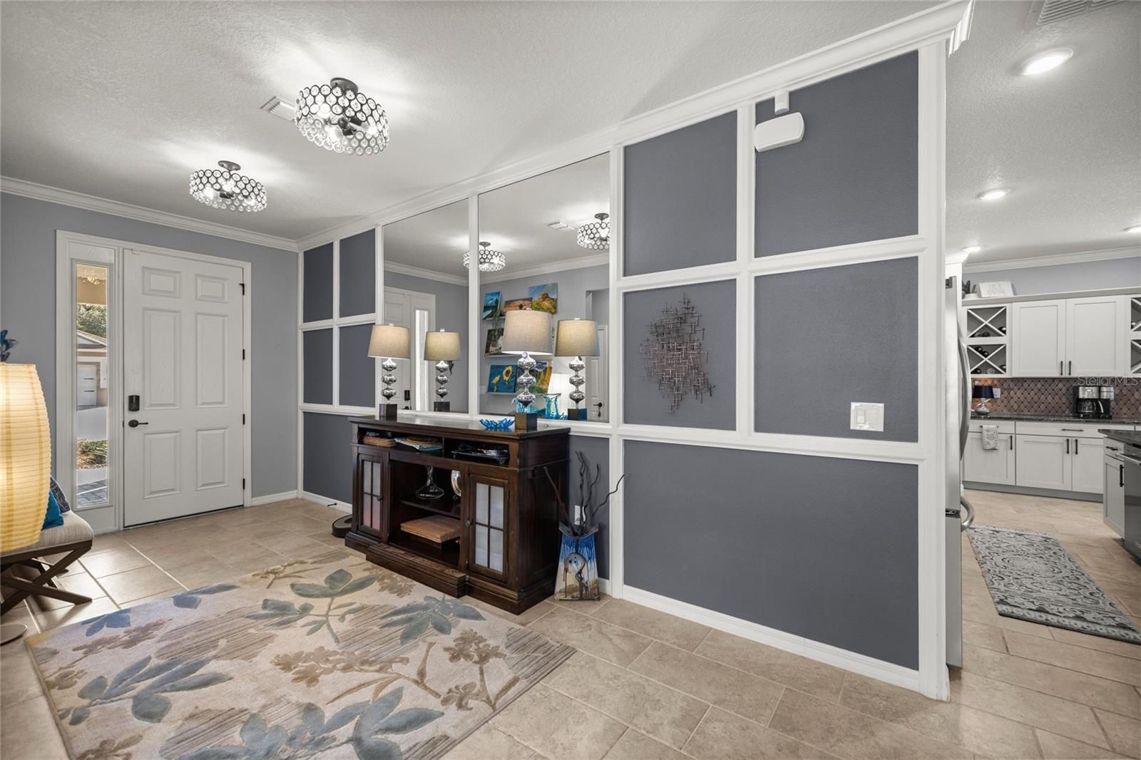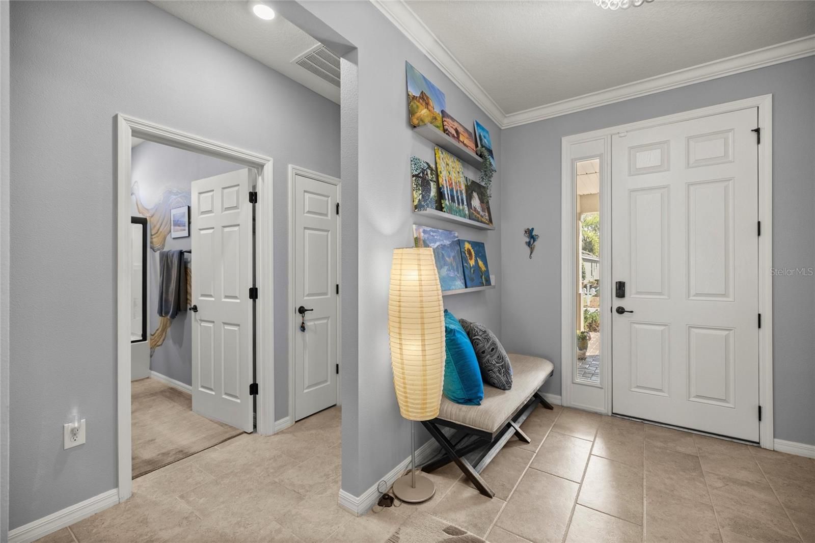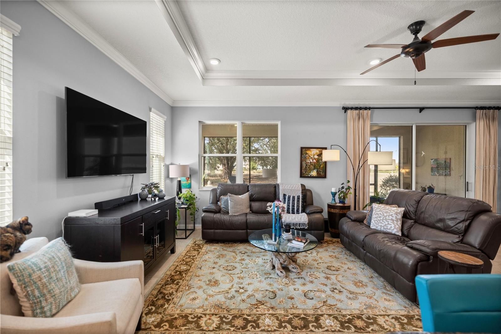 - Ceiling Fan(s), Crown Molding, High Ceilings, Kitchen/Family Room Combo, Open Floorplan, In-Wall Pest Control, Main Level Primary, Solid Surface Counters, Solid-Wood Cabinets, Thermostat, Tray Ceiling(s), Walk-In Closet(s), Window Treatments