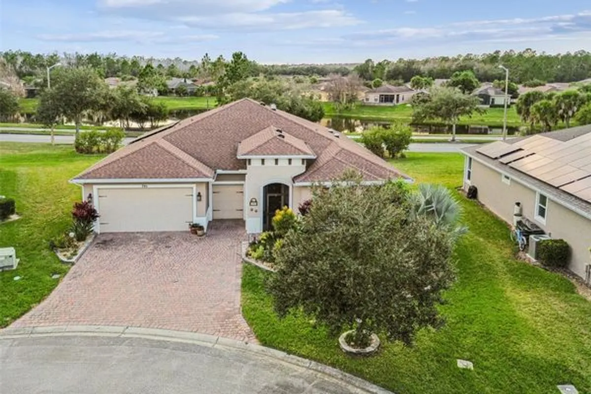 Welcome to this popular 2020 Siena model, perfectly positioned on a quiet cul-de-sac, offering exceptional privacy, custom landscaping, and tranquil water views. This beautifully maintained home also features paid solar panels, keeping electric bills under $30 per month and qualifying the property for new-home insurance discounts—a rare and valuable benefit. Inside, the spacious 3-bedroom, 2.5-bath floor plan includes a versatile den/study, ideal for a home office, hobby room, or cozy reading space. The open-concept design flows effortlessly, making the home equally suited for everyday comfort and entertaining. A screened front entry and elegant leaded glass door welcome you into the bright great room, highlighted by a tray ceiling and solar tubes that fill the space with natural light. The gourmet kitchen is a standout, featuring an eat-at bar, granite countertops, tile back splash, cook top, double ovens, and a large walk-in pantry—perfect for both casual meals and hosting gatherings. The extra-large primary suite offers a peaceful retreat with lighted crown molding and two walk-in closets. The en-suite bath includes a spacious walk-in shower and dual sinks for added comfort and convenience. Two additional guest bedrooms, each with walk-in closets, provide ample space for family and visitors. A well-appointed laundry room with custom cabinetry and a utility sink adds to the home’s thoughtful design. The 2-car garage plus golf cart garage offers abundant storage. Step out to the screened lanai and enjoy stunning sunset views over the water—an ideal setting for morning coffee or evening relaxation. Furniture is optional.With its prime location, energy efficiency, and elegant finishes throughout, this exceptional home offers both luxury and smart living and truly captures the Solivita lifestyle—don’t miss it! Solivita is a premier 55+ community, offering residents an exceptional lifestyle with state-of-the-art amenities. Enjoy a fully equipped fitness center, dance and aerobics studios, and an impressive array of recreational options including 14 heated swimming pools, two heated spas, tennis courts, pickleball courts, shuffleboard, bocce ball, billiards, and an art gallery. The community also features three on-site restaurants and two championship 18-hole golf courses. With a full calendar of activities and events, there’s always something new to explore and enjoy. This home is conveniently located near a hospital and medical office complex, shopping, dining, and a brand-new shopping center—featuring Sprouts, Outback and other popular retailers—offering the perfect balance of privacy, convenience, and an active lifestyle