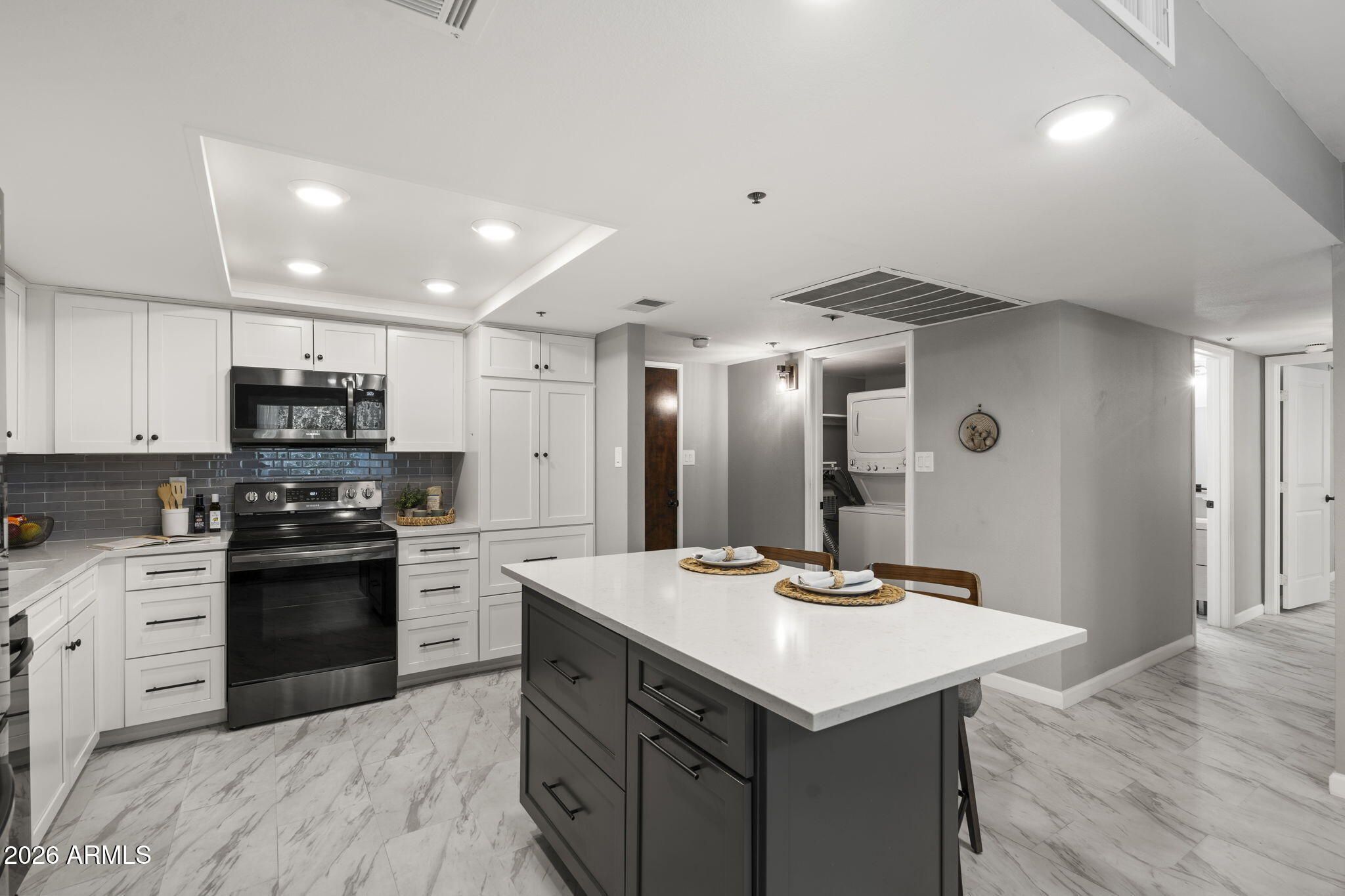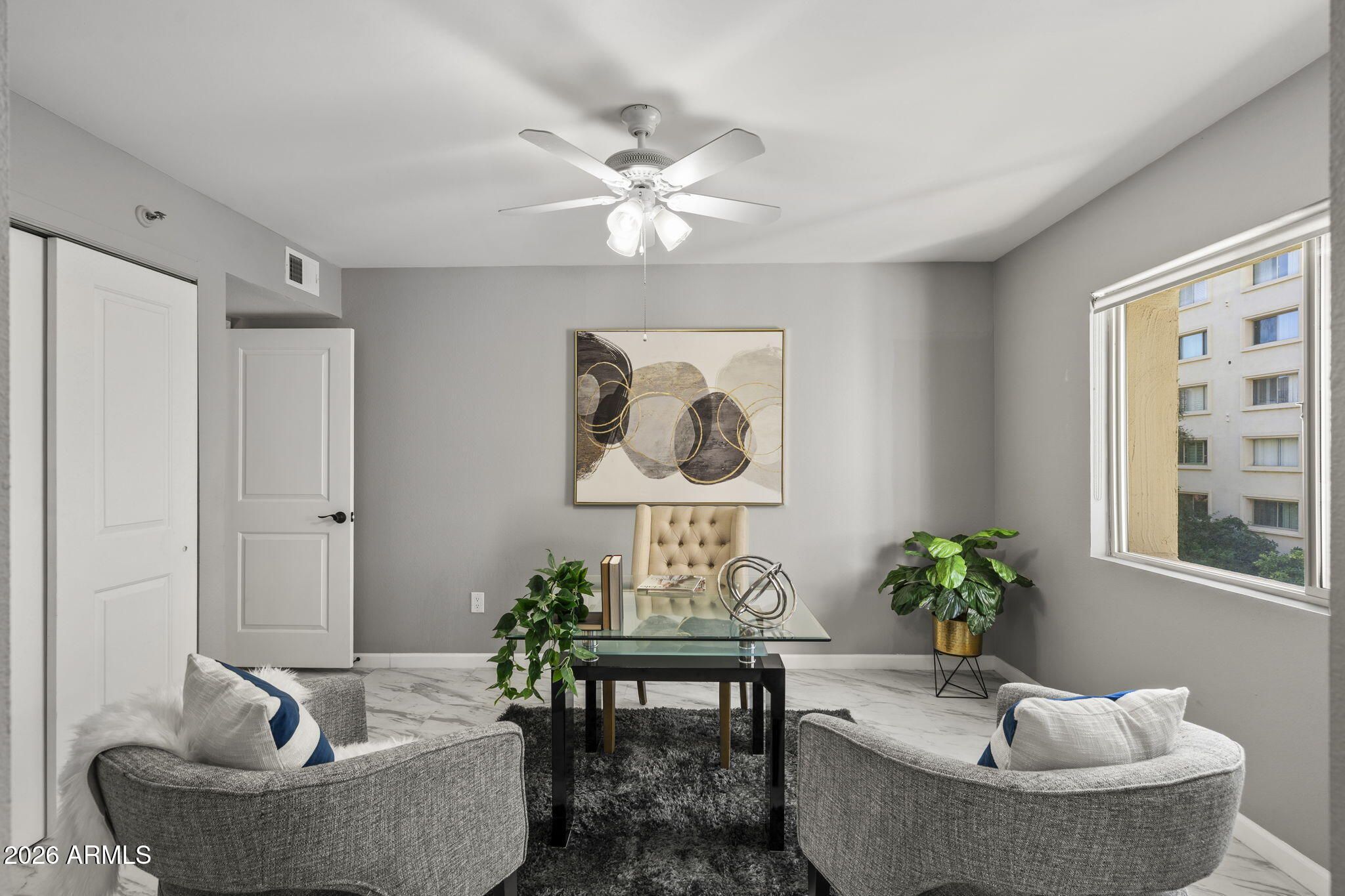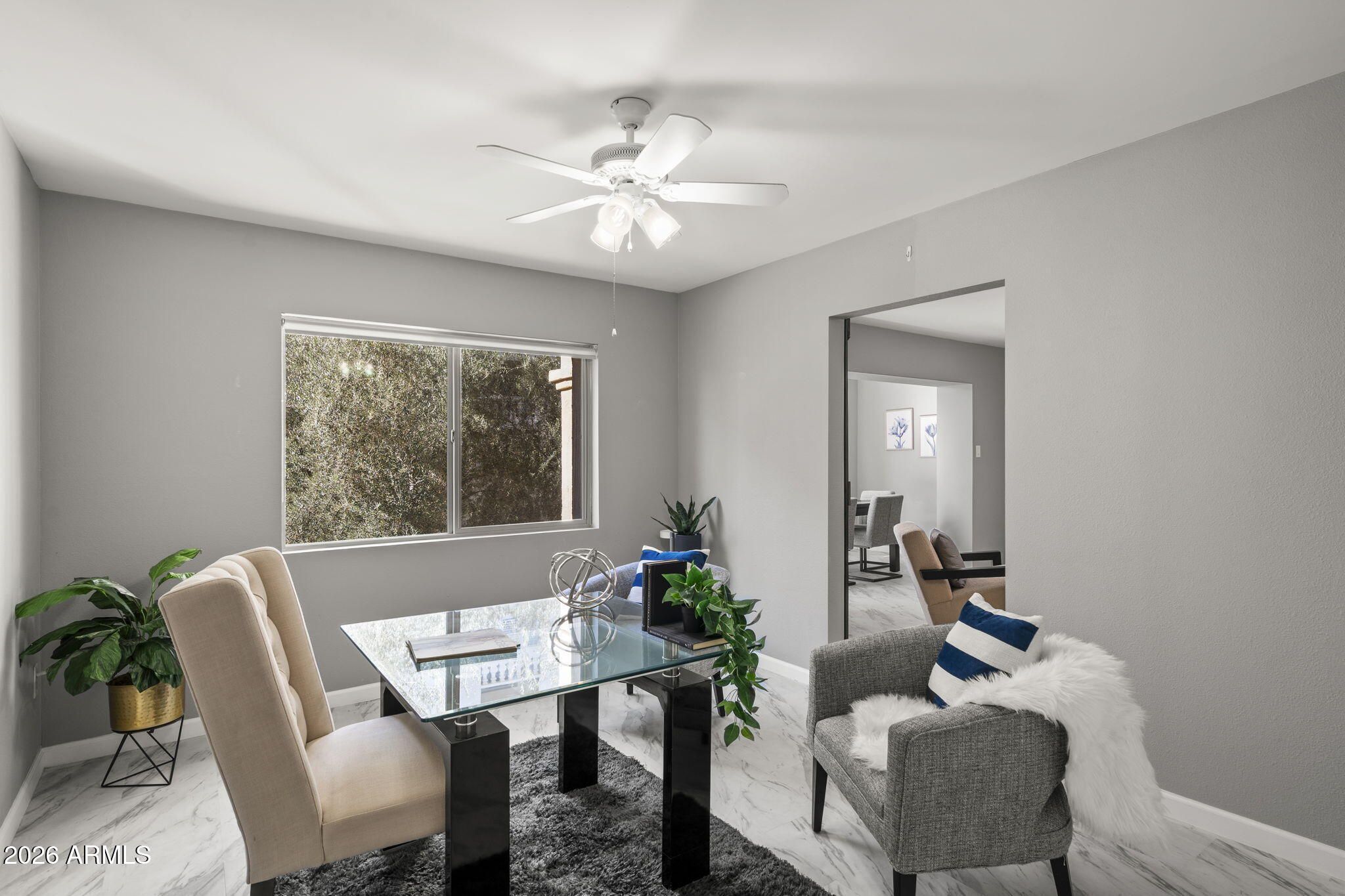 Beautifully updated 2 bedroom/2bath residence in the highly desirable, guard-gated Scottsdale Shadows community. This light-filled unit offers a clean modern aesthetic with neutral wall tones, expansive windows, and marble look tile flooring throughout. The open kitchen and both bath have been thoughtfully updated with quartz countertops, stainless steel appliances and a fresh contemporary design. The enclosed patio adds valuable living space and functions beautifully as a dining area, making the unit larger than the 1200 sq ft reflected in the tax records. The result is a bright, airy layout that lives larger and feels effortlessly inviting. And new air handler, new electrical panel, and new windows makes this unit super efficient!! Scottsdale Shadows offers an unmatched resort-style lifestyle with extensive amenities, including ga 9-hole golf course, walking and biking paths, tennis courts, multiple heated pools and spas, fitness center, clubhouse, media and recreation rooms, community laundry, and serene lake features - all within a guard-gated setting ideally located just steps from Old Town Scottsdale's fun attractions. Don't miss your chance to own a move-in-ready, modern home in one of Scottsdale's iconic communities.