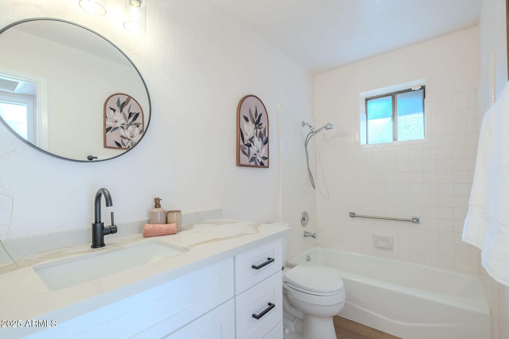 Welcome to easy, carefree 55+ living at Sunland Village East! Discover this beautifully renovated single-level 1,524 sq ft home in the sought-after active adult community of Sunland Village East. Built in 1990 and thoughtfully updated, this 2-bed/2-bath residence offers a turn-key lifestyle with standout features: • Waterproof luxury vinyl plank flooring throughout the main living areas — durable, low-maintenance & stylish. • Gourmet-style kitchen with new shaker-style cabinets, stunning quartz countertops, and brand-new stainless steel appliances. • New central AC installed in 2023 — comfort, efficiency and peace of mind. • Spacious Arizona room off the family room — ideal as a cozy retreat, home office, or entertaining space. Attached garage plus guest parking; easy access and convenience. Immerse yourself in the resort-style lifestyle of Sunland Village East: championship golf, tennis & shuffleboard, clubhouses, arts & crafts studios, woodshop, swimming pools, fitness and more. The low-maintenance lot and HOA cover exterior upkeep, letting you enjoy life rather than chores. Perfect for downsizers or snowbirds seeking an active, social community in Mesa. With upgrades, location and amenities, this home presents excellent value now don't wait! Step into your desert oasis for 2026. 55+ age-restricted community; buyer must be 55+ (or spouse 55+).