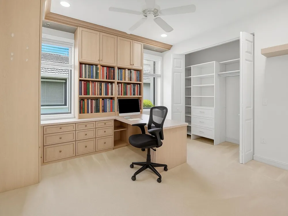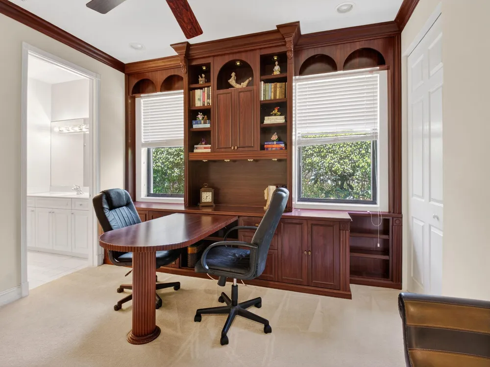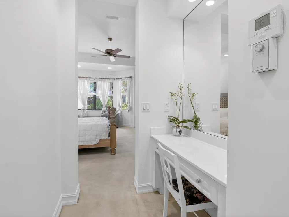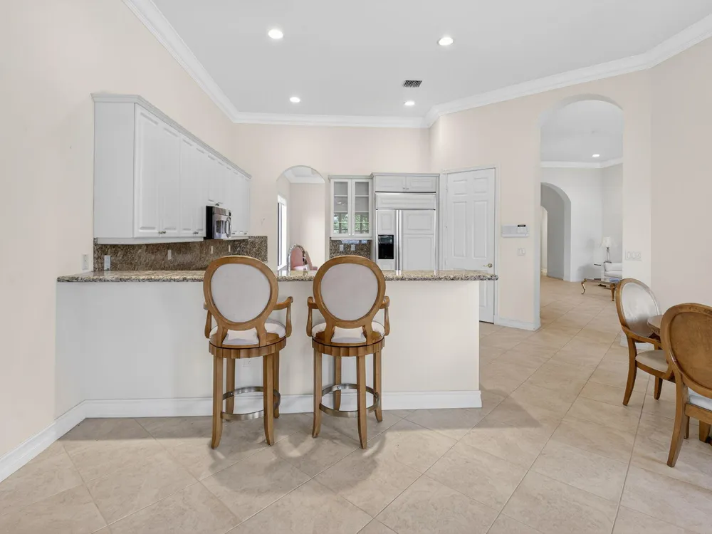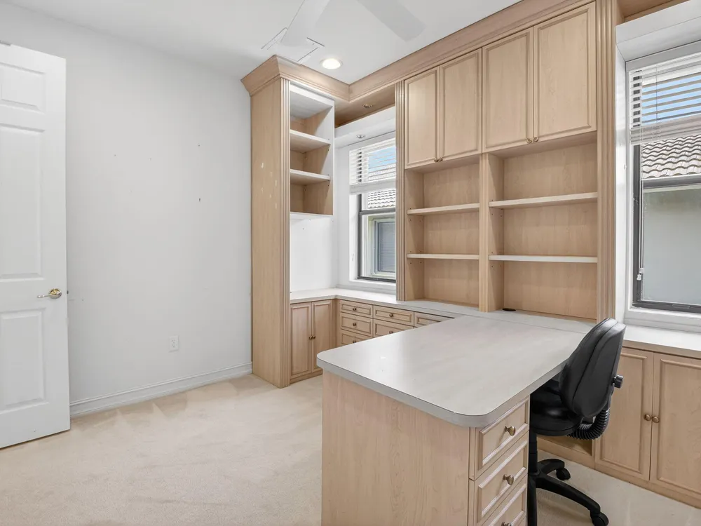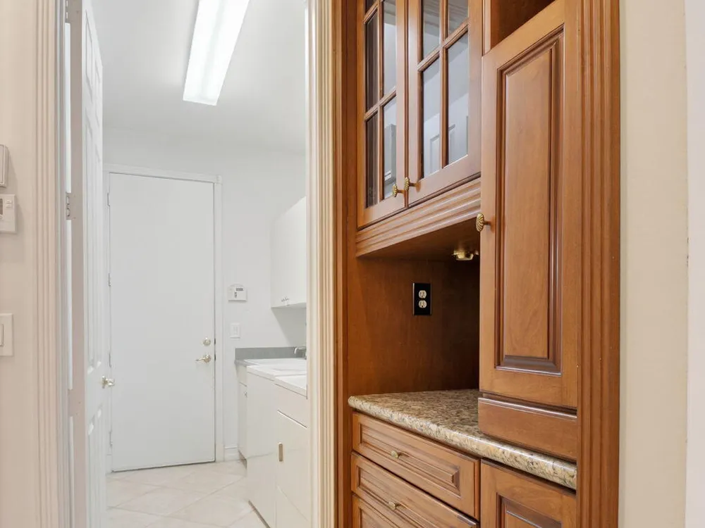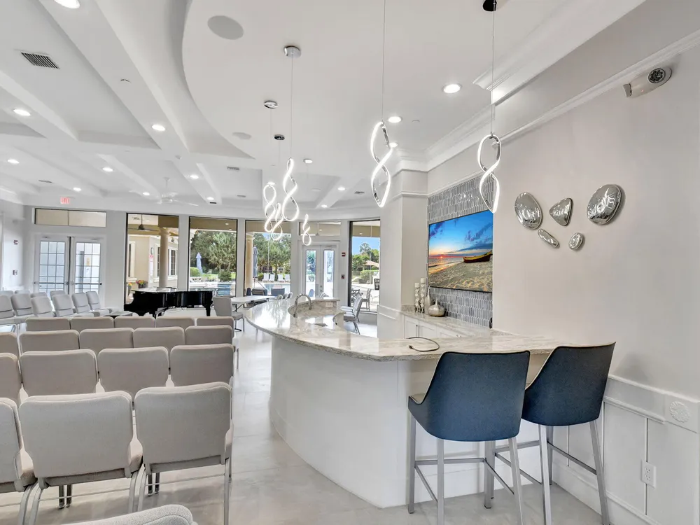 - Split Bedrooms, Entry Level Living Area, High Ceilings, Walk-In Closet(s), Bar, Entrance Foyer, Pantry, Family Room, Home Office, Breakfast Area, Snack Bar, Florida/Dining Room, Blinds, Drapes, Separate Shower, Primary Downstairs, Dual Sinks, Storm Shutters