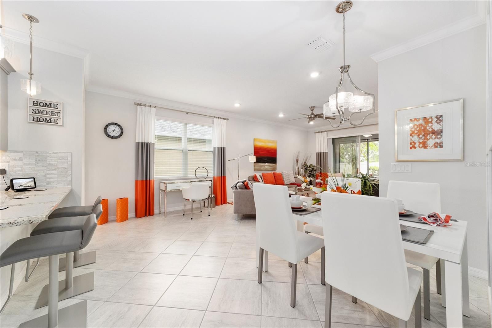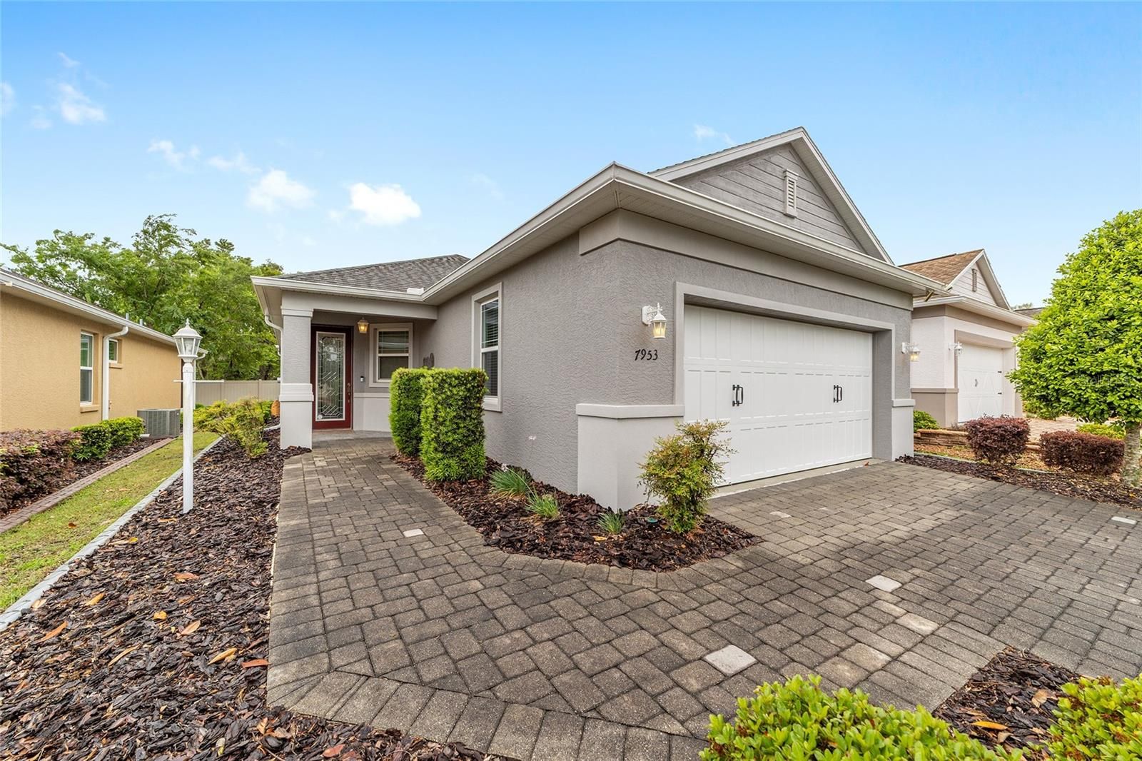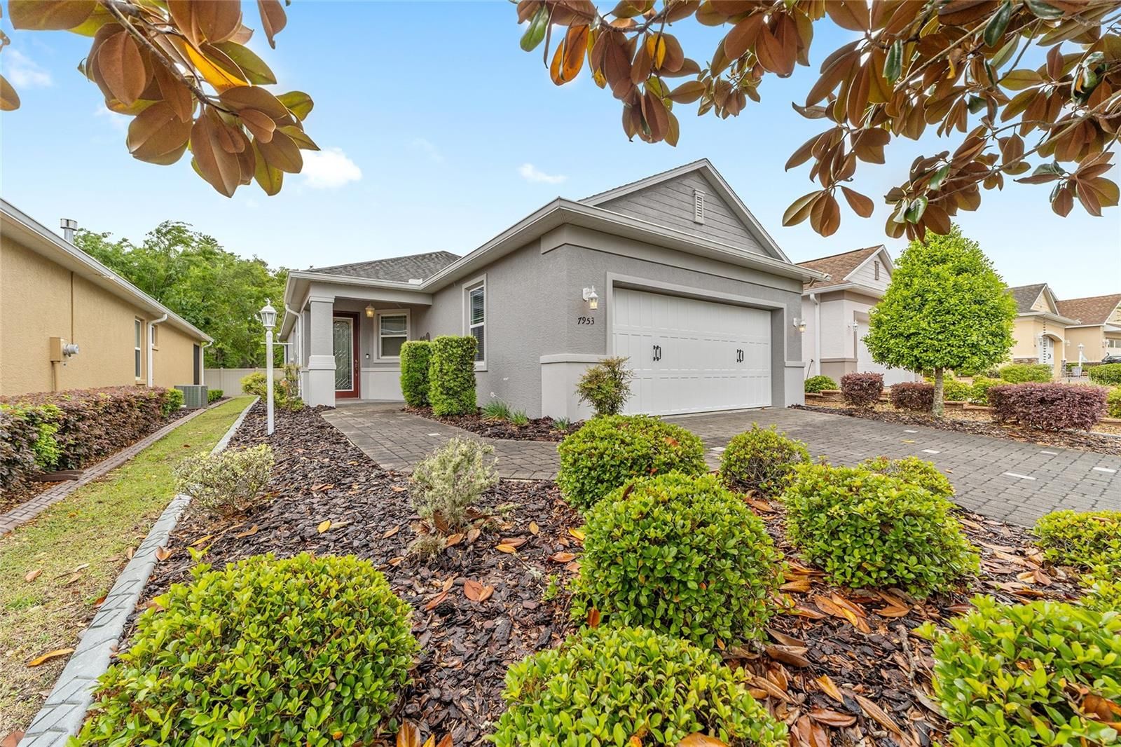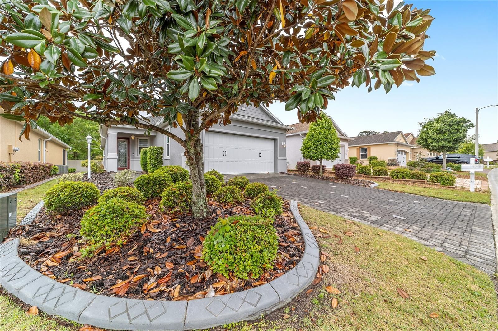 Originally built as the builder's Oren model and lightly lived in just three months per year, this exceptional home is being offered fully turnkey-complete with all original model furnishings, décor, artwork, kitchenware, linens, and more. As a former model, it showcases an impressive array of upgrades, including tile flooring throughout laid on a diagonal (no carpet), crown molding, custom woodwork, built-in shelving, and upgraded window treatments. The kitchen is beautifully appointed with granite countertops, a glass tile backsplash, custom cabinetry with crown molding, and stainless-steel appliances. Extra can lights and smart home enabled. The primary suite features a tray ceiling, spacious walk-in closet, and a well-appointed en-suite bath with a double vanity, quartz countertops, and a custom-tiled shower. Additional highlights include a paver driveway, screened lanai with pavers, a private lot with no rear neighbors, and professionally landscaped curbing. The home also offers the convenience of fully owned solar panels, along with gas appliances including a range, water heater, dryer, and furnace. Located in Indigo East within On Top of the World- Ocala's premier 55+ resort-style golf community; residents enjoy exclusive access to private amenities such as two pools, a fitness center, clubhouse, curbside mail delivery, and waste pickup, plus easy golf-cart access to shopping, dining, entertainment, and more. This is truly a must-see home; photos simply don't capture the level of detail and thoughtful design throughout.