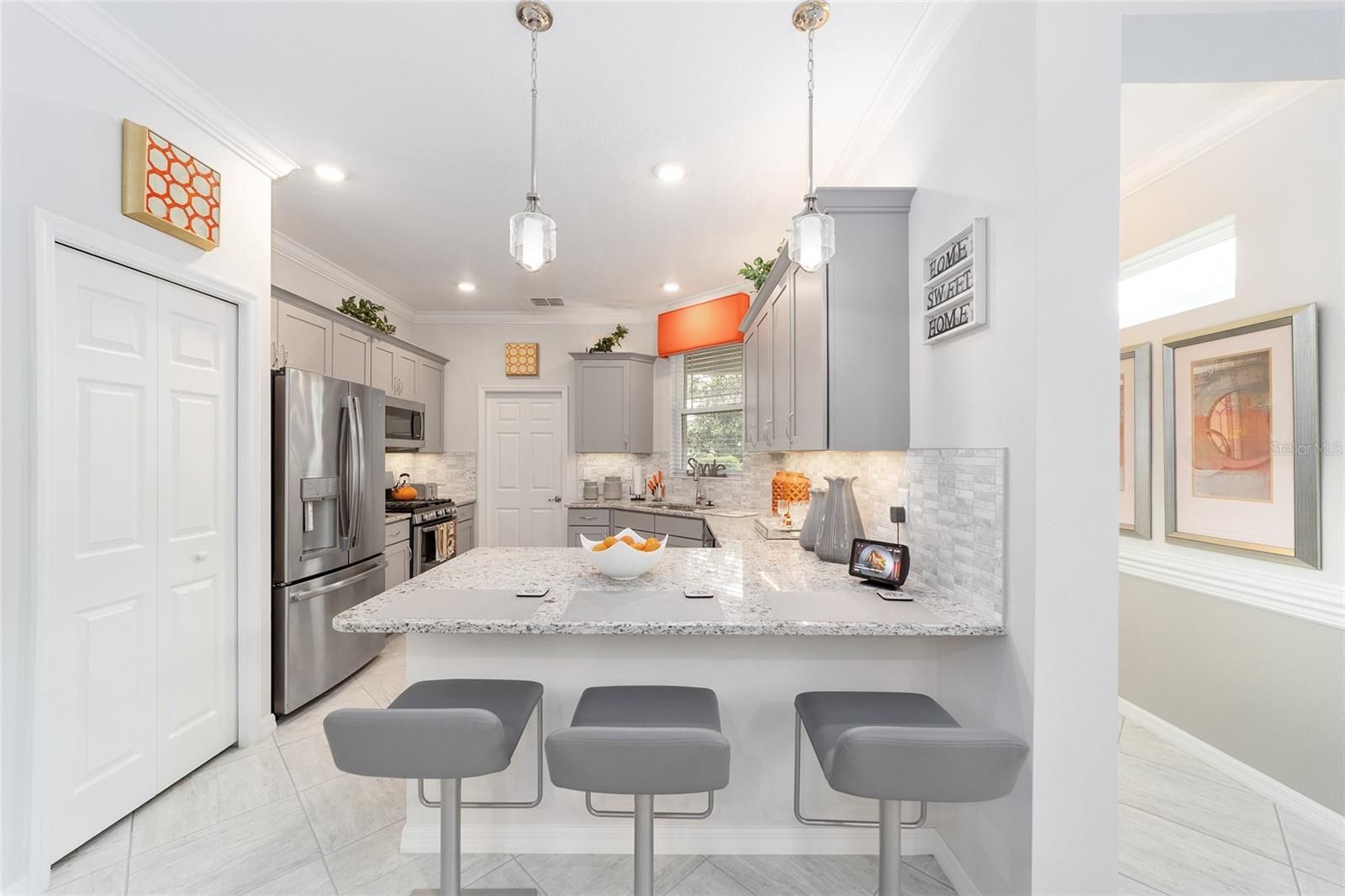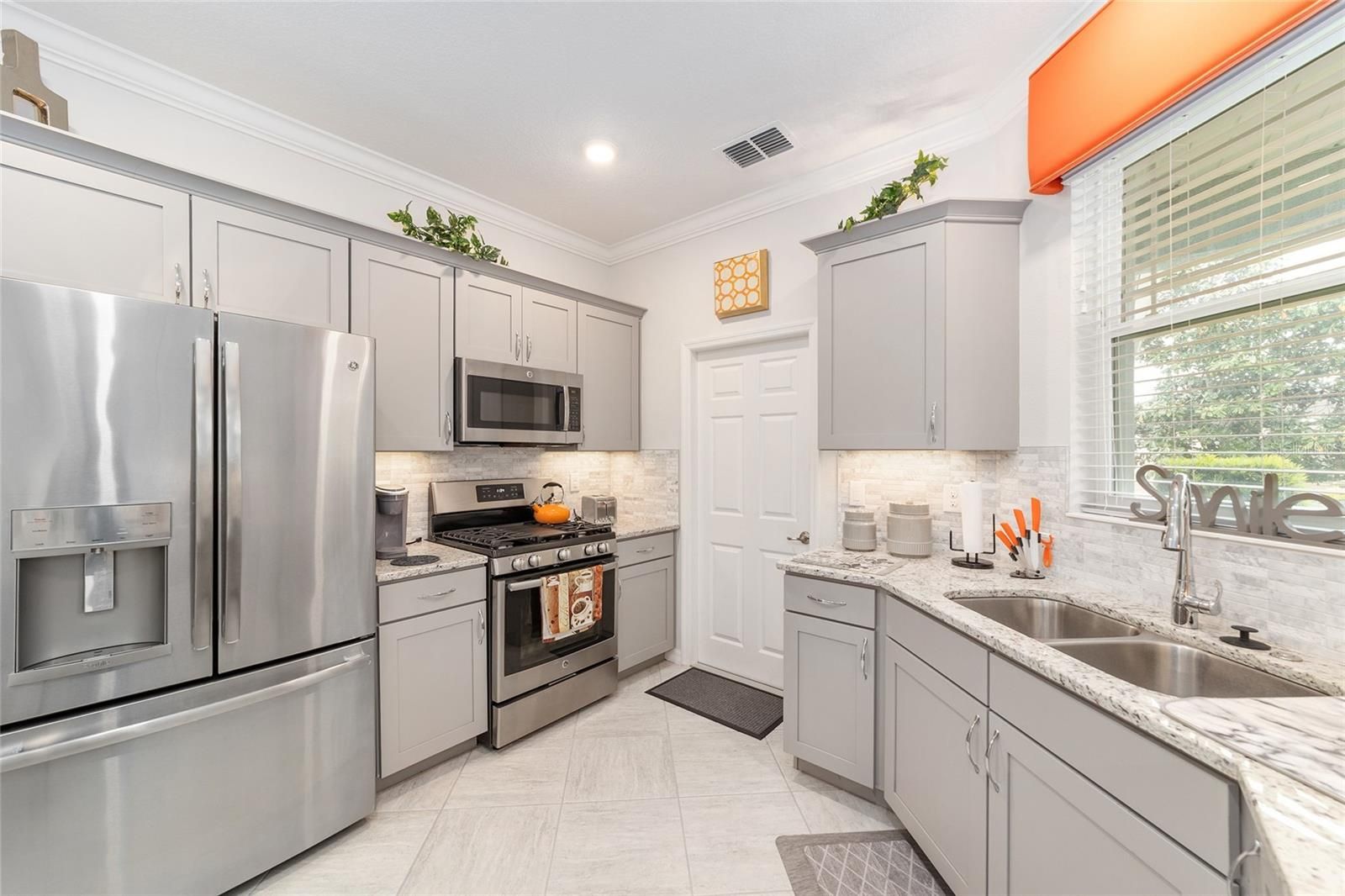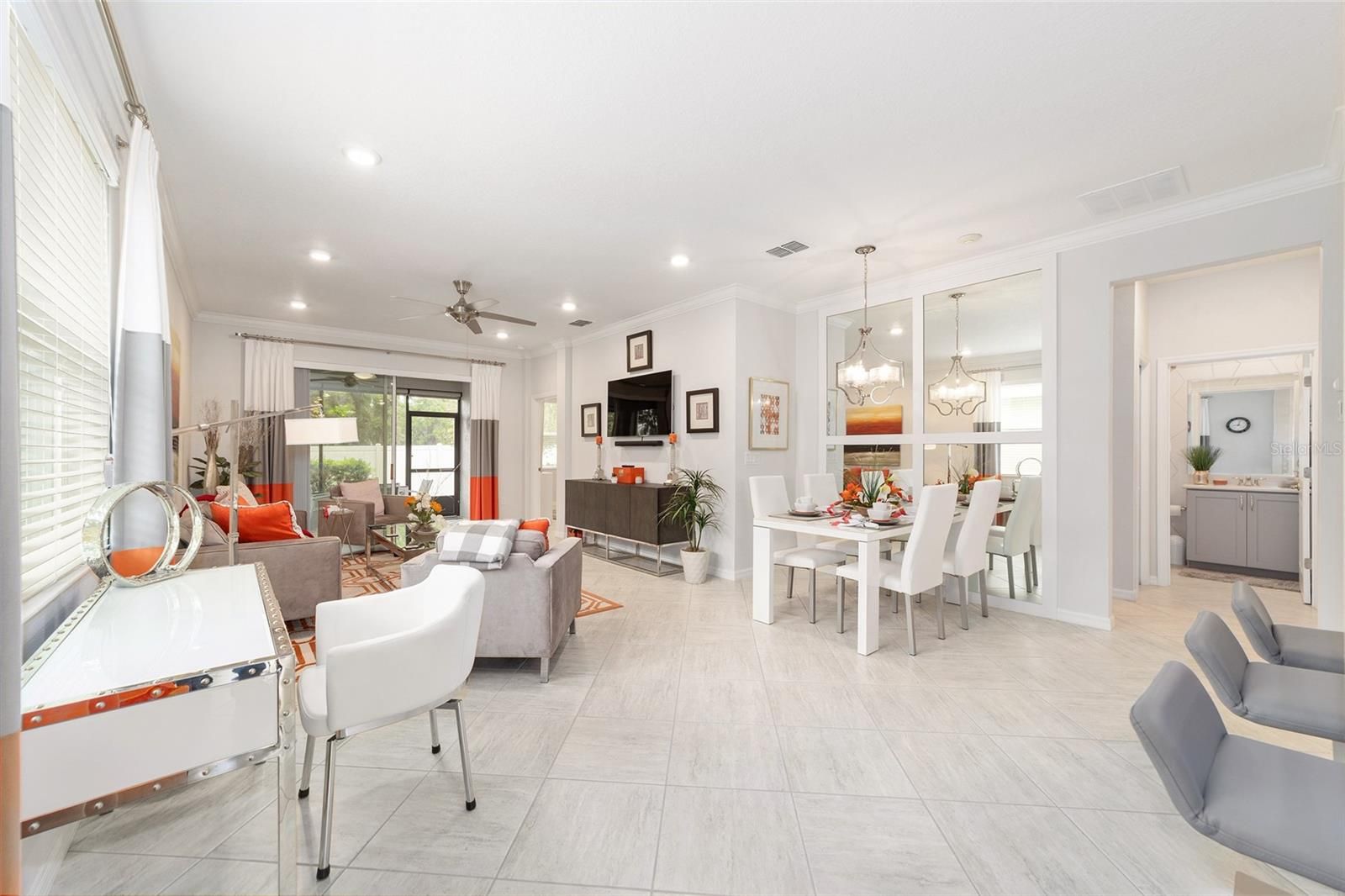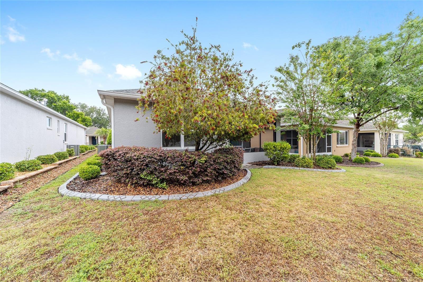 Originally built as the builder's Oren model and lightly lived in just three months per year, this exceptional home is being offered fully turnkey-complete with all original model furnishings, décor, artwork, kitchenware, linens, and more. As a former model, it showcases an impressive array of upgrades, including tile flooring throughout laid on a diagonal (no carpet), crown molding, custom woodwork, built-in shelving, and upgraded window treatments. The kitchen is beautifully appointed with granite countertops, a glass tile backsplash, custom cabinetry with crown molding, and stainless-steel appliances. Extra can lights and smart home enabled. The primary suite features a tray ceiling, spacious walk-in closet, and a well-appointed en-suite bath with a double vanity, quartz countertops, and a custom-tiled shower. Additional highlights include a paver driveway, screened lanai with pavers, a private lot with no rear neighbors, and professionally landscaped curbing. The home also offers the convenience of fully owned solar panels, along with gas appliances including a range, water heater, dryer, and furnace. Located in Indigo East within On Top of the World- Ocala's premier 55+ resort-style golf community; residents enjoy exclusive access to private amenities such as two pools, a fitness center, clubhouse, curbside mail delivery, and waste pickup, plus easy golf-cart access to shopping, dining, entertainment, and more. This is truly a must-see home; photos simply don't capture the level of detail and thoughtful design throughout.
