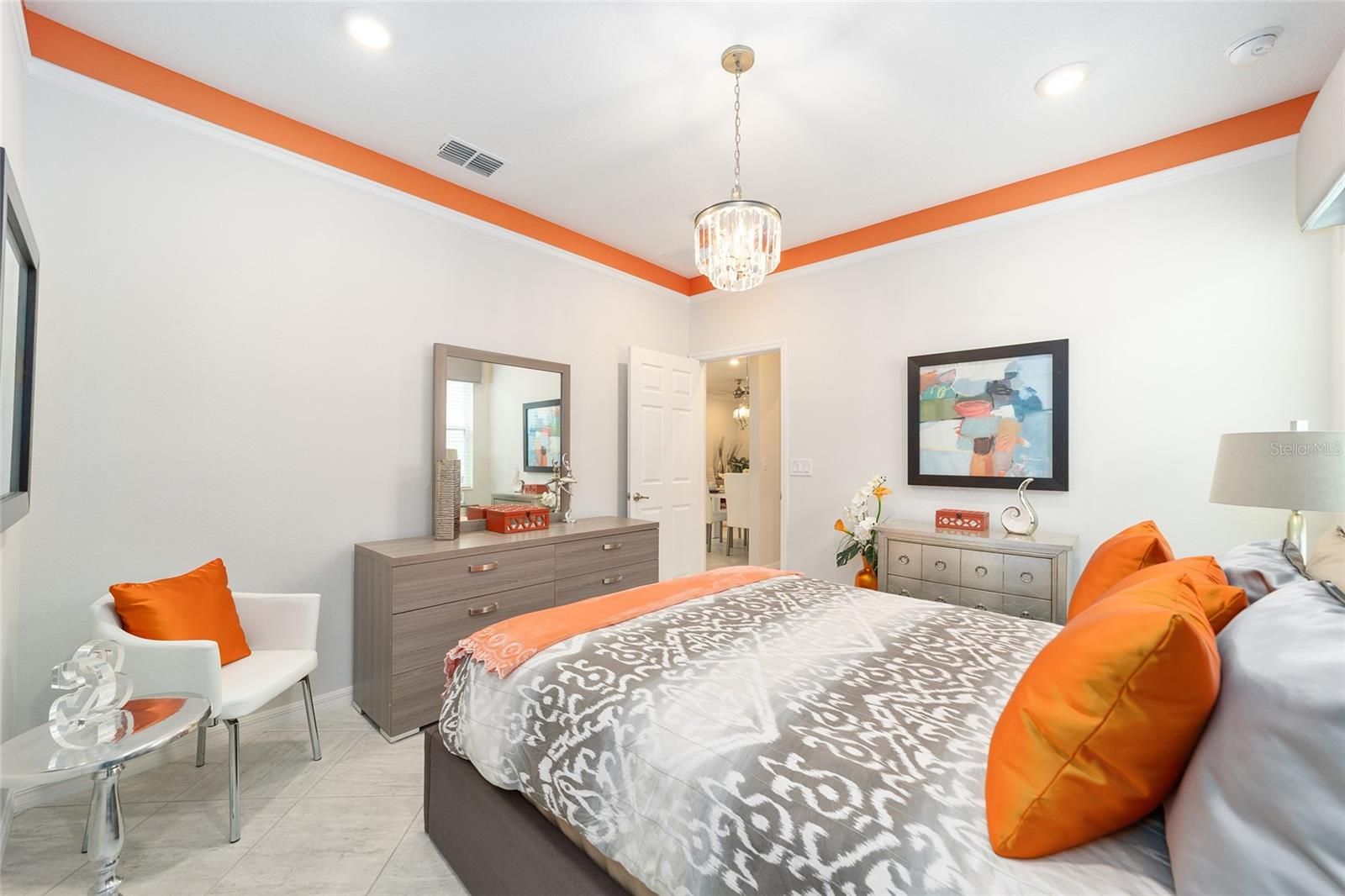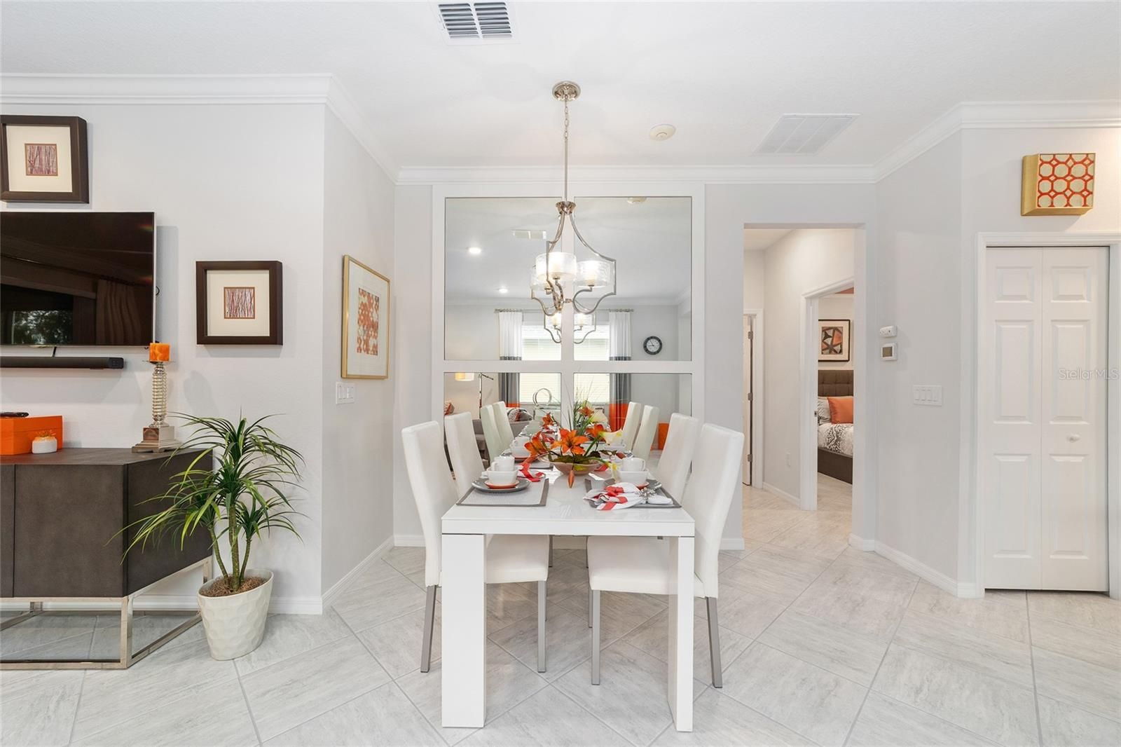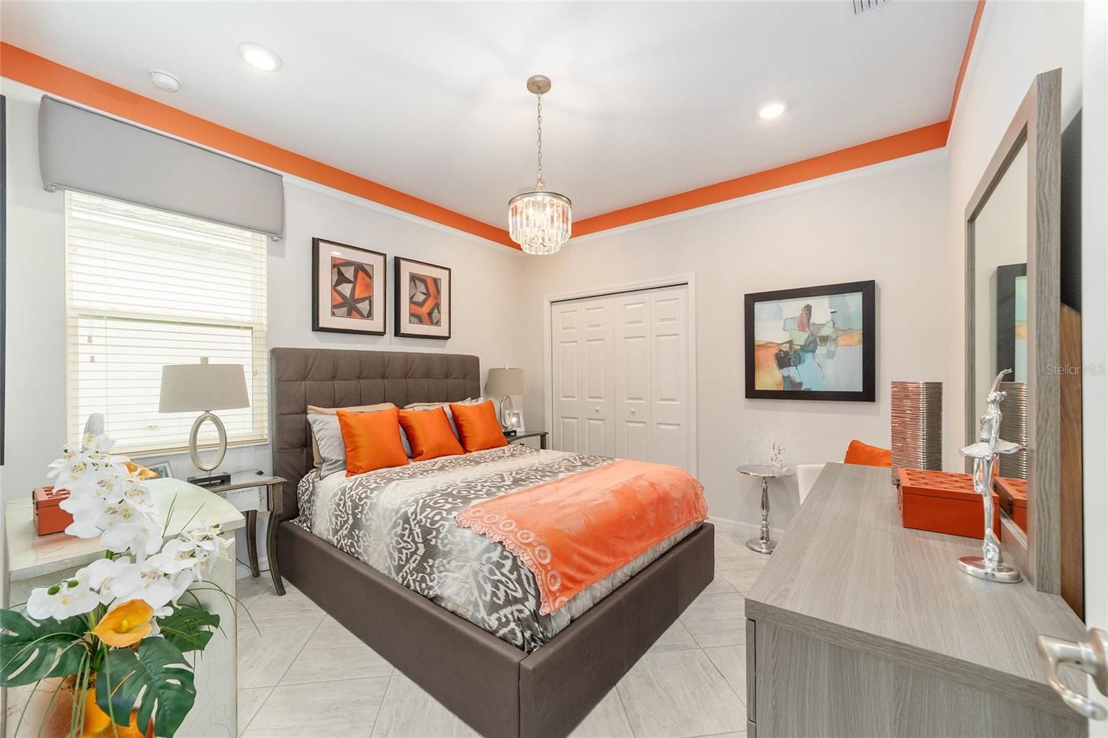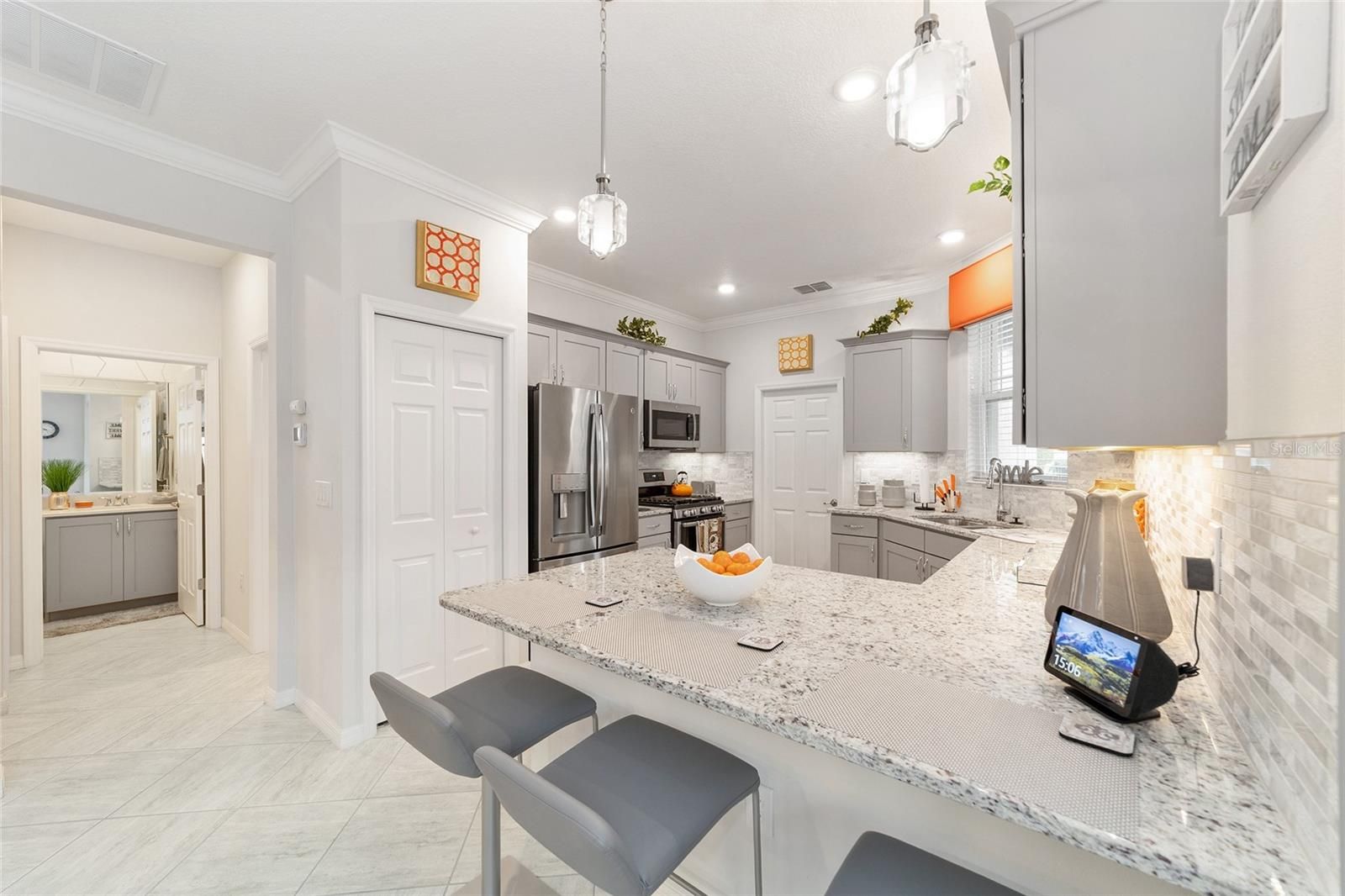 Originally built as the builder's Oren model and lightly lived in just three months per year, this exceptional home is being offered fully turnkey-complete with all original model furnishings, décor, artwork, kitchenware, linens, and more. As a former model, it showcases an impressive array of upgrades, including tile flooring throughout laid on a diagonal (no carpet), crown molding, custom woodwork, built-in shelving, and upgraded window treatments. The kitchen is beautifully appointed with granite countertops, a glass tile backsplash, custom cabinetry with crown molding, and stainless-steel appliances. Extra can lights and smart home enabled. The primary suite features a tray ceiling, spacious walk-in closet, and a well-appointed en-suite bath with a double vanity, quartz countertops, and a custom-tiled shower. Additional highlights include a paver driveway, screened lanai with pavers, a private lot with no rear neighbors, and professionally landscaped curbing. The home also offers the convenience of fully owned solar panels, along with gas appliances including a range, water heater, dryer, and furnace. Located in Indigo East within On Top of the World- Ocala's premier 55+ resort-style golf community; residents enjoy exclusive access to private amenities such as two pools, a fitness center, clubhouse, curbside mail delivery, and waste pickup, plus easy golf-cart access to shopping, dining, entertainment, and more. This is truly a must-see home; photos simply don't capture the level of detail and thoughtful design throughout.