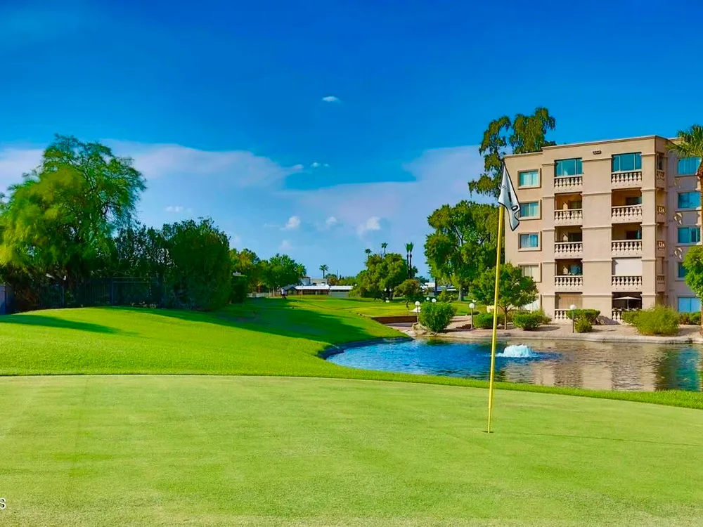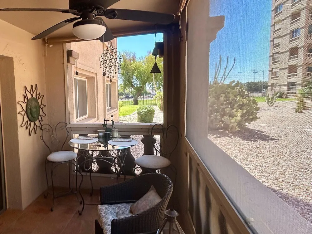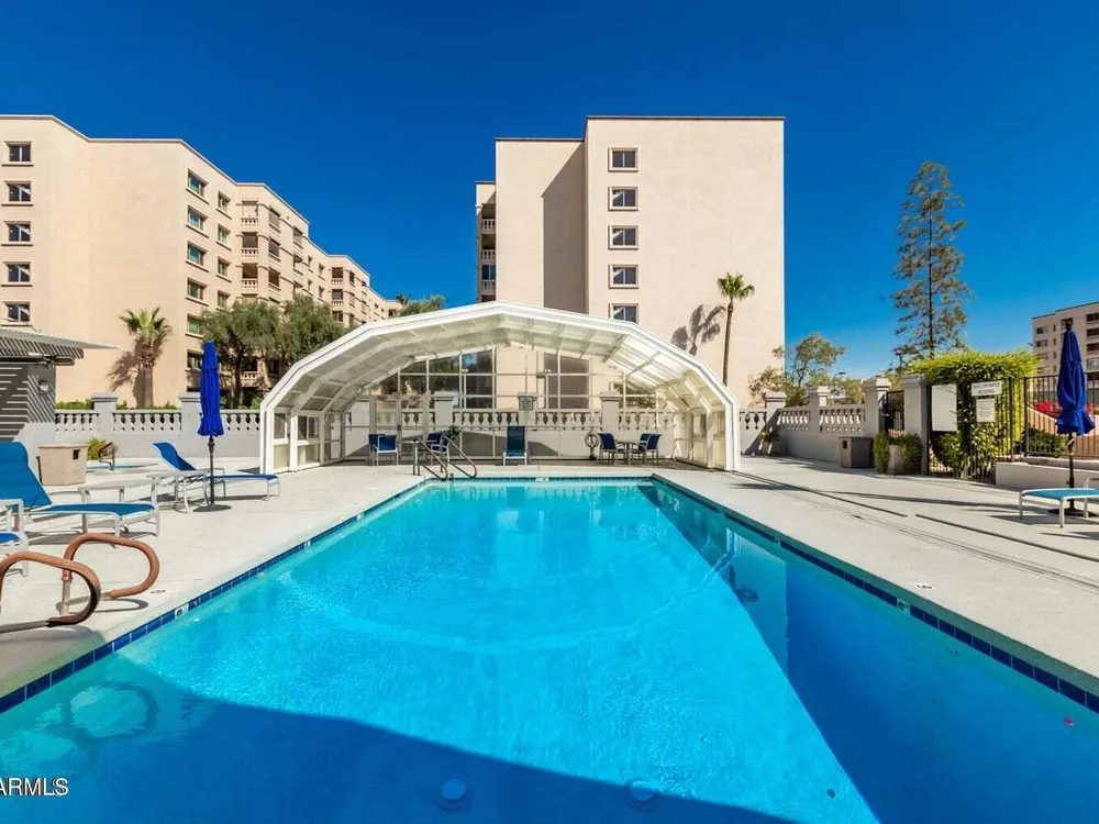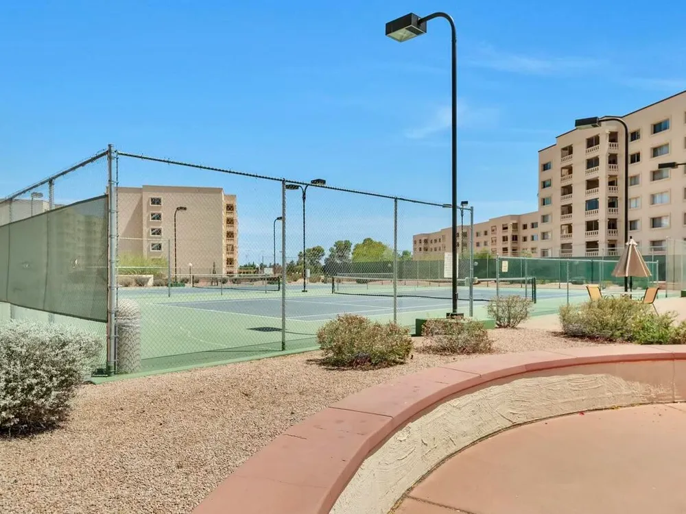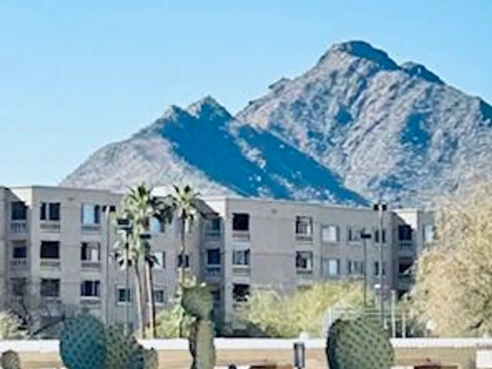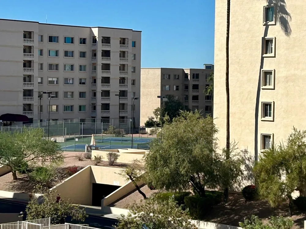 Exceptional Value unites with Exquisite Style in the Scottsdale Shadows. This rare end-unit gem is grounded with high-end, grey, porcelain meticulously tiled throughout entire unit. Immaculate SS Samsung kitchen appliances flank the ample, custom wood cabinetry. Quartz kitchen counters & custom back splash exude a neutral elegance. Spacious master closet is fitted with built-in wardrobe. Private patio is ideal to enjoy sunsets over Camelback Mt. & is fitted w/custom screens & includes storage closet. Amenities abound with 3 heated pools, workout facility, sauna, 2 lit tennis courts, library, art room, business center, private 9-hole golf course & more! HOA covers air conditioning, heat, water & trash Underground, secure & dedicated parking stall, #117 included with sale & is conveniently located close to bldg. entry. Nestled in Old Town Scottsdale, you'll have ample access to restaurants, pubs, shopping and galleries & museums. Ideal for a seasonal escape or a year-round sanctuary, the Scottsdale Shadows Lifestyle is your oasis within reach.