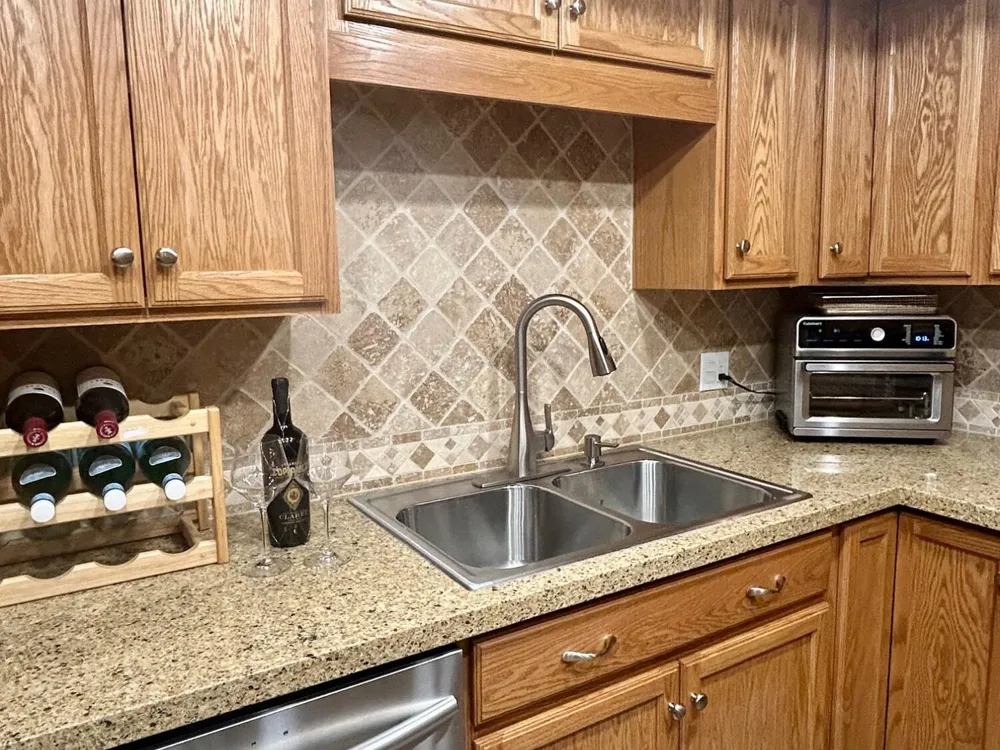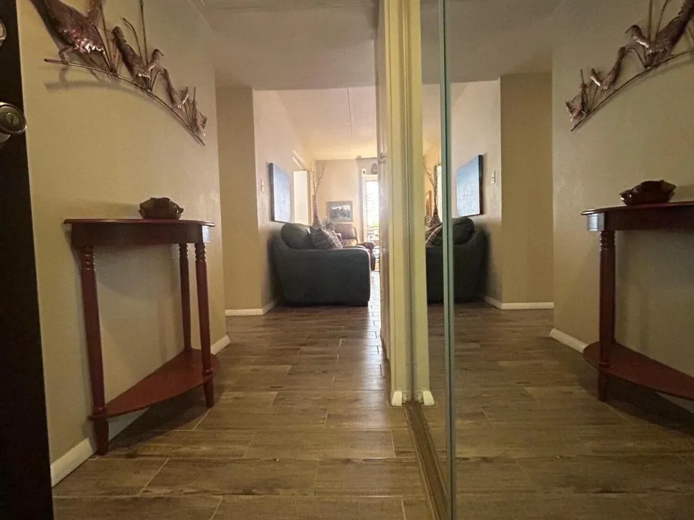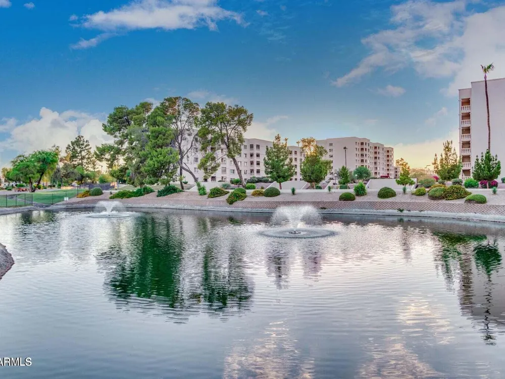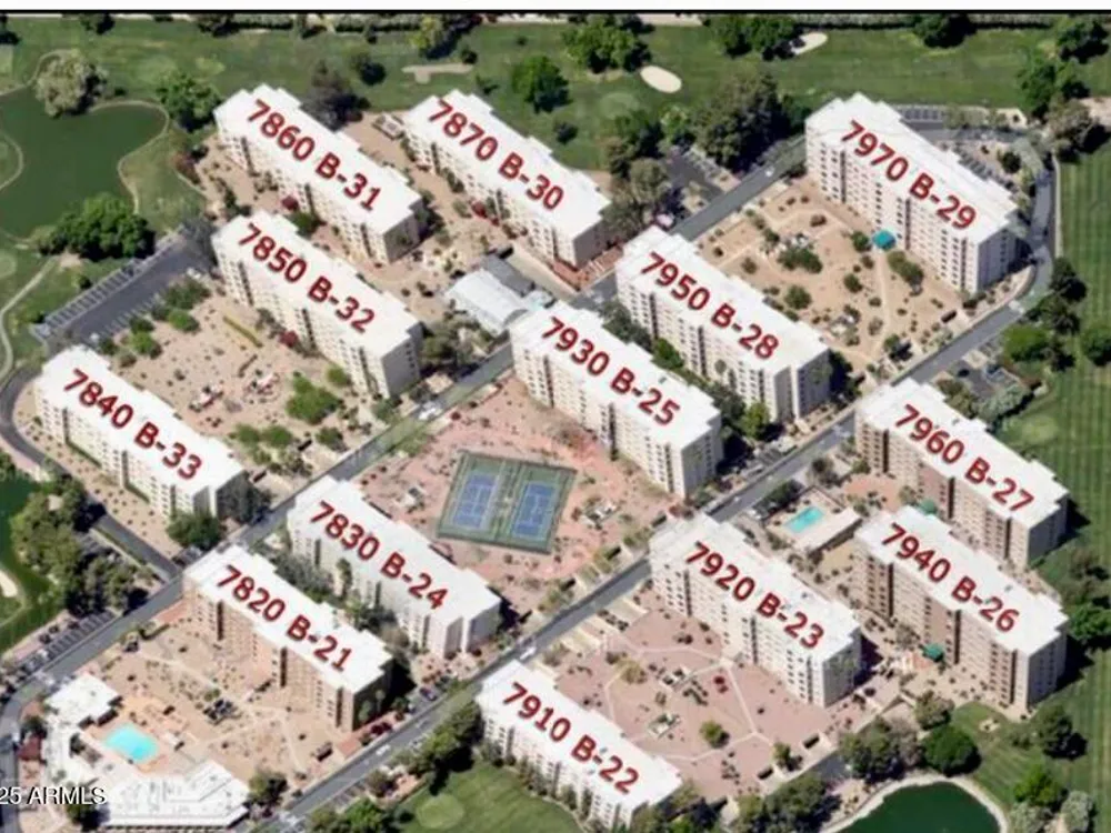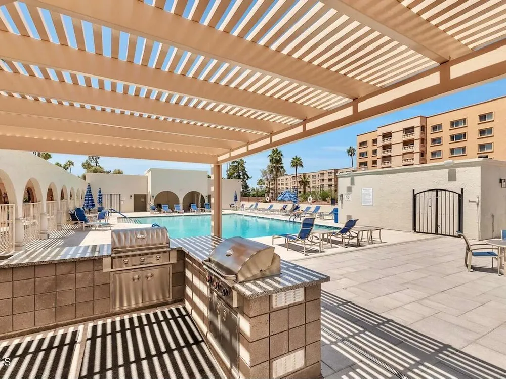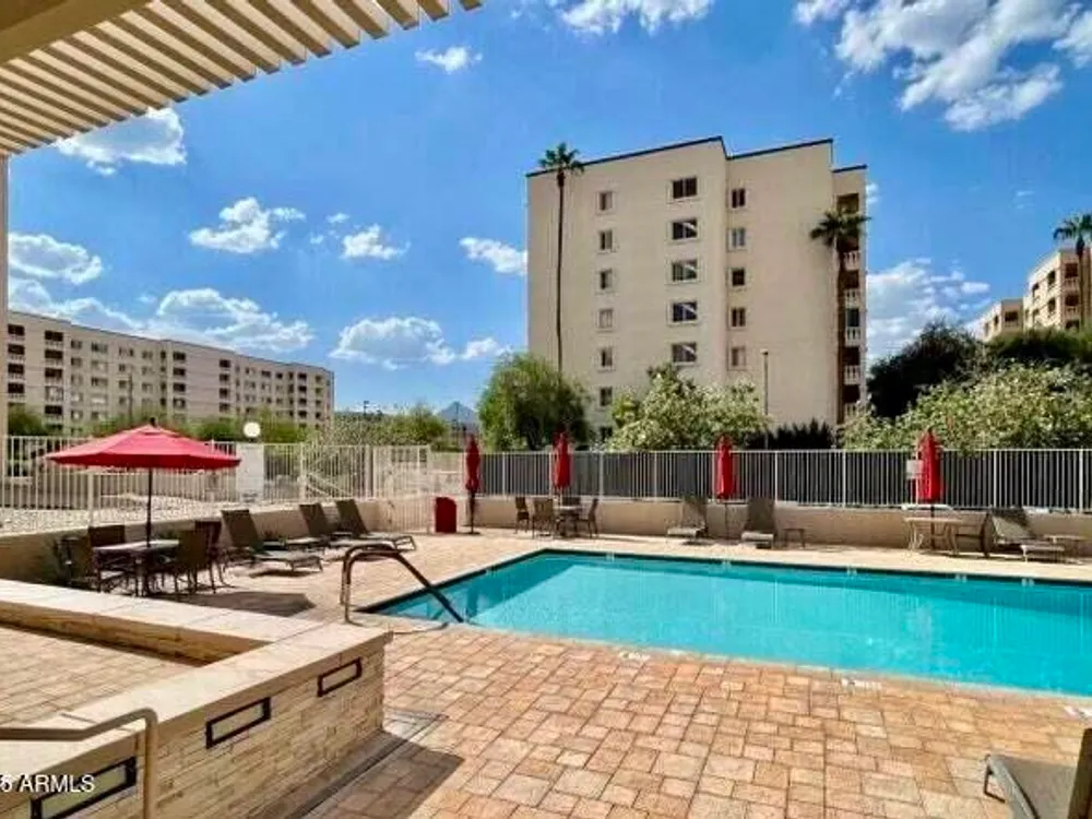 Exceptional Value unites with Exquisite Style in the Scottsdale Shadows. This rare end-unit gem is grounded with high-end, grey, porcelain meticulously tiled throughout entire unit. Immaculate SS Samsung kitchen appliances flank the ample, custom wood cabinetry. Quartz kitchen counters & custom back splash exude a neutral elegance. Spacious master closet is fitted with built-in wardrobe. Private patio is ideal to enjoy sunsets over Camelback Mt. & is fitted w/custom screens & includes storage closet. Amenities abound with 3 heated pools, workout facility, sauna, 2 lit tennis courts, library, art room, business center, private 9-hole golf course & more! HOA covers air conditioning, heat, water & trash Underground, secure & dedicated parking stall, #117 included with sale & is conveniently located close to bldg. entry. Nestled in Old Town Scottsdale, you'll have ample access to restaurants, pubs, shopping and galleries & museums. Ideal for a seasonal escape or a year-round sanctuary, the Scottsdale Shadows Lifestyle is your oasis within reach.
