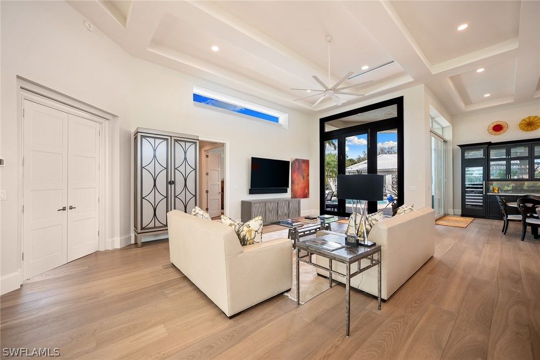 Welcome inside this one-of-a-kind 3,800 square foot Villa home that defines a new age of redevelopment for Pelican Bay's coveted Grand Bay gated community; experience its luxury debut. Masterfully re-imagined by Fleming Architects and Glendale Group Builders, this luxurious home was expanded and rebuilt with refined modernity, unrestrained beauty, and superior craftmanship. Enter the voluminous Great Room flanked by stunning 14-foot coffered ceilings and walls of glass that stream natural light throughout the day. Multiple living and dining areas are designed for ease and open flow of entertaining and modern living. The centerpiece gourmet kitchen is a chef’s dream with premium appliances and an expansive center island. A separate wine tasting and beverage bar holds 200 bottles of your finest. This impeccable residence boasts four bedrooms with four ensuite baths plus a powder room. Guests will feel especially welcome in the private Cabana bedroom suite and bath. Fine custom cabinetry and architectural millwork throughout the home ensure timeless and enduring design. New roof, impact windows and doors, electrical and plumbing, appliances, mechanicals and the finest of luxury hardwood and stone finishes dovetail with exceptional design to provide the ultimate living experience. Ideally located near tram station for access to Pelican Bay’s world-class beach amenities. Superior elevation with no effect from Ian. This exceptionally grand Villa awaits its illustrious owner.