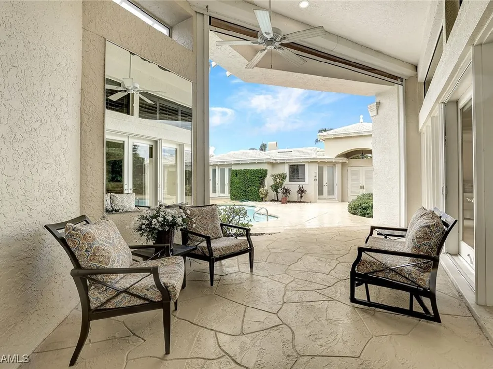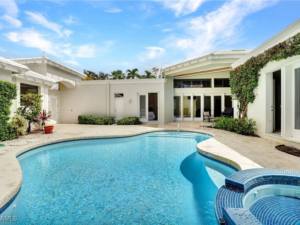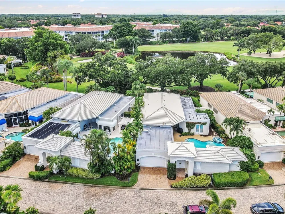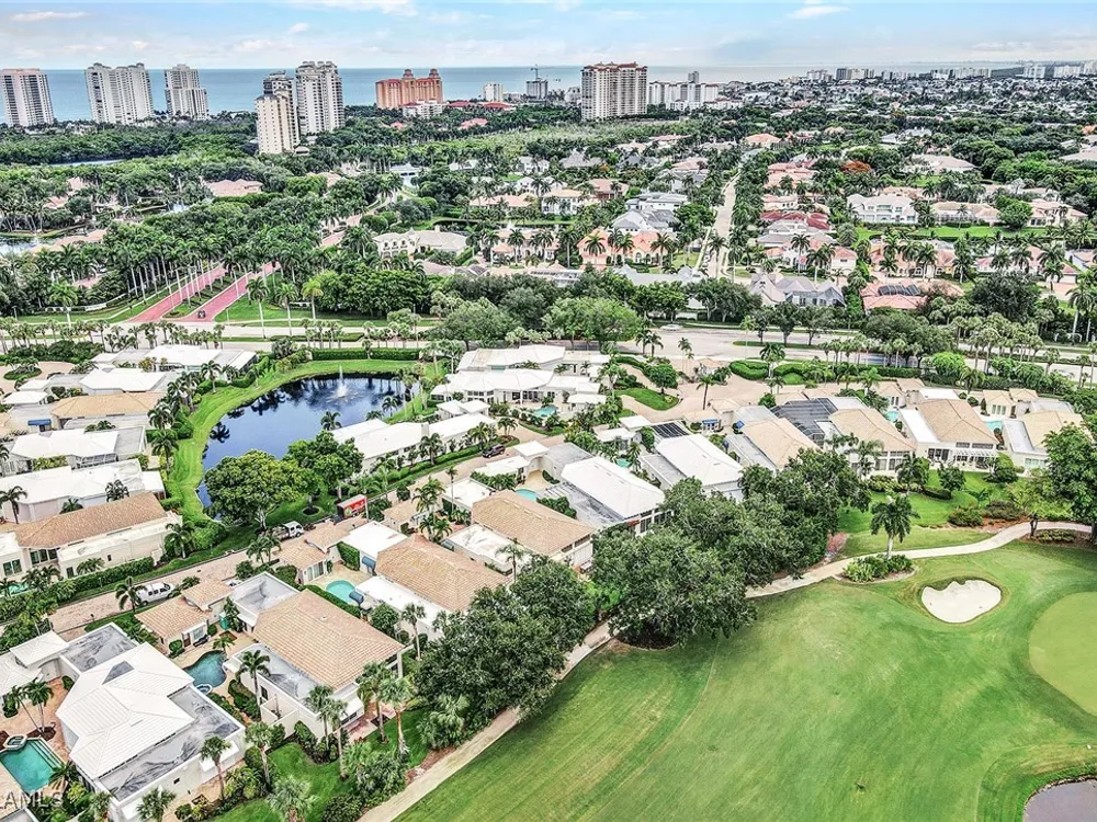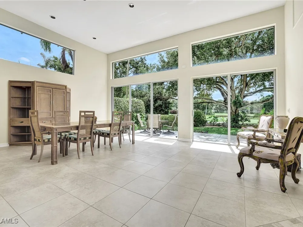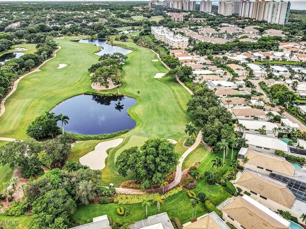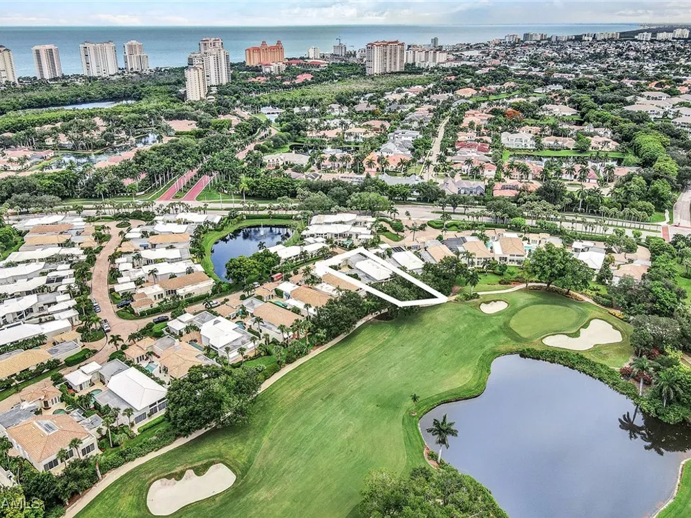 Arguably the finest view in all of Grand Bay. This home is large. There are only a few homes with a two-room cabana in Grand Bay, and this lovely home is one of them. Enter the home through the expanded courtyard and into the spacious living room with soaring ceilings. Enjoy dining while looking out at the beautiful Pelican Bay golf course. A wide-open patio off the dining/living area allows one to enjoy sunsets and watch the golfers through the beautiful private vegetation. Two bedrooms are off the living area. There is a third bedroom off the family room with its private bath. The kitchen is conveniently between the dining room and the breakfast room/family room area. The cabana off the courtyard area gives your guests complete privacy. This property is for the buyer who wants to renovate from top to bottom and make it their own. You will be pleasantly surprised when you visit this courtyard home. It shows light and airy with a south-facing lot and lots of windows.