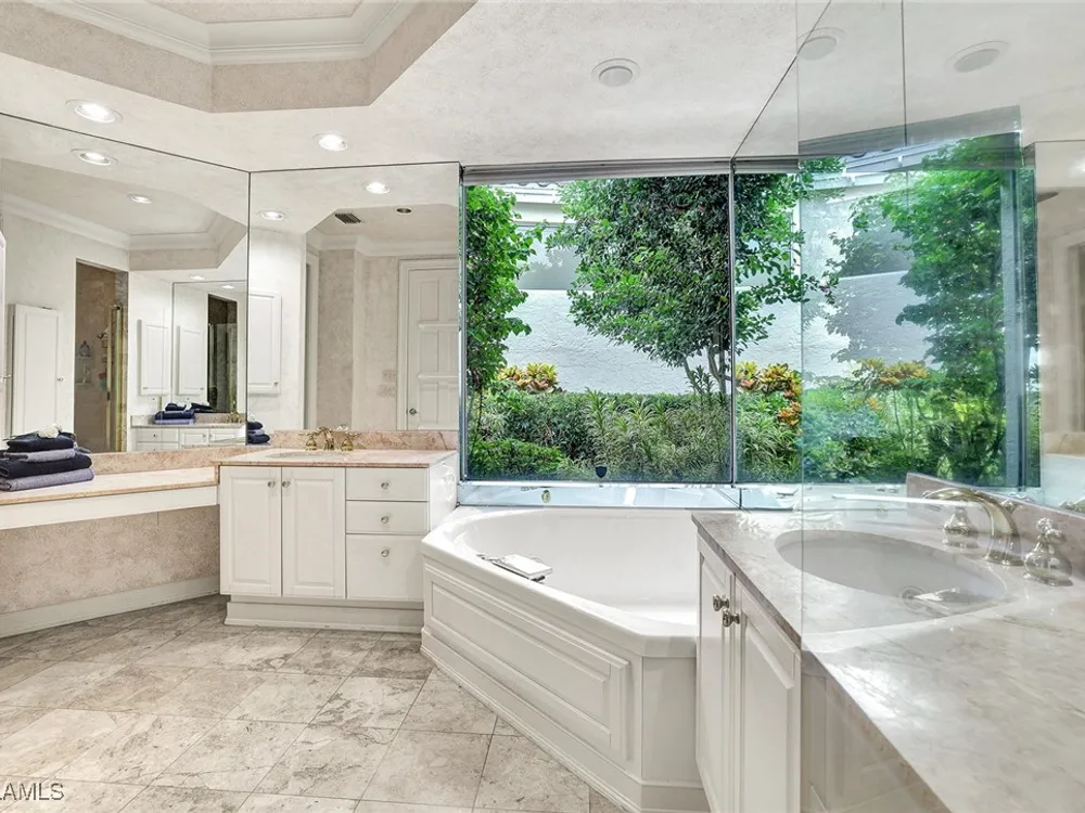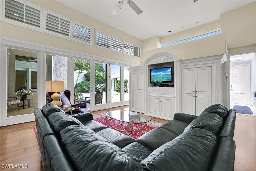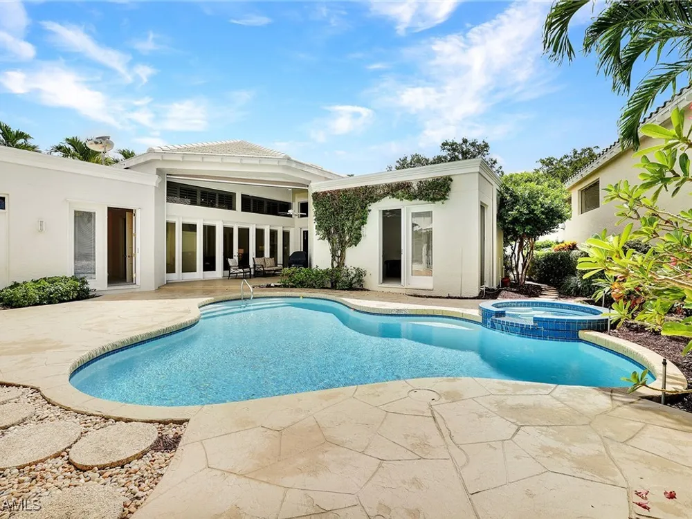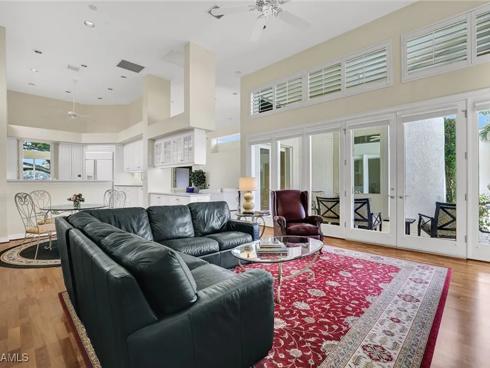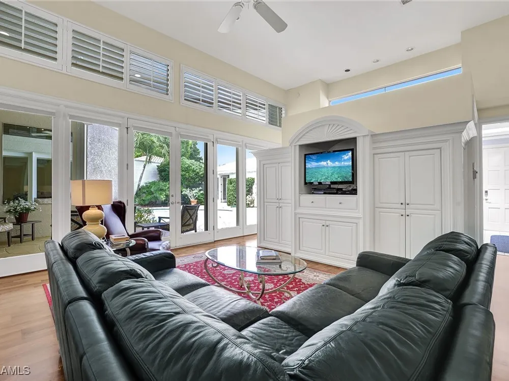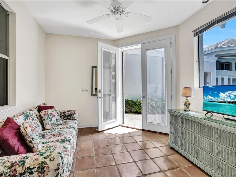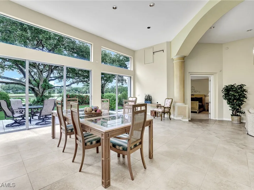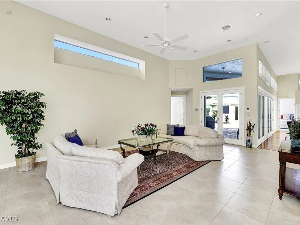 Arguably the finest view in all of Grand Bay. This home is large. There are only a few homes with a two-room cabana in Grand Bay, and this lovely home is one of them. Enter the home through the expanded courtyard and into the spacious living room with soaring ceilings. Enjoy dining while looking out at the beautiful Pelican Bay golf course. A wide-open patio off the dining/living area allows one to enjoy sunsets and watch the golfers through the beautiful private vegetation. Two bedrooms are off the living area. There is a third bedroom off the family room with its private bath. The kitchen is conveniently between the dining room and the breakfast room/family room area. The cabana off the courtyard area gives your guests complete privacy. This property is for the buyer who wants to renovate from top to bottom and make it their own. You will be pleasantly surprised when you visit this courtyard home. It shows light and airy with a south-facing lot and lots of windows.
