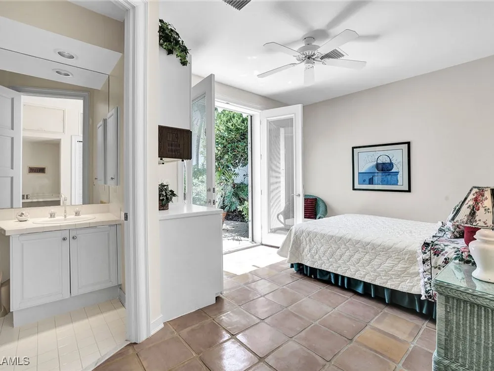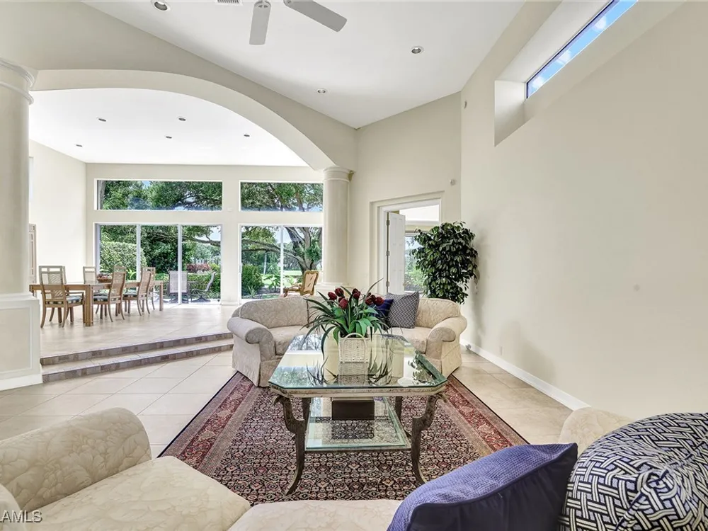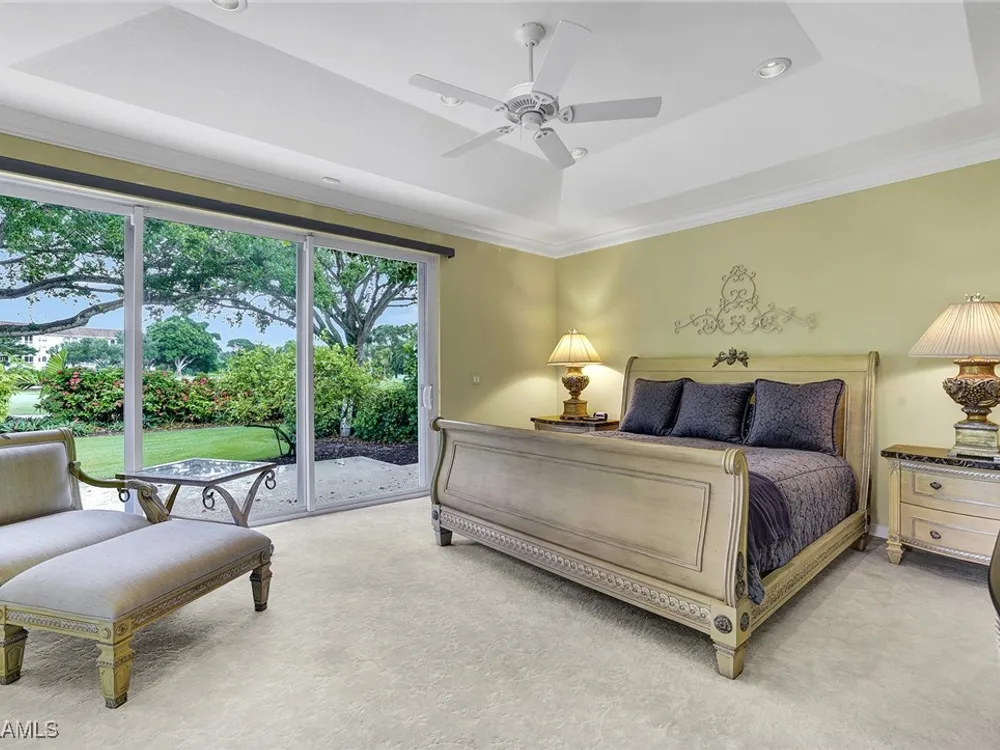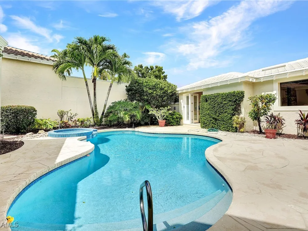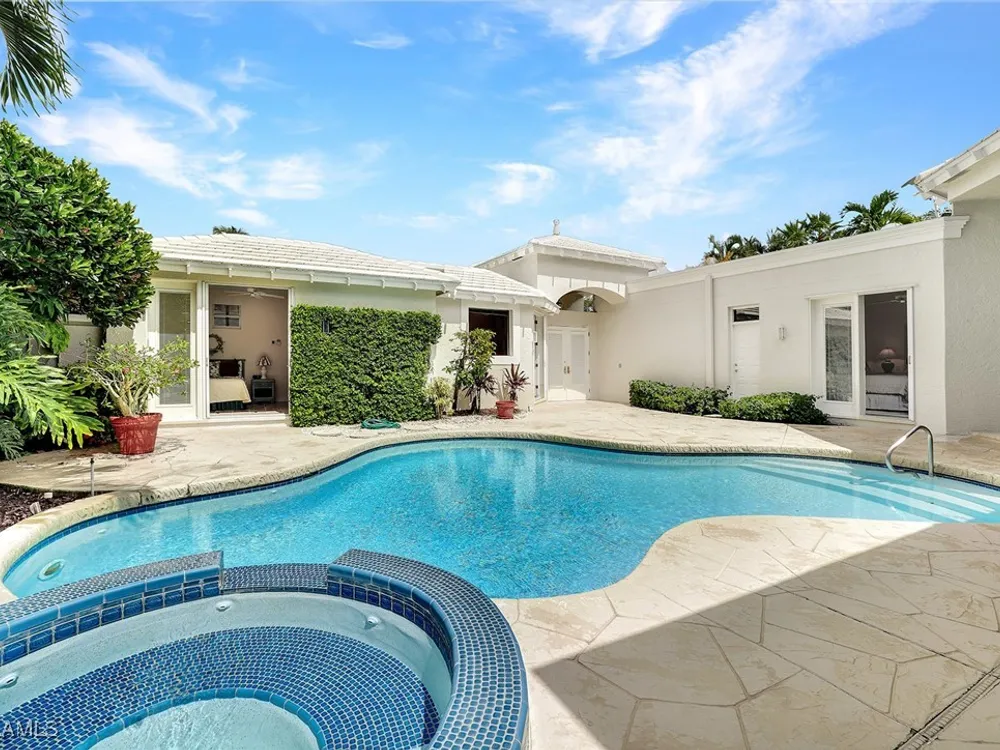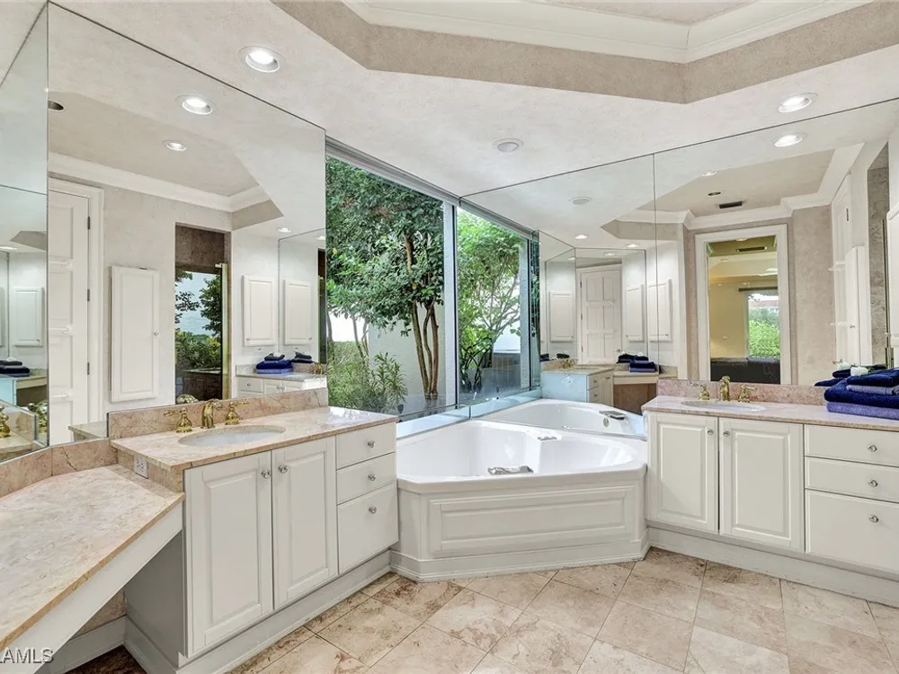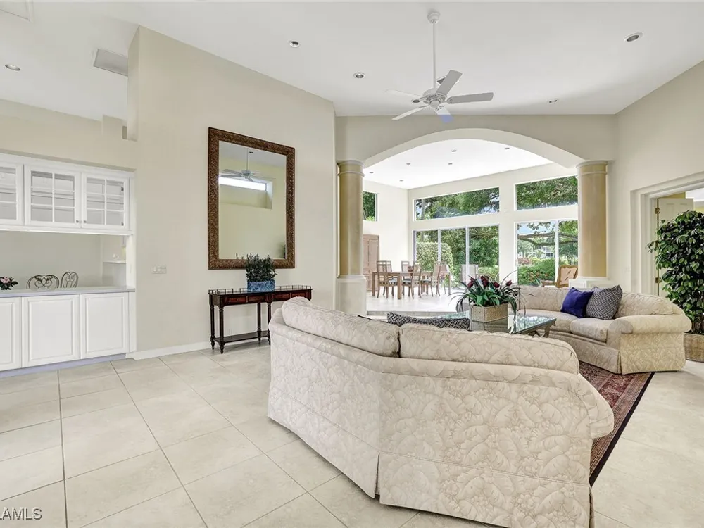 Arguably the finest view in all of Grand Bay. This home is large. There are only a few homes with a two-room cabana in Grand Bay, and this lovely home is one of them. Enter the home through the expanded courtyard and into the spacious living room with soaring ceilings. Enjoy dining while looking out at the beautiful Pelican Bay golf course. A wide-open patio off the dining/living area allows one to enjoy sunsets and watch the golfers through the beautiful private vegetation. Two bedrooms are off the living area. There is a third bedroom off the family room with its private bath. The kitchen is conveniently between the dining room and the breakfast room/family room area. The cabana off the courtyard area gives your guests complete privacy. This property is for the buyer who wants to renovate from top to bottom and make it their own. You will be pleasantly surprised when you visit this courtyard home. It shows light and airy with a south-facing lot and lots of windows.