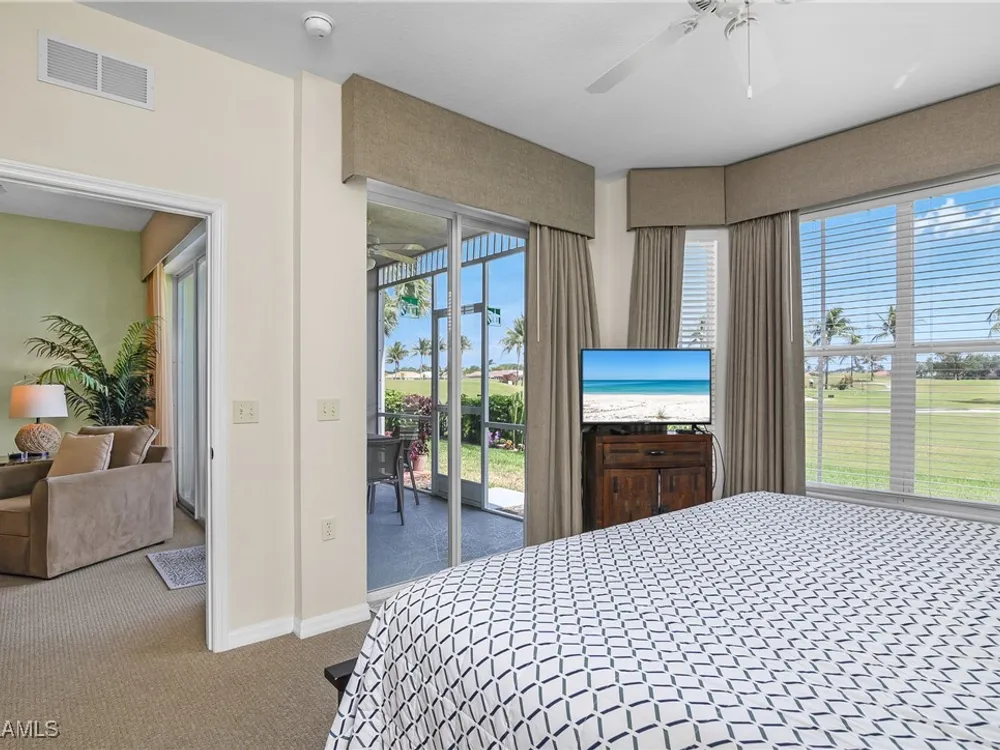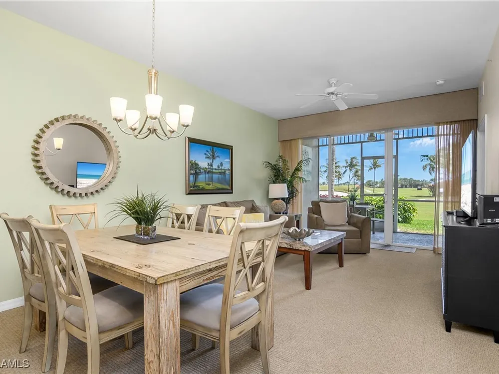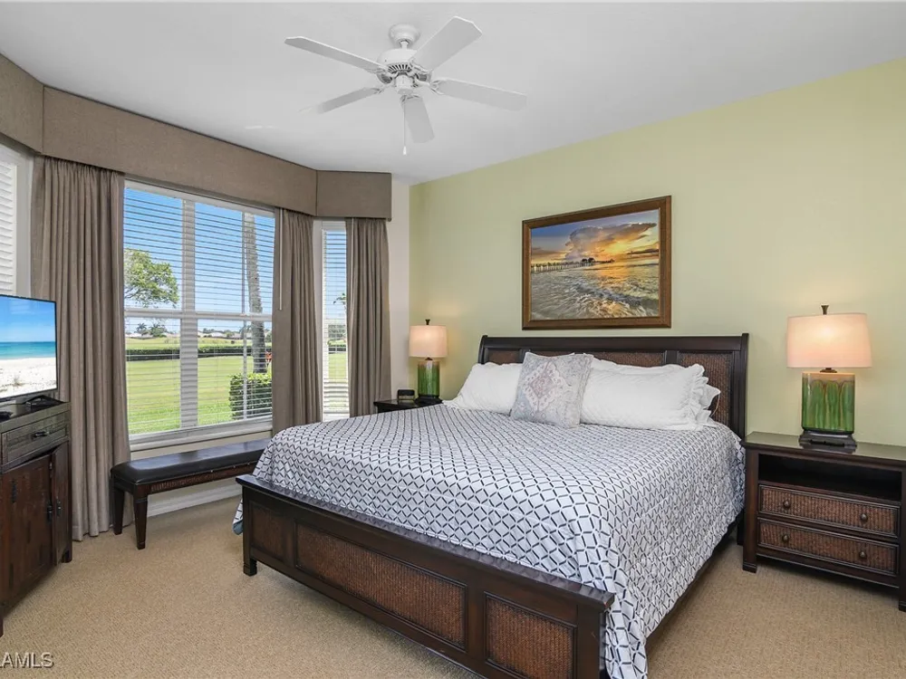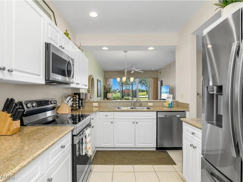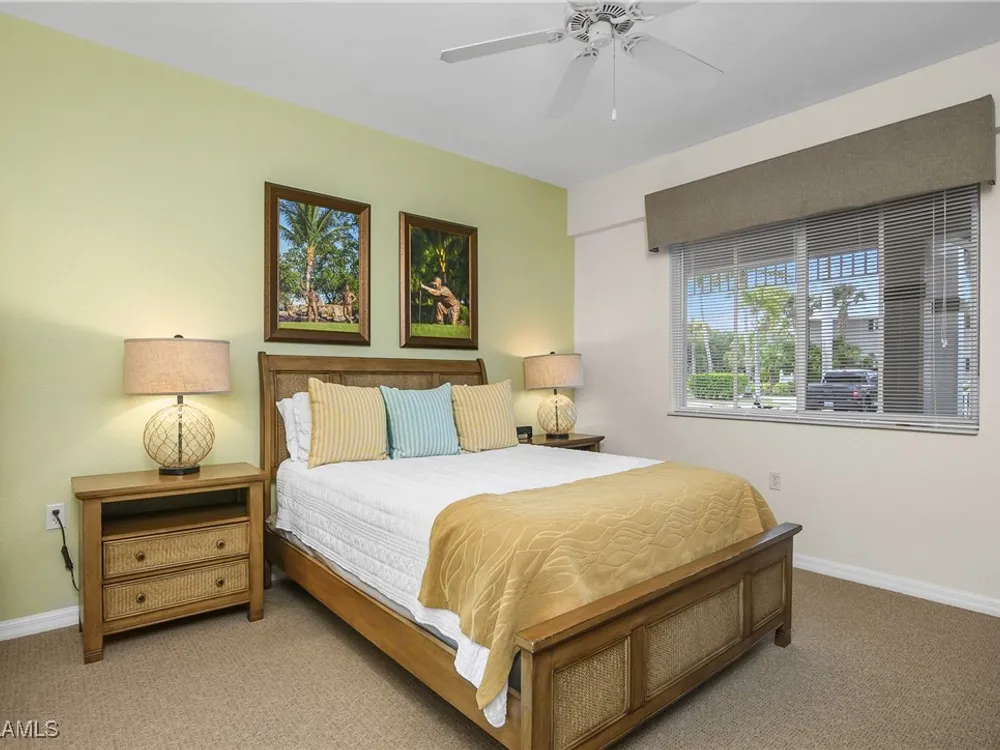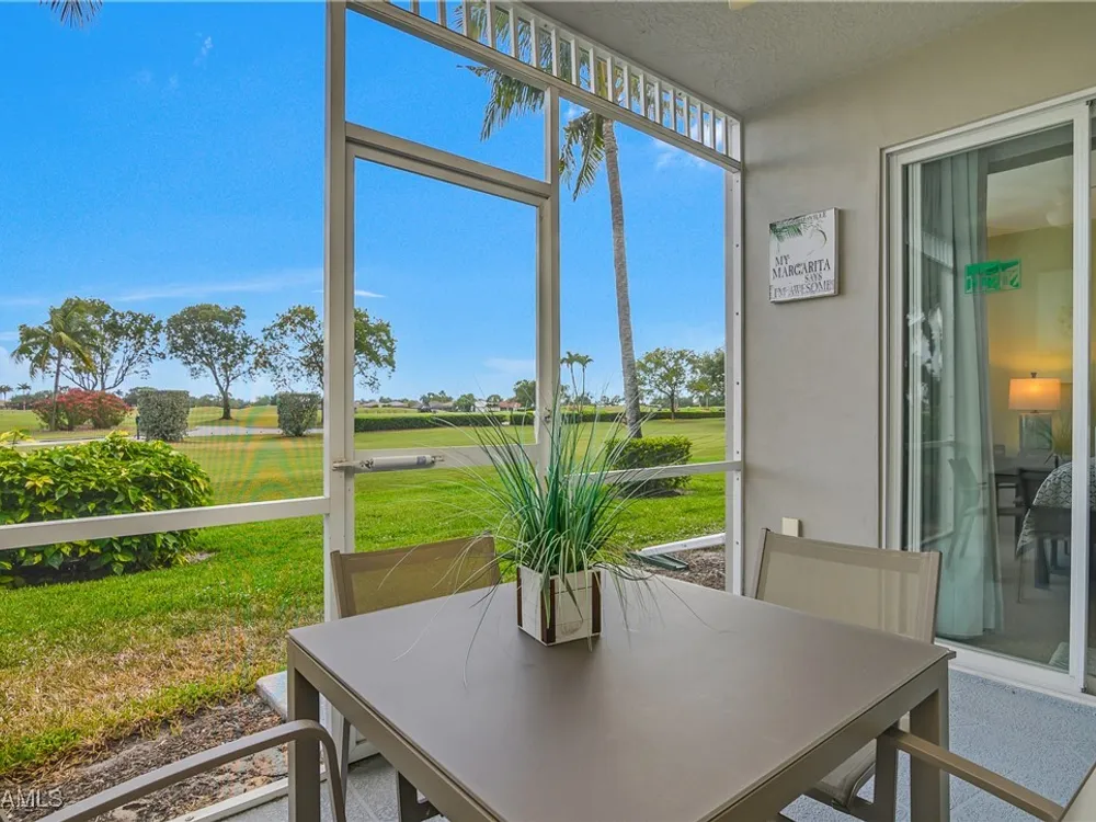 This fully furnished 2-bedroom, 2-bath first-floor condo is located in Greenlinks at Lely Resort, offering beautiful views of the Lely Flamingo golf course and driving range. Conveniently situated next to Sam Snead’s Tavern, you can easily stroll over for lunch or dinner. The condo is turnkey ready, complete with furnishings, bed and bath linens, and housewares package. The kitchen features granite countertops, a pantry, and a stacked washer and dryer. The spacious master bedroom includes golf course views and two large walk-in closets. The master bath boasts a walk-in tile shower, dual vanities, and a garden tub, while the guest bath also has a large walk-in tile shower and can be accessed directly from the guest bedroom, creating the option for a second master suite. Both bathrooms have updated lighting and mirrors. Greenlinks offers outstanding amenities, including two tennis courts, a pickleball court, shuffleboard, bocce ball, a resort-style pool and spa, and a clubhouse with a fitness center.