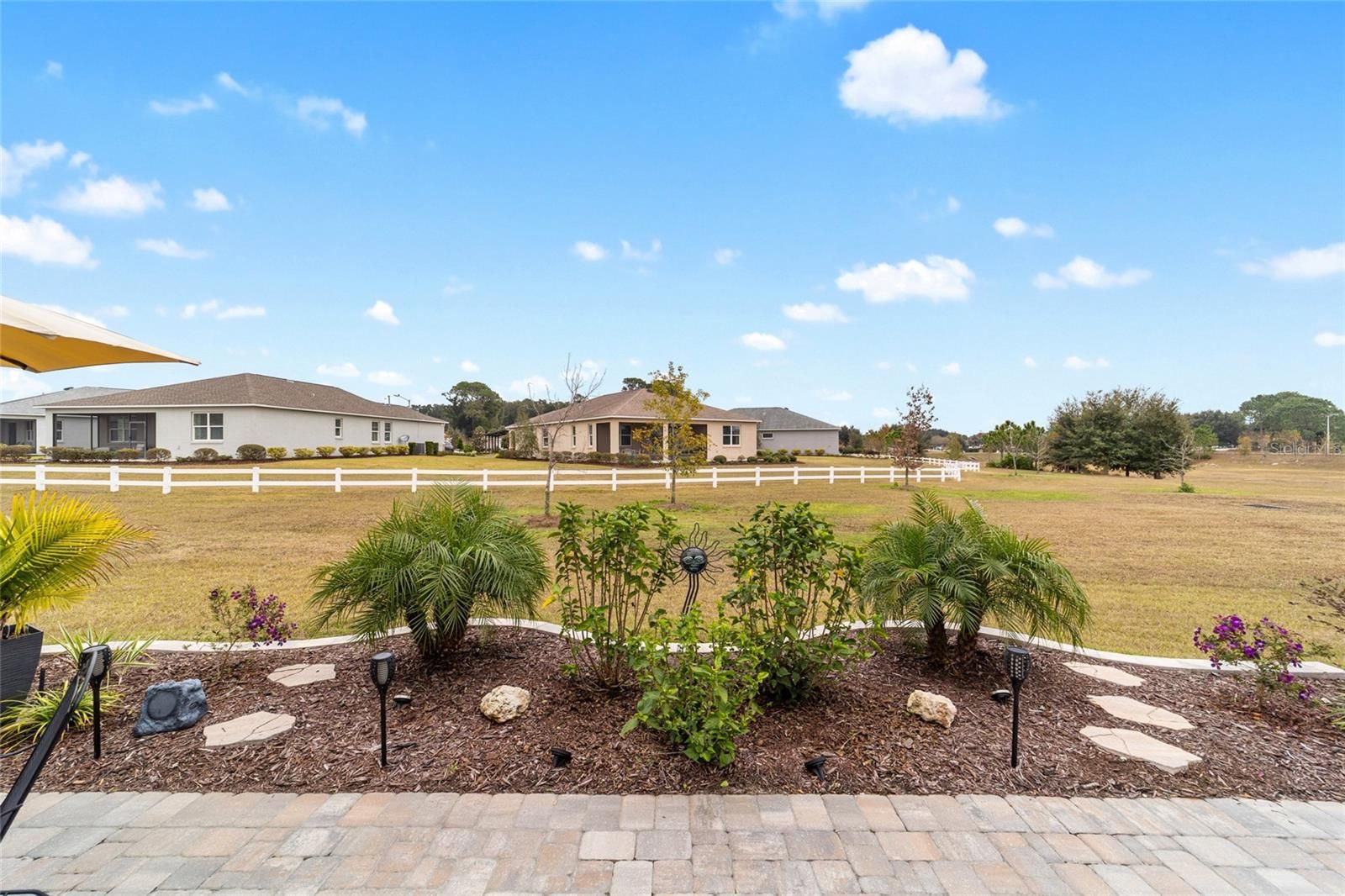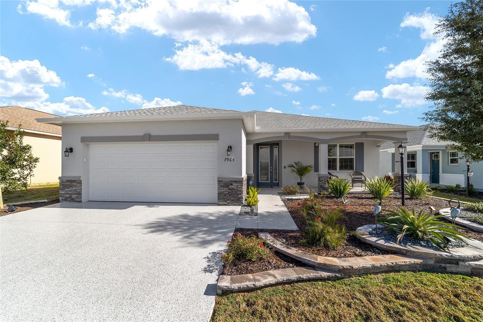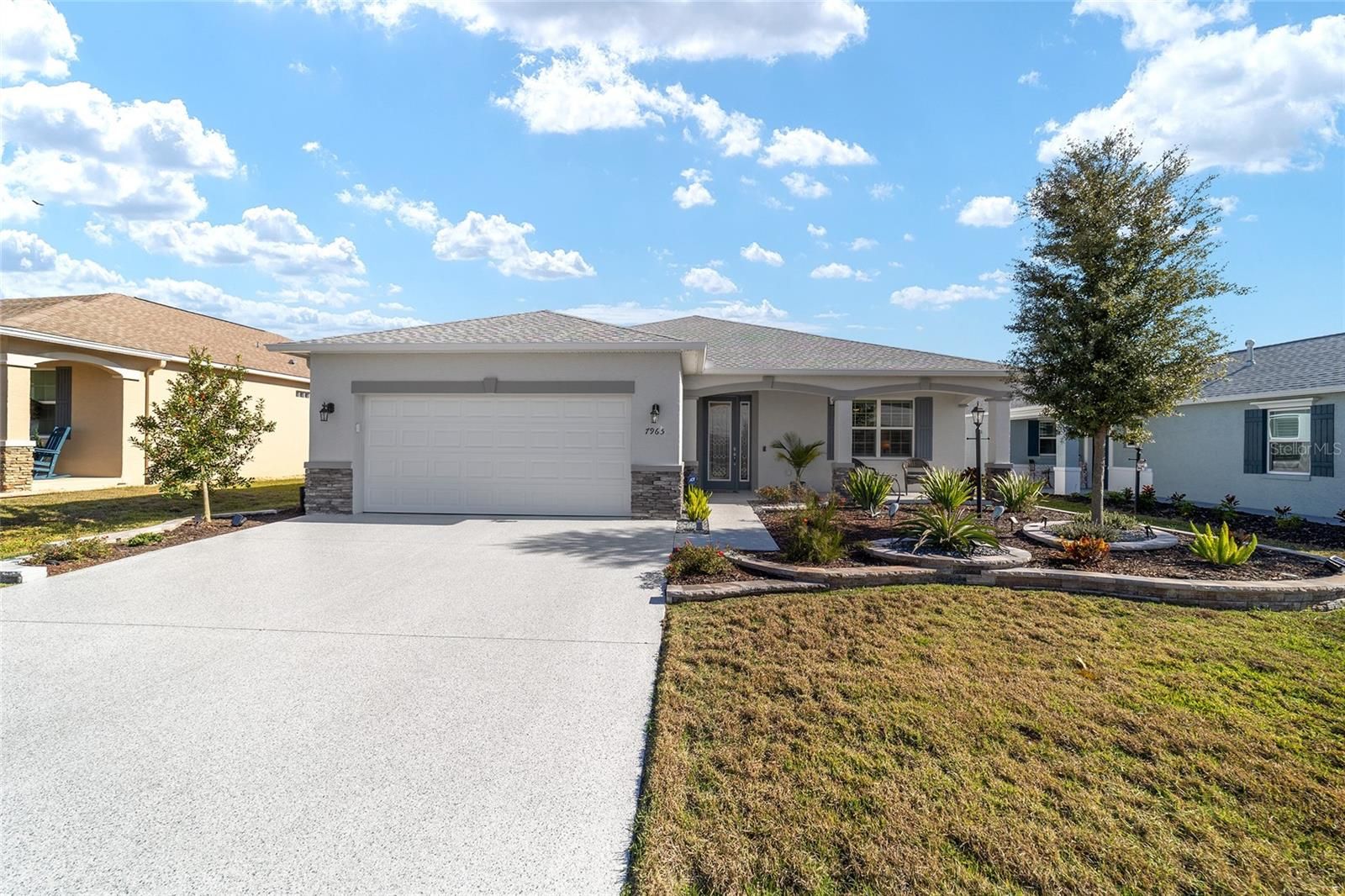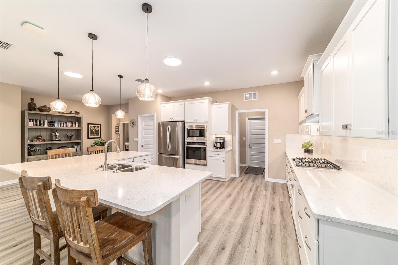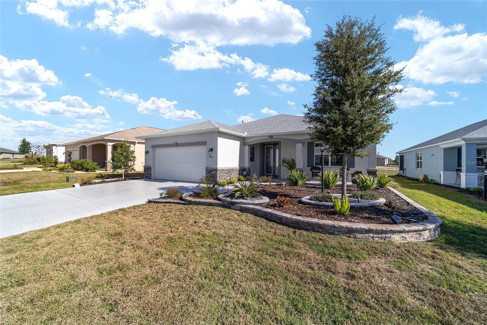 Looking for a Wisteria in Weybourne Landing with tons of upgrades? Look no further! This 2023-built Wisteria is a true showstopper, offering 3 bedrooms, 2 bathrooms, and a 4' extended 2-car garage situated on a premium lot. Step inside to a gourmet kitchen that any chef will love featuring a spacious island, under-cabinet lighting, quartz counters and backsplash, walk-in pantry, and stainless-steel appliances including a built-in oven/microwave and a gas cooktop. The staggered white cabinets are beautifully finished with crown molding, dovetail drawers, and soft-close hardware. The primary suite includes two walk-in closets with custom shelving and an elegant ensuite bathroom with dual sinks and an oversized walk-in shower with upgraded tile. Throughout the home, enjoy luxury vinyl plank flooring, shutter blinds, tray ceilings, crown molding, extra recessed lighting, designer fans and fixtures, and diamond-epoxied driveway, garage, and lanai. Outdoor living is a highlight with an eastern-facing lanai and custom patio offering deep space between rear neighbors and a distant southern view of the Candler golf course. Enhanced curb appeal comes from raised landscape beds and an upgraded front elevation. This home is truly extraordinary. Weybourne Landing offers fee-simple ownership, low HOA fees, and private amenities including a swimming pool, pickleball, mini-golf, fitness center, clubhouse, and curbside waste collection. On Top of the World is Ocala's premier 55+ active adult golf resort community, providing golf-cart access to shopping, dining, entertainment, health services, and more.