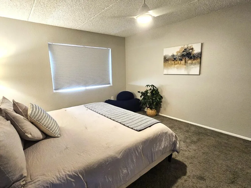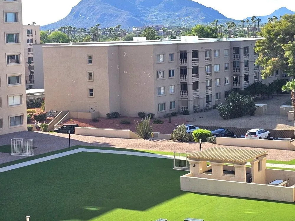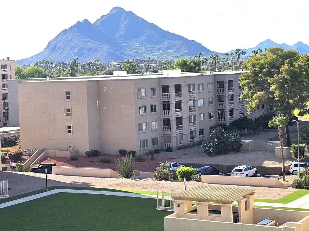Welcome to resort-style living in this charming 1 bed/1 bath 5th floor end unit condo located in guard-gated Scottsdale Shadows. Furnishings included in sale per Seller. In addition, you'll love the convenience of your own stacked washer & dryer right in unit. Updated/well-maintained & offering comfort & style, perfect for full or part-time residence. HOA fee inc A/C, heat, H20, garbage & all amenities. Elec plug ins extra. You can relax on your private balcony with mountain views. Assigned underground parking w/EZ building access. The community offers amenities galore including private golf course, 3 sparkling pools, spas, fitness center, workshop, clubhouse, tennis & more. Don't miss this opportunity to live in this prime Scottsdale location! Note: pets by HOA approval.