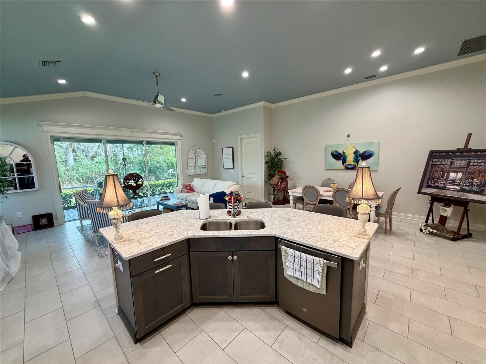 You must see this immaculate 2 bedroom, 2 bathroom, 1 flex room home located in the premier 55+ community of Lake James. This spacious home built by Ernie White Construction boats an open floor plan, a huge great room, crown molding, an up to date kitchen with wood cabinets, an island with breakfast bar, granite counter tops, stainless appliances, a large pantry, 3 car garage with a mini split AC unit, an inside laundry room with a utility sink, paver driveway, and a large screened-in lanai. There is a flex room that could be used as a 3rd bedroom, den, study, or library. The master bathroom suite has a walk-in shower, double sinks, water closet, and a giant walk-in closet. The community amenities include a heated pool, a clubhouse, a fitness center, a library, walking trails, and games such as shuffleboard, bocce ball, and horseshoes. Lawn care, lawn spraying, Spectrum TV, and internet are also included in HOA fees. The property is conveniently located to many shopping centers, parks, grocery stores, the mall, and I-4 for easy commutes to Orlando and Tampa. Set up your showing today.