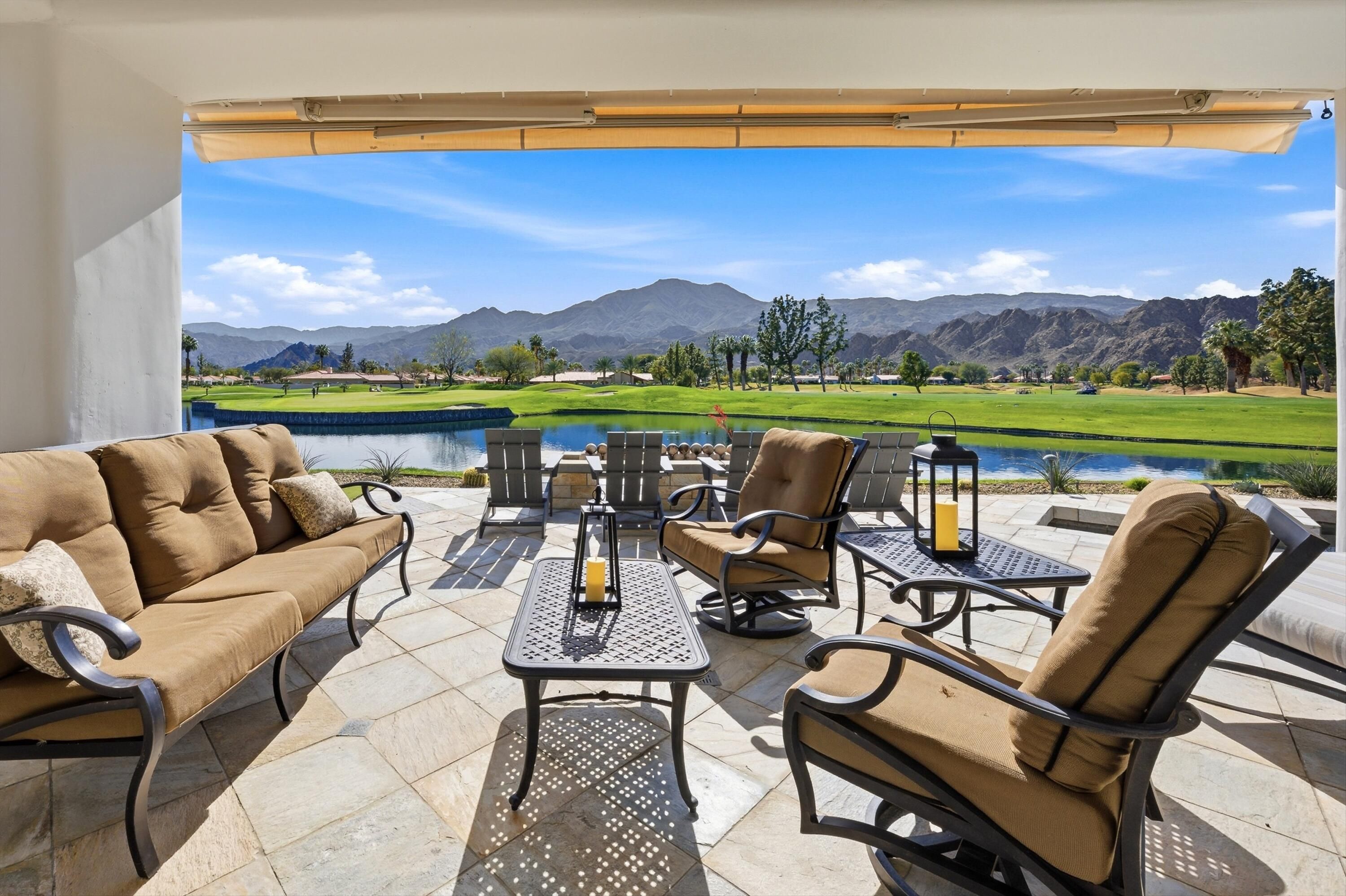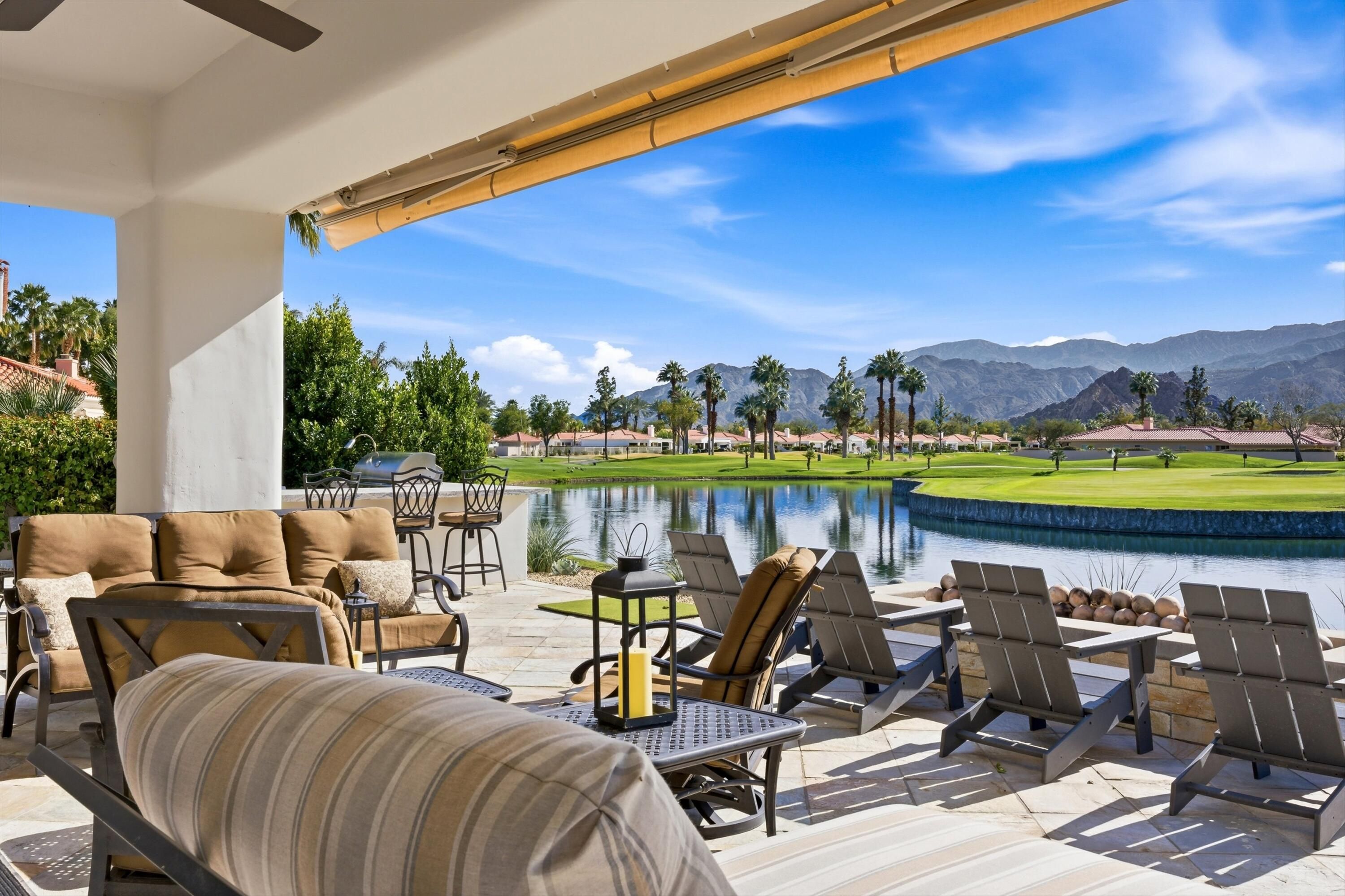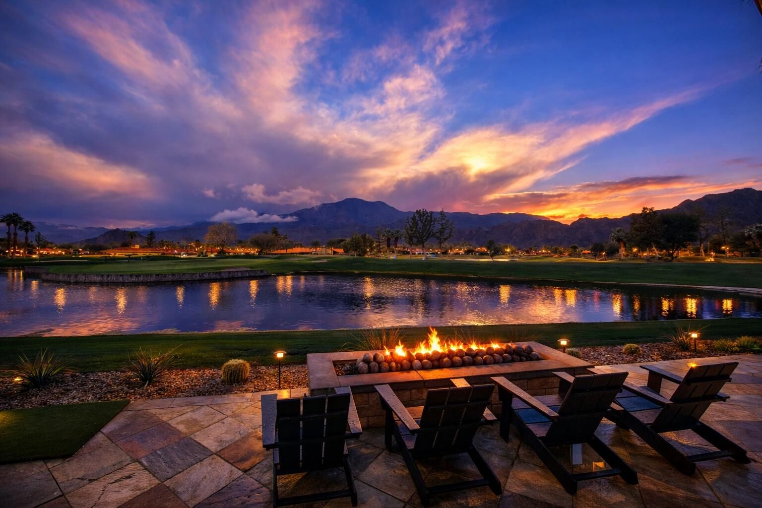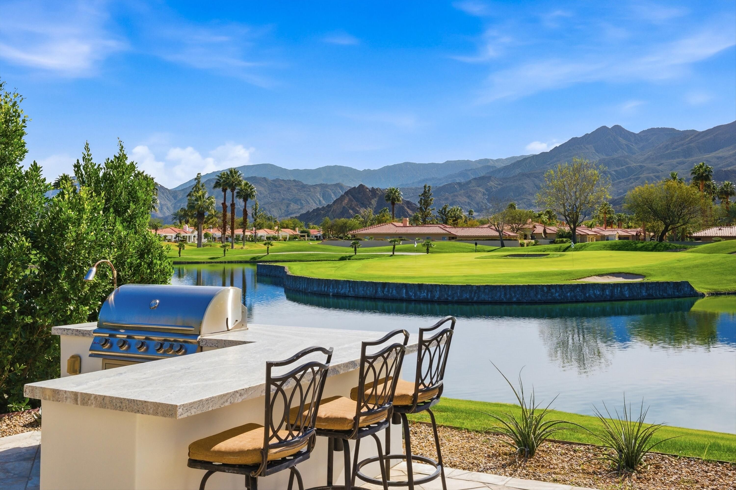One of the most sought-after locations in PGA West. This is a rare opportunity to own on one of the most coveted streets in the community, offering panoramic lake, golf course, and Santa Rosa Mountain views that truly feel endless. Positioned directly across from the clubhouse, this home delivers one of the most convenient and desirable settings in all of PGA West. Featuring 4 bedrooms and 4.5 bathrooms, including a private detached casita, the layout is ideal for hosting family and guests while maintaining privacy. A striking dual-sided fireplace creates warmth and architectural interest between the main living areas, while expansive windows frame the Santa Rosa Mountains, allowing you to enjoy breathtaking views from nearly every primary room in the home. The newly refreshed courtyard is enhanced by a tranquil water feature, adding a sense of arrival and serene ambiance the moment you enter. The residence has been thoughtfully remodeled and enhanced, including fresh exterior paint, and upgraded outdoor living spaces designed for year-round desert enjoyment. The backyard patio captures breathtaking views while remaining safely positioned out of range from errant golf shots, providing both scenery and peace of mind. Enjoy evenings around the dramatic outdoor firepit, entertain with the built-in BBQ area, and stay comfortable even in warmer months with the integrated misting system. The location places you just moments from the private clubhouse, driving range, golf practice facilities, sports club with tennis, pickleball, fitness center, resort-style pool, and the community dog park. Offered furnished per inventory, this home provides a seamless opportunity to begin enjoying the PGA West lifestyle immediately. Opportunities on streets like this rarely come available.