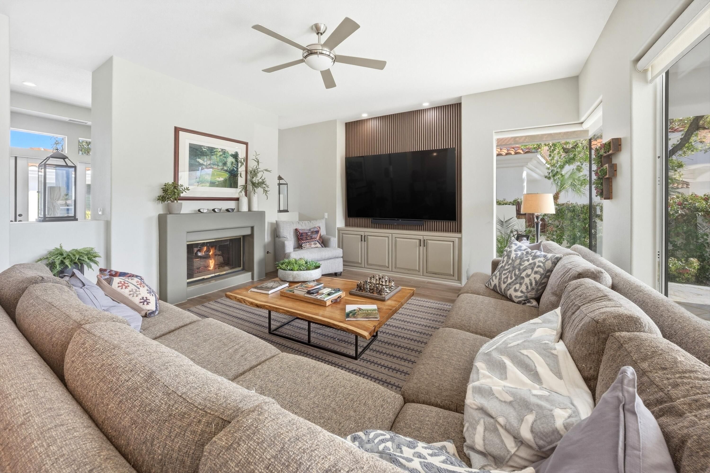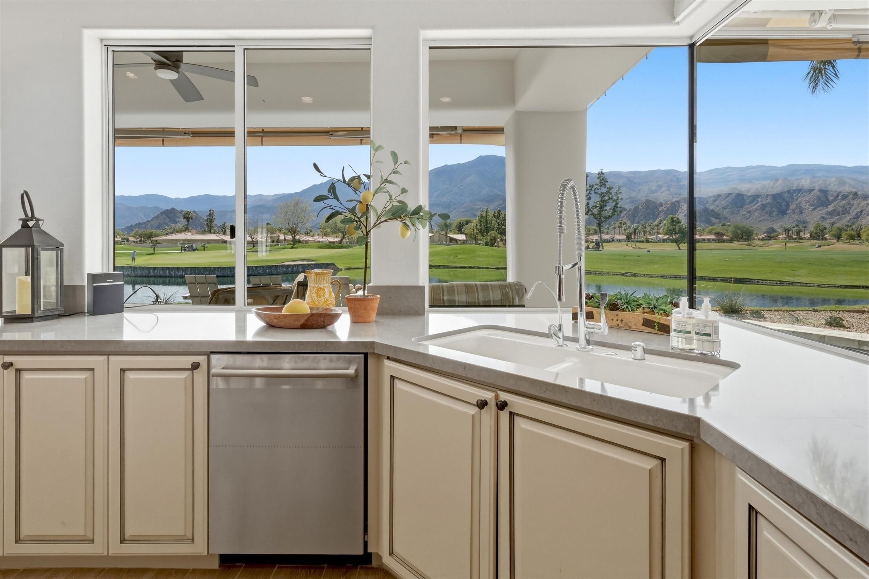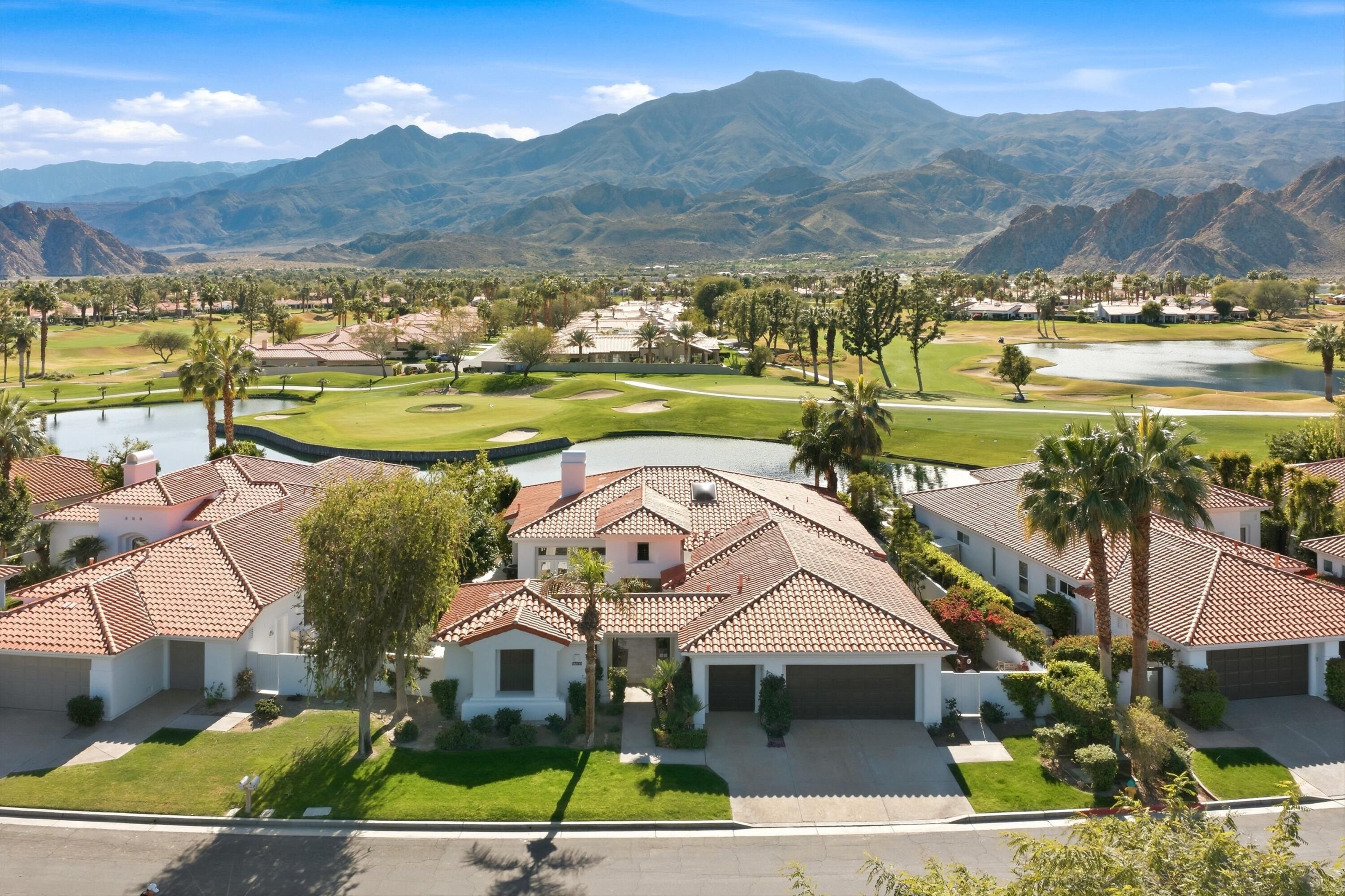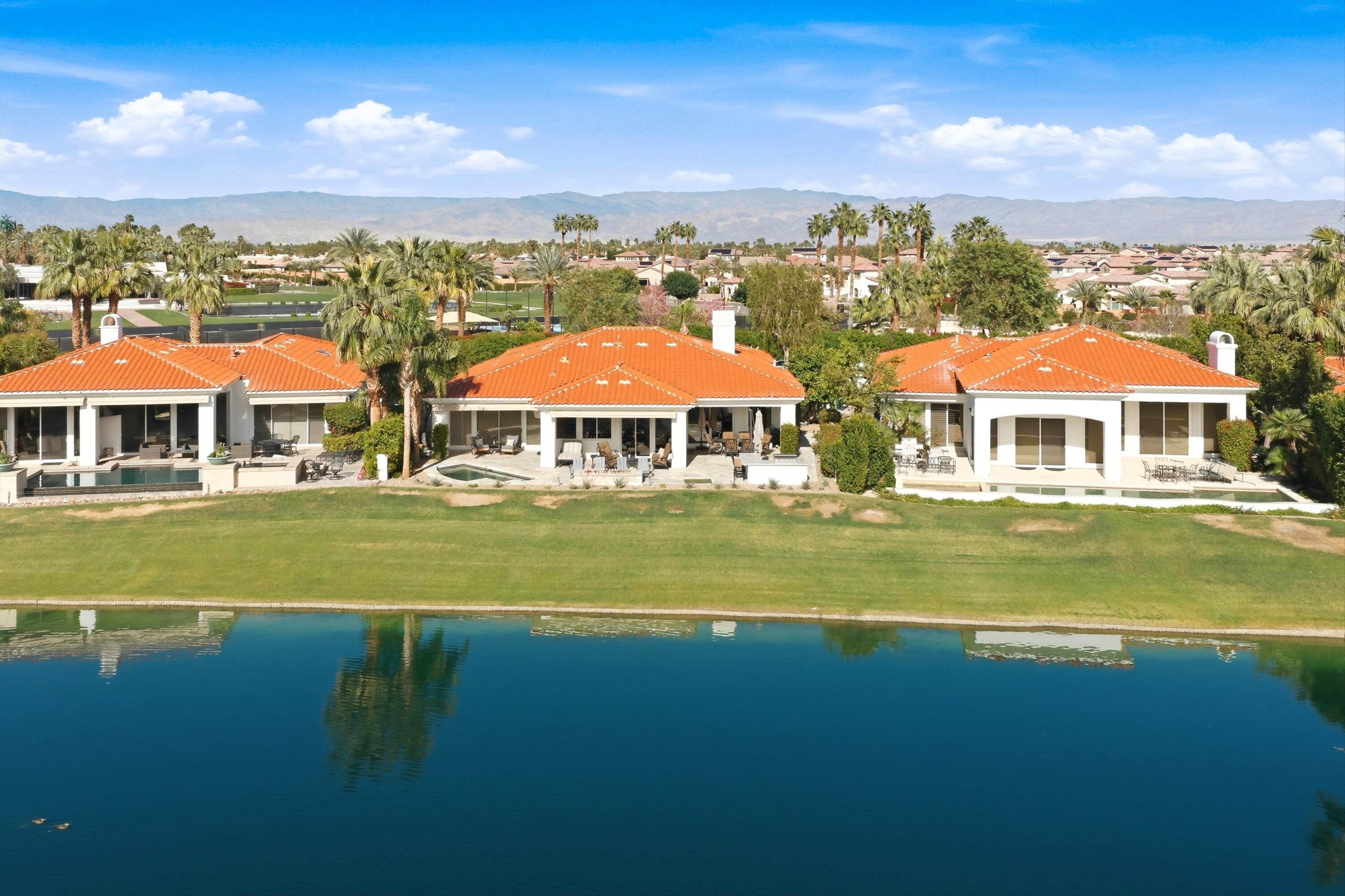 One of the most sought-after locations in PGA West. This is a rare opportunity to own on one of the most coveted streets in the community, offering panoramic lake, golf course, and Santa Rosa Mountain views that truly feel endless. Positioned directly across from the clubhouse, this home delivers one of the most convenient and desirable settings in all of PGA West. Featuring 4 bedrooms and 4.5 bathrooms, including a private detached casita, the layout is ideal for hosting family and guests while maintaining privacy. A striking dual-sided fireplace creates warmth and architectural interest between the main living areas, while expansive windows frame the Santa Rosa Mountains, allowing you to enjoy breathtaking views from nearly every primary room in the home. The newly refreshed courtyard is enhanced by a tranquil water feature, adding a sense of arrival and serene ambiance the moment you enter. The residence has been thoughtfully remodeled and enhanced, including fresh exterior paint, and upgraded outdoor living spaces designed for year-round desert enjoyment. The backyard patio captures breathtaking views while remaining safely positioned out of range from errant golf shots, providing both scenery and peace of mind. Enjoy evenings around the dramatic outdoor firepit, entertain with the built-in BBQ area, and stay comfortable even in warmer months with the integrated misting system. The location places you just moments from the private clubhouse, driving range, golf practice facilities, sports club with tennis, pickleball, fitness center, resort-style pool, and the community dog park. Offered furnished per inventory, this home provides a seamless opportunity to begin enjoying the PGA West lifestyle immediately. Opportunities on streets like this rarely come available.
