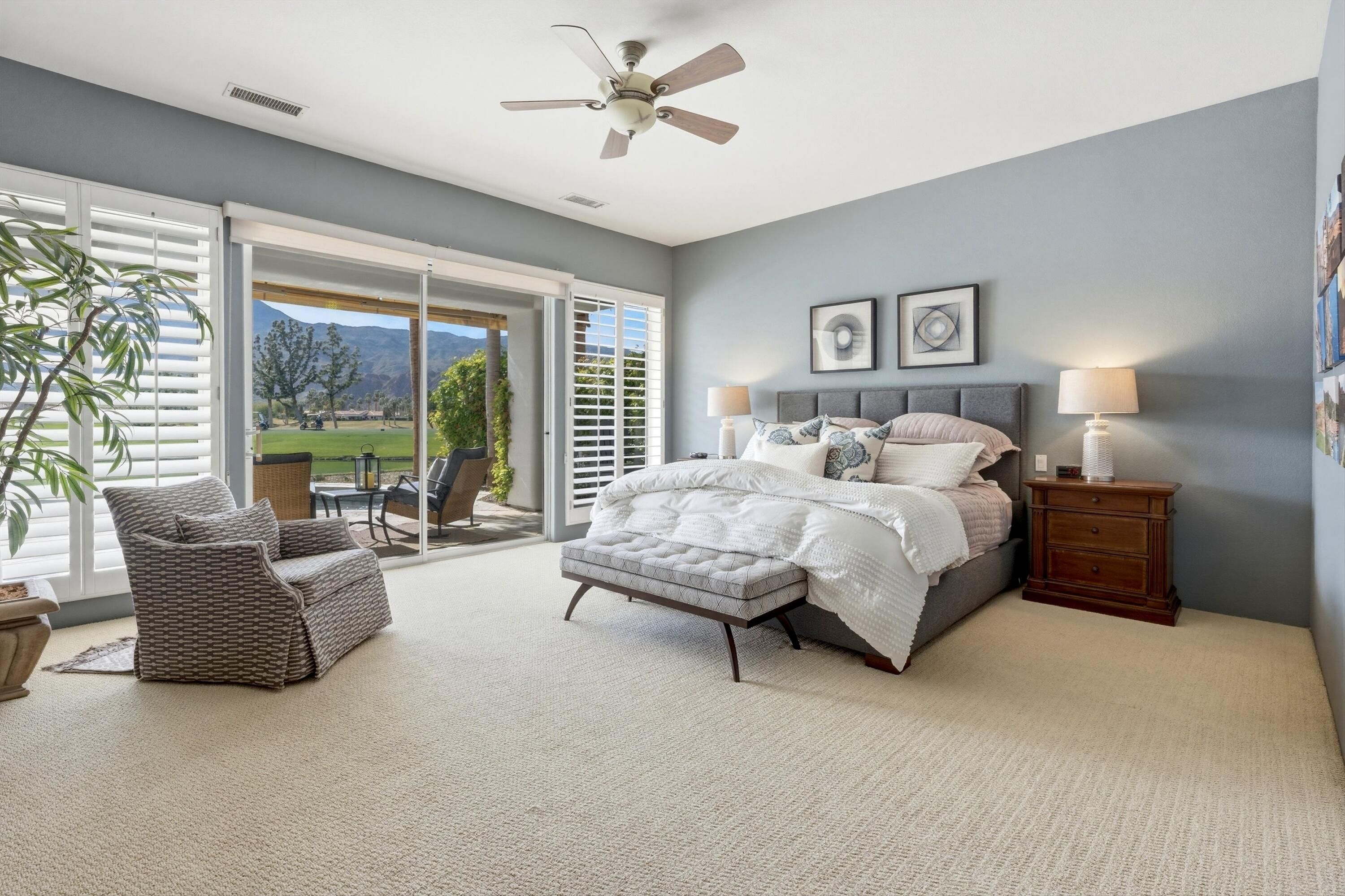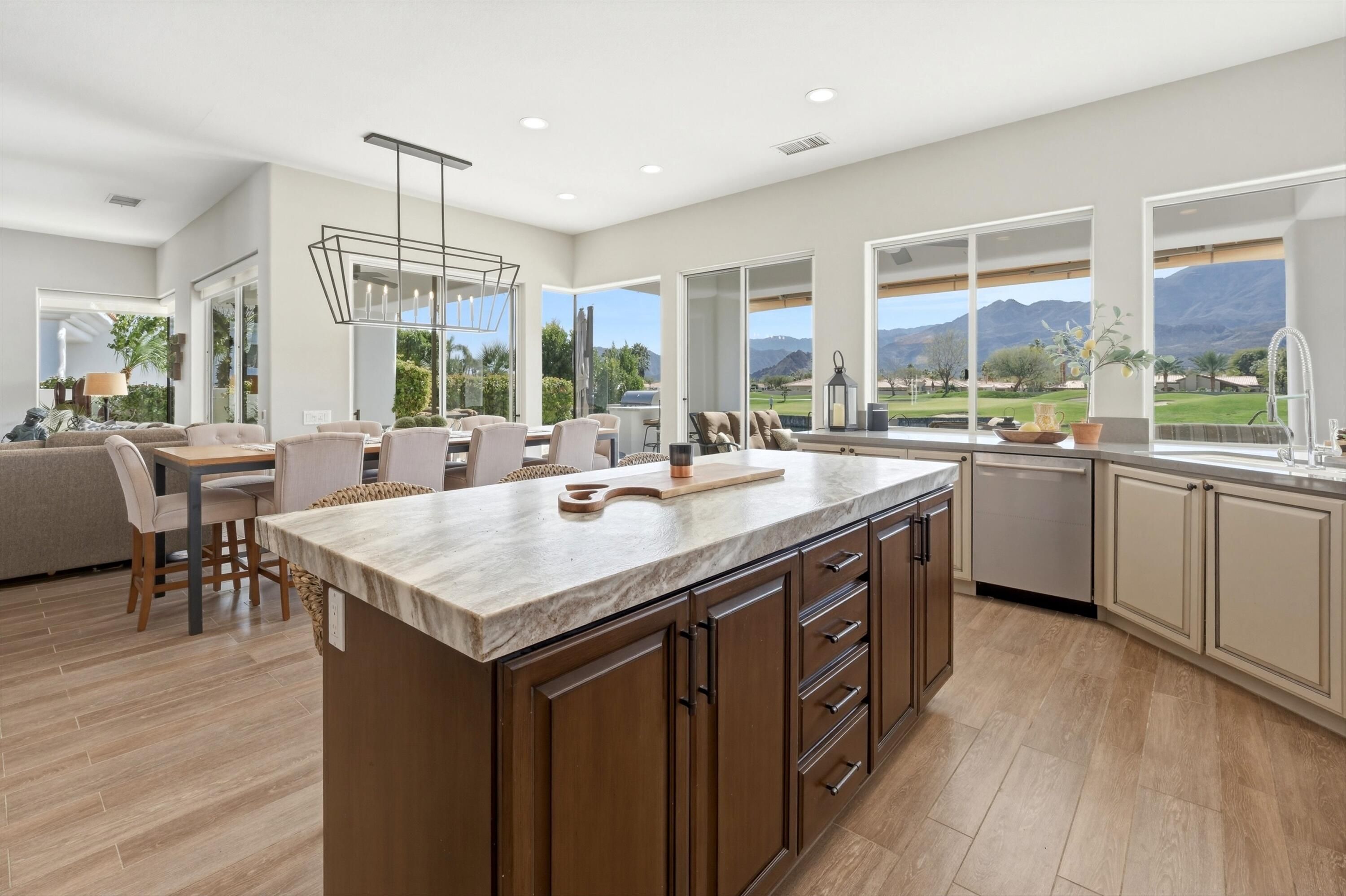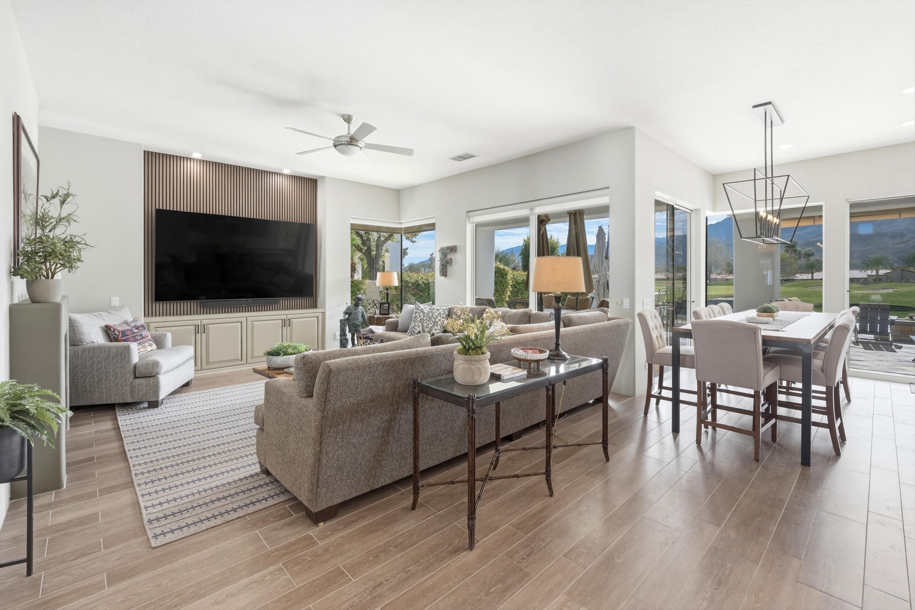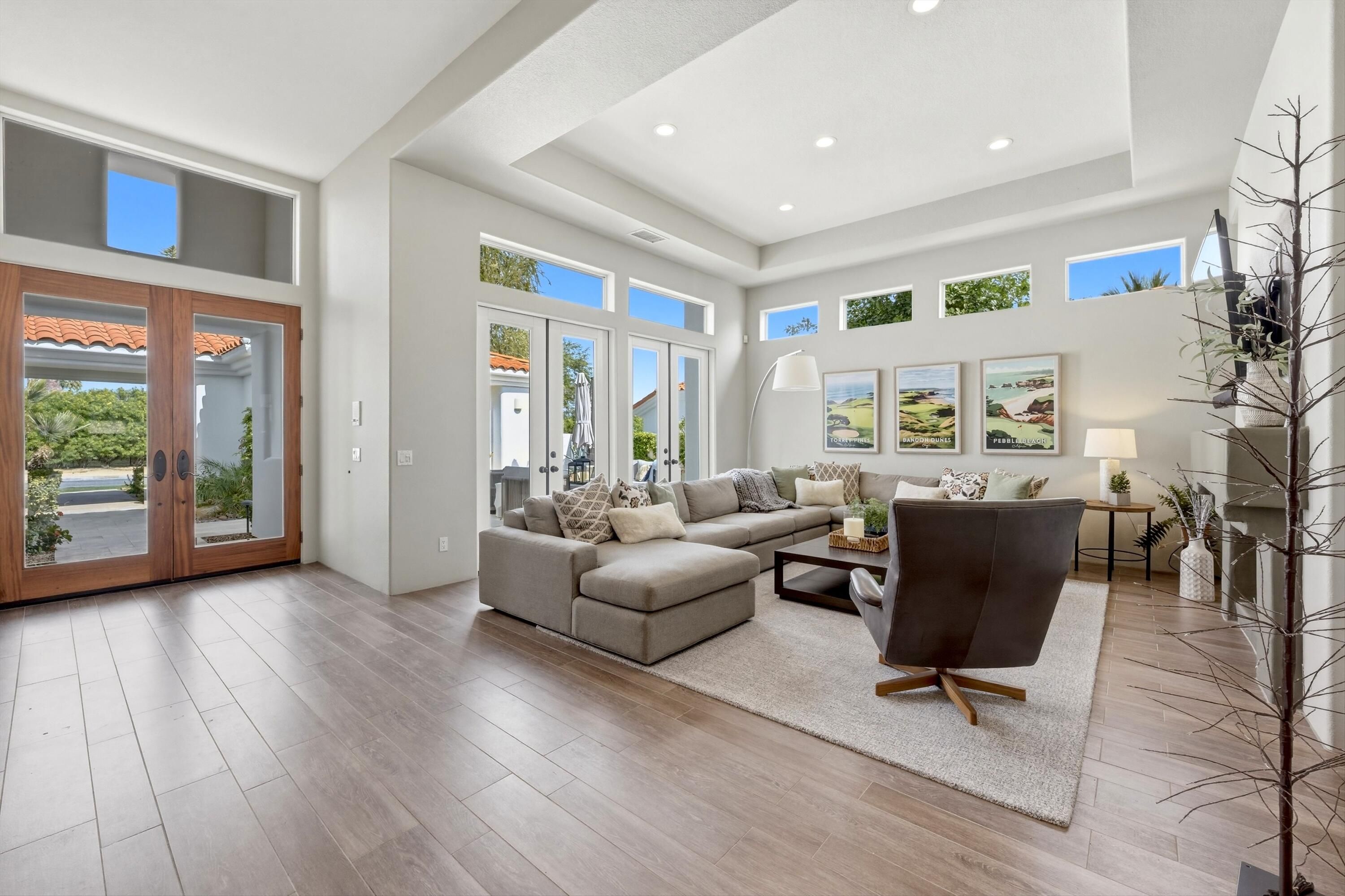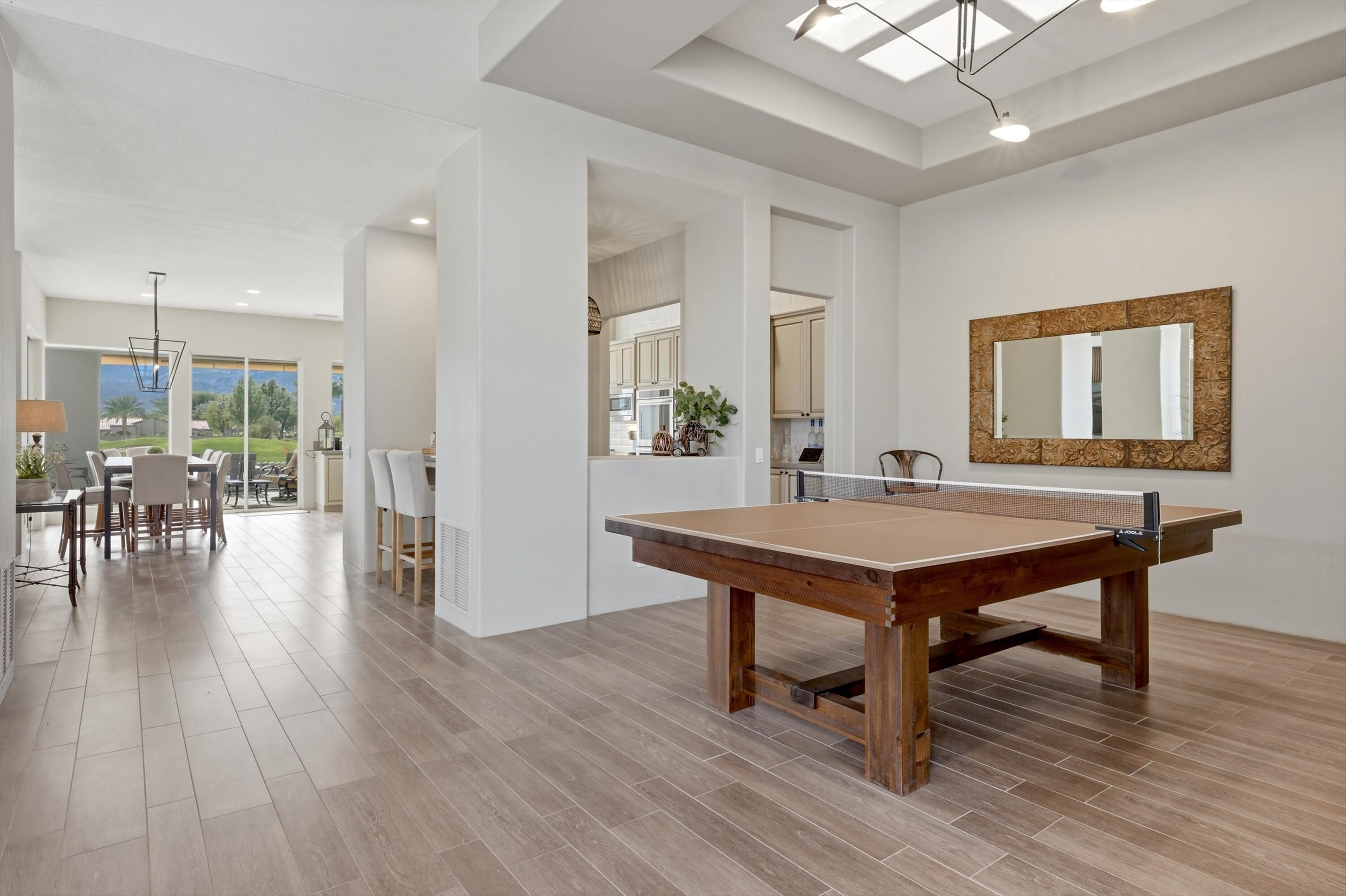 One of the most sought-after locations in PGA West. This is a rare opportunity to own on one of the most coveted streets in the community, offering panoramic lake, golf course, and Santa Rosa Mountain views that truly feel endless. Positioned directly across from the clubhouse, this home delivers one of the most convenient and desirable settings in all of PGA West. Featuring 4 bedrooms and 4.5 bathrooms, including a private detached casita, the layout is ideal for hosting family and guests while maintaining privacy. A striking dual-sided fireplace creates warmth and architectural interest between the main living areas, while expansive windows frame the Santa Rosa Mountains, allowing you to enjoy breathtaking views from nearly every primary room in the home. The newly refreshed courtyard is enhanced by a tranquil water feature, adding a sense of arrival and serene ambiance the moment you enter. The residence has been thoughtfully remodeled and enhanced, including fresh exterior paint, and upgraded outdoor living spaces designed for year-round desert enjoyment. The backyard patio captures breathtaking views while remaining safely positioned out of range from errant golf shots, providing both scenery and peace of mind. Enjoy evenings around the dramatic outdoor firepit, entertain with the built-in BBQ area, and stay comfortable even in warmer months with the integrated misting system. The location places you just moments from the private clubhouse, driving range, golf practice facilities, sports club with tennis, pickleball, fitness center, resort-style pool, and the community dog park. Offered furnished per inventory, this home provides a seamless opportunity to begin enjoying the PGA West lifestyle immediately. Opportunities on streets like this rarely come available.
