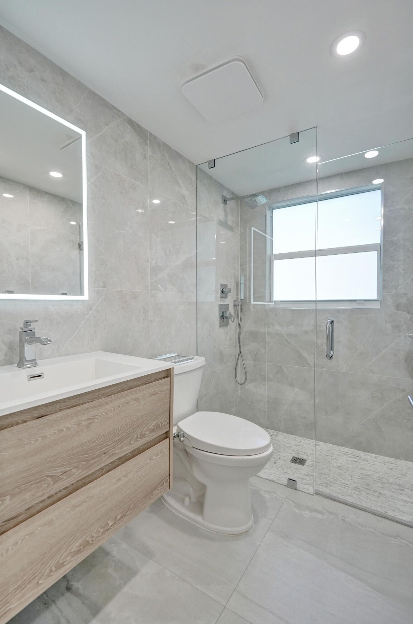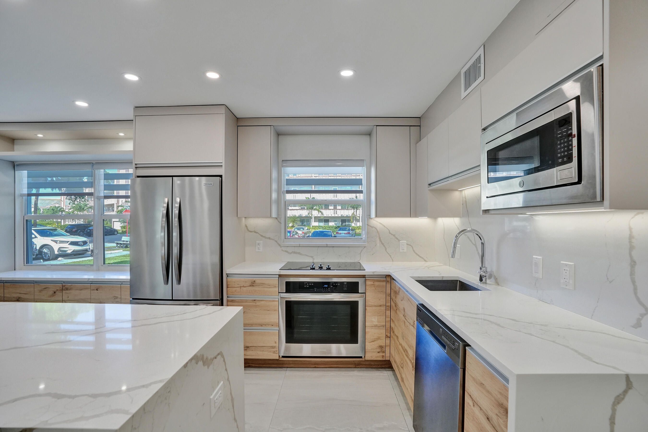 Beautifully renovated and filled with natural light, this first-floor corner unit showcases high-end finishes and thoughtful upgrades throughout. The custom kitchen features quartz countertops, a full backsplash, under-cabinet lighting, and all-new appliances. Additional highlights include all impact windows, a new electric water heater, updated electrical panel, recessed lighting in every room, and 36x36 porcelain tile flooring throughout. Both bathrooms have been completely redone, and the unit is enhanced by custom built-in closets and a sleek built-in TV unit. Located in one of the few two-story condo buildings, this corner unit benefits from wraparound windows and a spacious, airy feel. The assigned parking space is just steps from the front door, offering exceptional convenience.