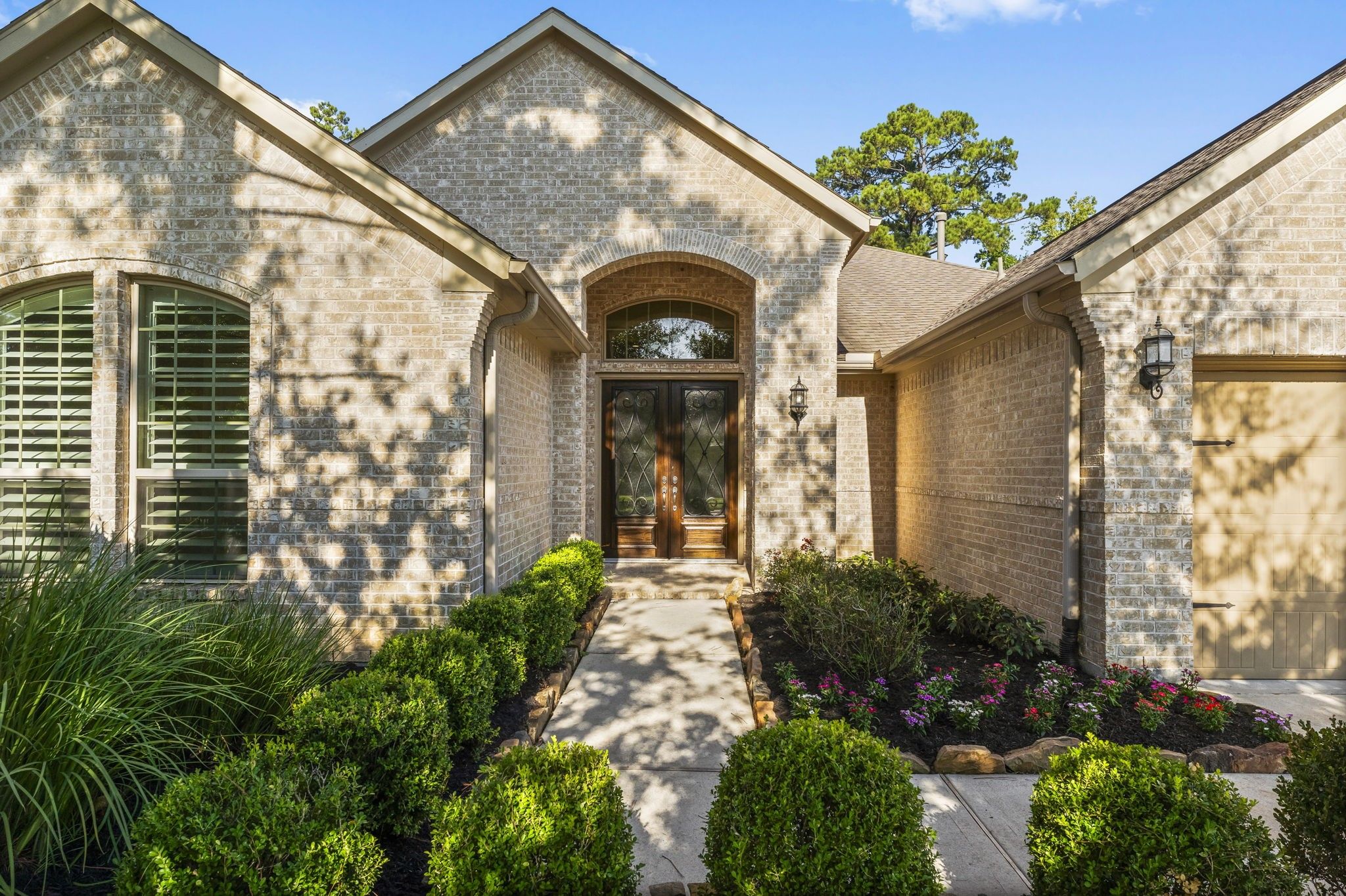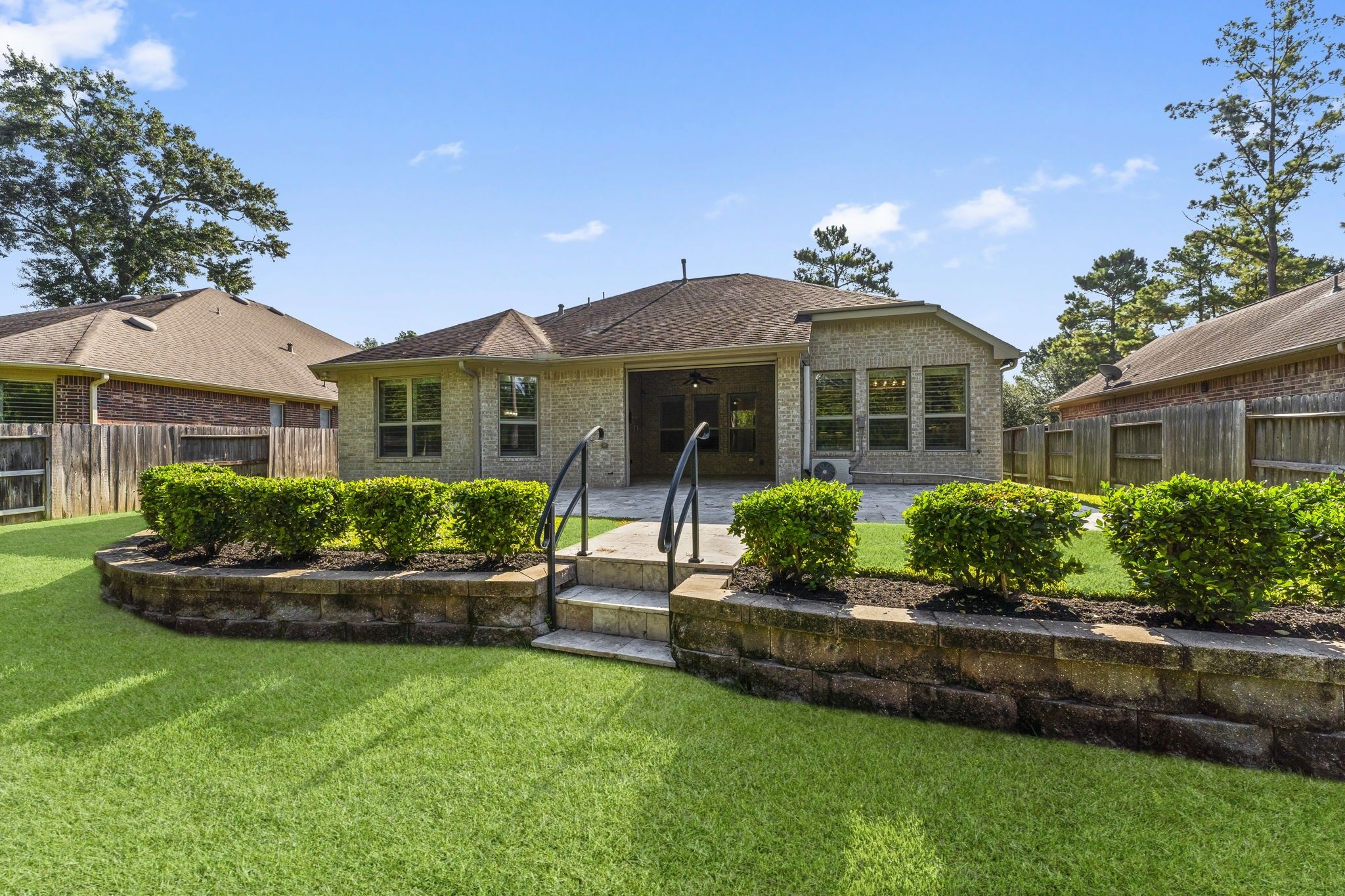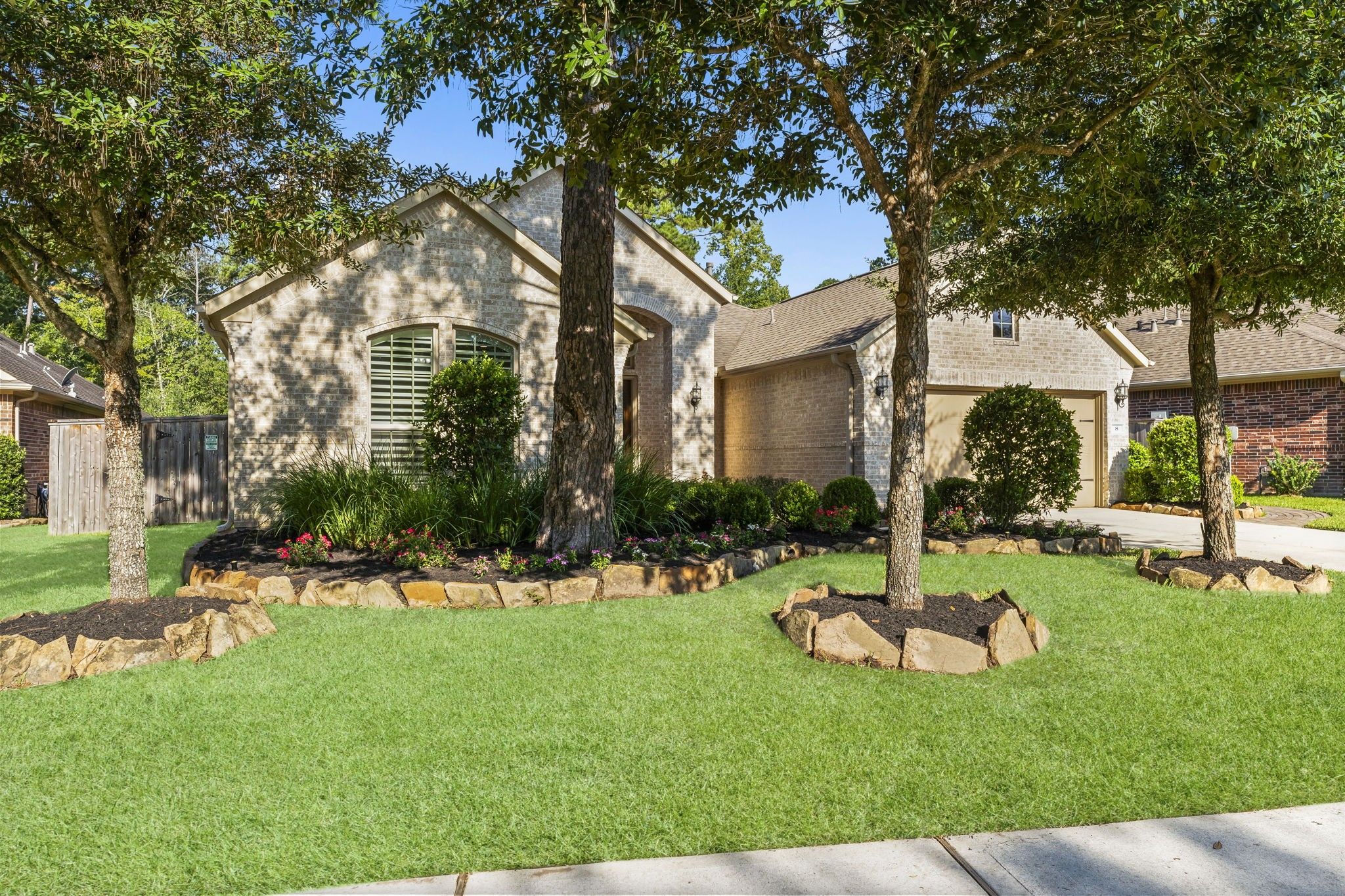 Beautifully maintained 2 bed, 2.5 bath home located on a prime cul-de-sac lot with no back neighbors in the prestigious 55+ Bonterra neighborhood within the master-planned community of Woodforest! This home has striking curb appeal with professional landscaping and a charming double-door entry. Upon entry you will have a secondary bedroom and a private study with glass french doors. The spacious chef style kitchen features a large island with bar seating, double ovens, a gas cooktop, and abundant cabinetry, all opening seamlessly to the living and dining areas. The primary suite is filled with natural light and features a spa-like ensuite with a walk-in tub, separate walk-in shower, and two generously sized walk-in closets, one with access to the laundry room. Step outside to the oversized covered patio complete with roll-down screens and a cozy fireplace. Experience the active Bonterra lifestyle with access to a clubhouse, fitness center, pool/spa, pickleball courts, and so much more!