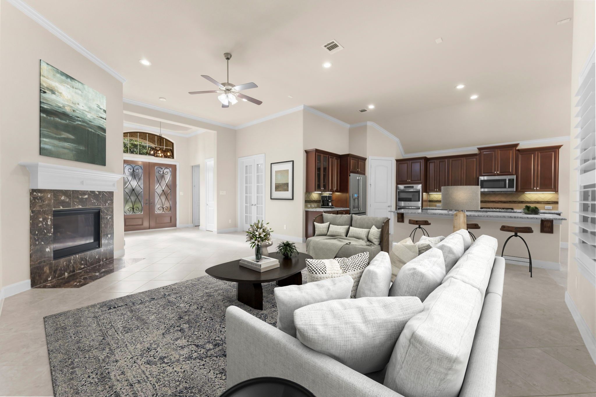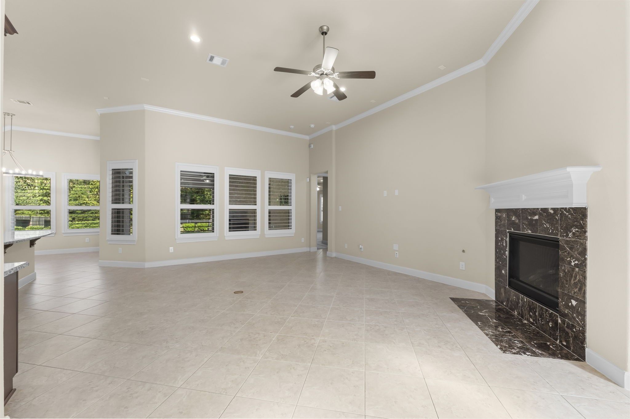 - Double Vanity, Kitchen Island, Kitchen/Family Room Combo, Bath in Primary Bedroom, Pantry, Soaking Tub, Separate Shower, Tub Shower, Makeup/Vanity Space, Ceiling Fan(s), Kitchen/Dining Combo, Programmable Thermostat