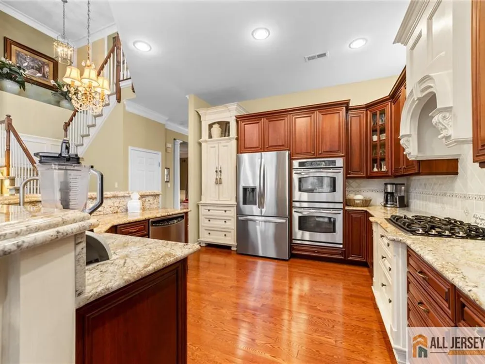 Welcome to the pinnacle of luxury living in the sought-after prestigious Regency active adult community! This immaculate, custom-designed home is nestled on a premium lot and framed by lush, professionally landscaped grounds and a paver walkway that invites you to the stunning front entrance. Step inside to a grand foyer boasting gleaming inlaid wood floors that flow throughout, flanked by an elegant formal living room and refined formal dining roomboth featuring tray ceilings, chair rail molding, shadow box trim, stately columns, and oversized picture windows that flood the space with natural light. The perfect space to host your guests. At the heart of the home is the breathtaking gourmet eat-in kitchen, a chef's dream with custom cabinetry, a center island with sink, a breakfast bar, double wall ovens, and a designer tile backsplash. The sun-drenched breakfast nook flows seamlessly into the dramatic two-story family room, where custom built-in bookcases surround a gas fireplace and soaring windows frame the picturesque backyard. Sliders lead to a spectacular, partially covered Trex deckperfect for morning coffee or evening cocktailsall surrounded by mature, manicured landscaping for total privacy. The luxurious first-floor primary suite is a true retreat with a tray ceiling, crown molding, & double French doors that lead into a spa-like en suite bath with a custom vanity boasting two sinks, a soaking tub with stone surround, & an oversized glass shower with a built-in bench & exquisite tile work. A walk-in closet with built-in organizers completes the suite. A second spacious bedroom on the main level includes beadboard trim, crown molding, hardwood floors, & a large closetideal for guests or a home office. The stylish main bath offers an upgraded vanity and upscale finishes. A well-appointed laundry room with slop sink provides direct access to the oversized two-car garage. Upstairs, you'll find a sprawling loft overlooking the family room, a private full bath, and two generously sized bedroomsperfect for extended family, hobby space, or visiting grandkids. Need more space? The expansive full basement offers unlimited storage and future finishing potential. For ultimate comfort and peace of mind, enjoy a whole-house generator, newer hot water heater, sprinkler system, security system, and a brand-new (1 month old!) two-zone HVAC system. Live the resort lifestyle every day with Regency's world-class amenities: a gorgeous clubhouse with full-service restaurant, indoor and outdoor pools, aerobics and dance studios, sauna, library, arts and crafts rooms, tennis, pickleball, bocce, walking and biking trails, card and billiards room, a fitness center, and even a playground for grandkids. Plus, enjoy access to a beautiful golf course right within the community. This is more than a homeit's a lifestyle. And this one-of-a-kind residence shows like a model. Don't miss the opportunity to make it yours!
