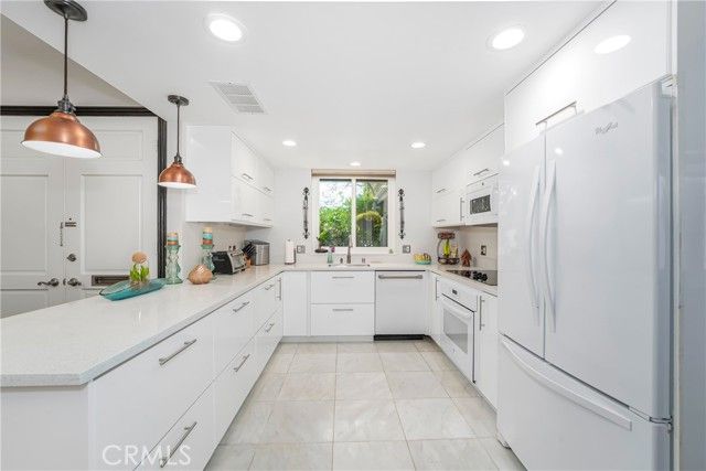 Stunning Remodeled Single level living with no one above or below you!! Welcome to this beautifully reimagined Granada-model—the finest on the market! From the moment you step through the double door entry, you'll be captivated by the stylish, open floorplan featuring vaulted ceilings, gleaming hardwood floors, with an abundance of natural light. The flexible dining area is perfect for intimate dinners or entertaining many guests, highlighted by sunlight streaming through the attached atrium. The WOW-factor kitchen showcases bright white cabinetry, quartz countertops, and stainless accents. This fabulous kitchen has been opened to the living area, keeping the cook part of the conversation and festivities. The spacious primary bedroom easily accommodates any furniture arrangement and features a huge wardrobe closet and new contemporary carpeting. The secondary bedroom offers versatility—ideal as a guest room, den, or office—and includes a large mirrored wardrobe and plenty pf storage. The designer-inspired bathroom is truly five-star with a dual sink vanity, ample drawer storage, skylight, and custom walk-in shower. Thoughtful upgrades throughout include fresh, modern paint, custom doors and moldings, high-end window treatments, and more. Additional comfort features: Dual-pane vinyl windows and sliders, Central A/C & Heat, Inside laundry, Sunny, private patio and front porch offers a relaxing vibe and is surrounded by lush landscaping. The Carport is nearby + ample guest parking, and convenient parking right in front of your own home. Located in the heart of Laguna Woods, this home offers premier 55+ living at it finest with access to world-class amenities including golf courses, driving range, putting greens, fitness centers, swimming pools, art, sewing, photography and wood working studios, tennis courts, pickle ball, Horace trails & stables, bocce ball, archery range, lawn bowling, billiards room, golf kart paths throughout, garden areas, private RV parking, amphitheater, Restaurant with a fabulous view and many social clubs to name a few! Conveniently located near stores, Restaurants, freeways and Beaches. Don’t miss this wonderful opportunity to call this home.
