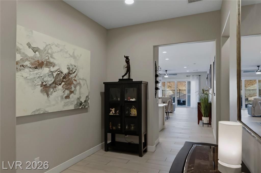 Experience resort-style living in this exclusive cliffside enclave, beautifully situated in Rainbow Canyon with sweeping valley views. Enter through a large courtyard into luxury living with 10-foot ceilings and an open layout. Secondary bedrooms privately positioned at front of the home w/ full bath between. Spacious den offers flexibility as a home office, fitness room, or additional bedroom. Chef’s kitchen features soft-close cabinetry, quartz countertops, a 144-bottle dual-zone wine cabinet, and premium finishes. Enjoy whole-house water filtration and softener, automated blinds, a $19K custom primary closet with vanity, EV-dedicated circuit, and epoxy garage floor. Step outside to a backyard oasis with water feature, lush landscaping, and serene views. Includes a $25K value transferable Lake Las Vegas Sports Club membership with access to fitness classes, pickleball, golf, social events, resort dining, shopping, and water sports—embracing the ultimate Lake Las Vegas lifestyle.