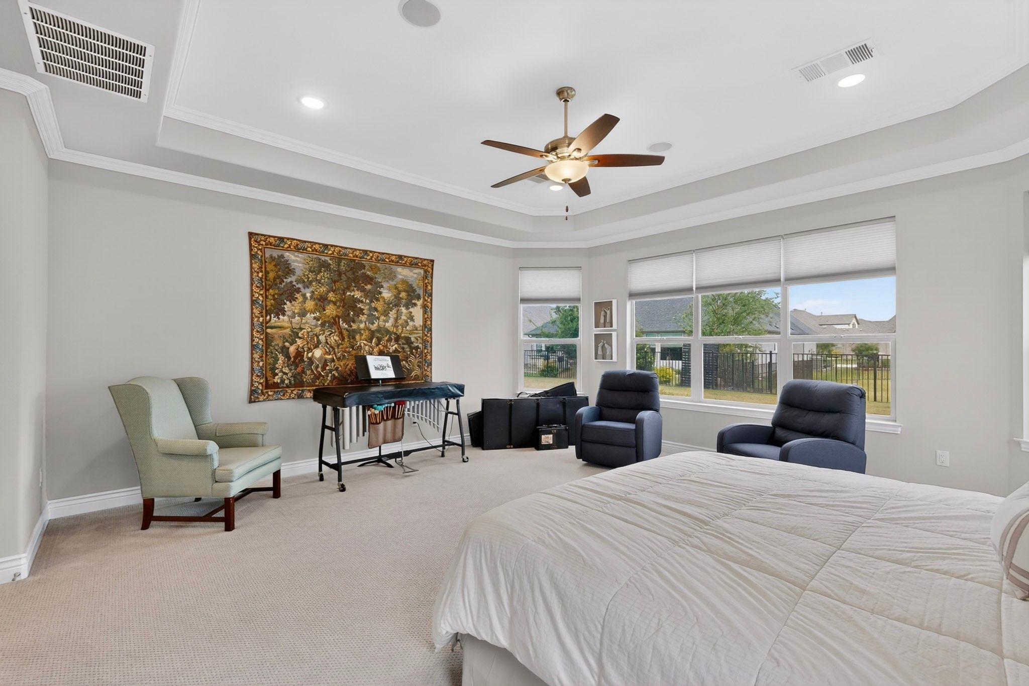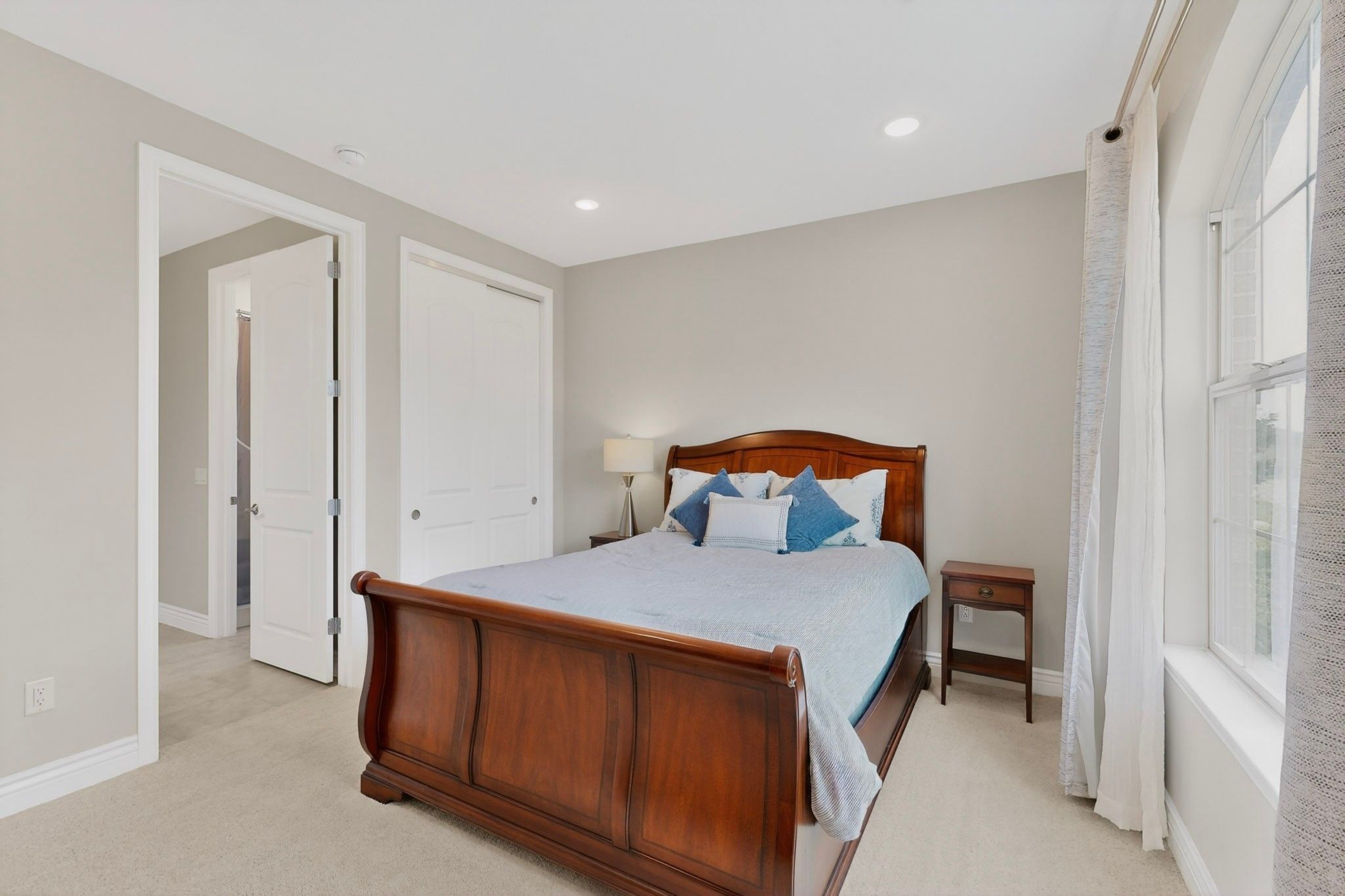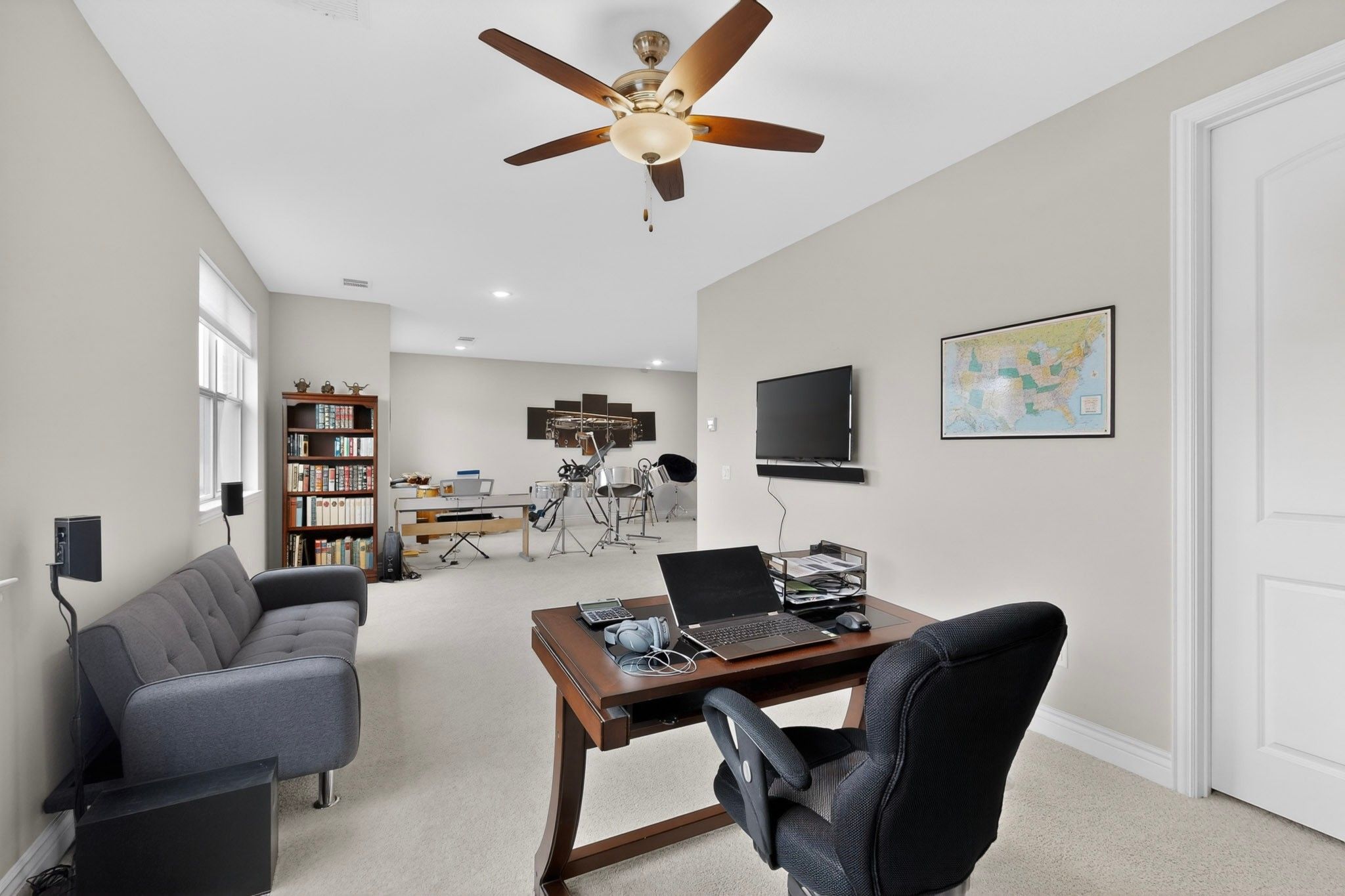 Welcome to this stunning all-brick Ashland two-story home—a rare find in a desirable 55+ community that perfectly blends timeless elegance, thoughtful accessibility, and low-maintenance living. A stately permanent lighted flagpole greets you with quiet patriotism, full three-car garage with keypad. Step inside through the gracious circular foyer and immediately feel at home. Beautiful hardwood floors grace the living areas, including the inviting living room where a ceiling fan and built-in recessed ceiling speakers for relaxed evenings or lively gatherings. The gourmet kitchen is the heart of the home, featuring a generous center island with seating, elegant crown molding, sparkling quartz countertops, designer pendant lighting, and custom maple cabinets with dovetailed soft-close drawers. Every detail has been considered: a convenient trash compactor, electric cooktop, Blanco sink, soap dispenser, a large walk-in pantry, and a butler’s pantry. The dining room offers refined charm with its tray ceiling, crown molding, and bay window. The primary suite, a true sanctuary with a bay window, tray ceiling, crown molding, and ceiling fan. The spa-inspired en-suite bath includes dual quartz vanities, makeup seating area, and a curbless walk-in shower with decorative banding, a bench seat, and an assist bar—thoughtfully designed for comfort. The guest bedroom has a double closet and tub-shower combination. The first-floor office provides ideal space for working from home or quiet reading. Upstairs, an expansive open loft with its own bath offers endless possibilities—whether you envision a guest bedroom, game room, music studio, craft room or a welcoming hangout for the grandkids. This home has been thoughtfully upgraded : pre-wiring for holiday lighting, illuminated stairway steps, generous under-stair storage, a whole-house surge protector, a variable-speed HVAC fan for quiet comfort, and a large patio with TV hookup—perfect for outdoor enjoyment