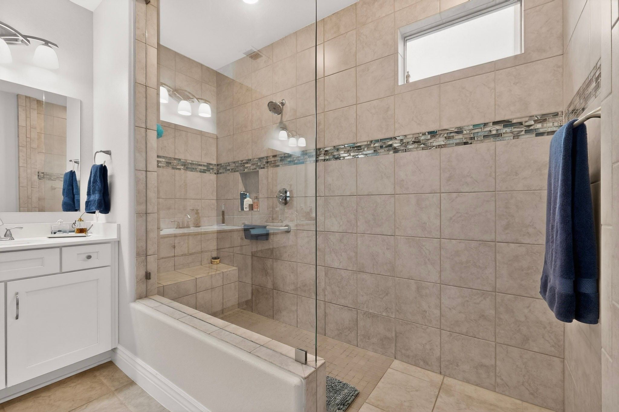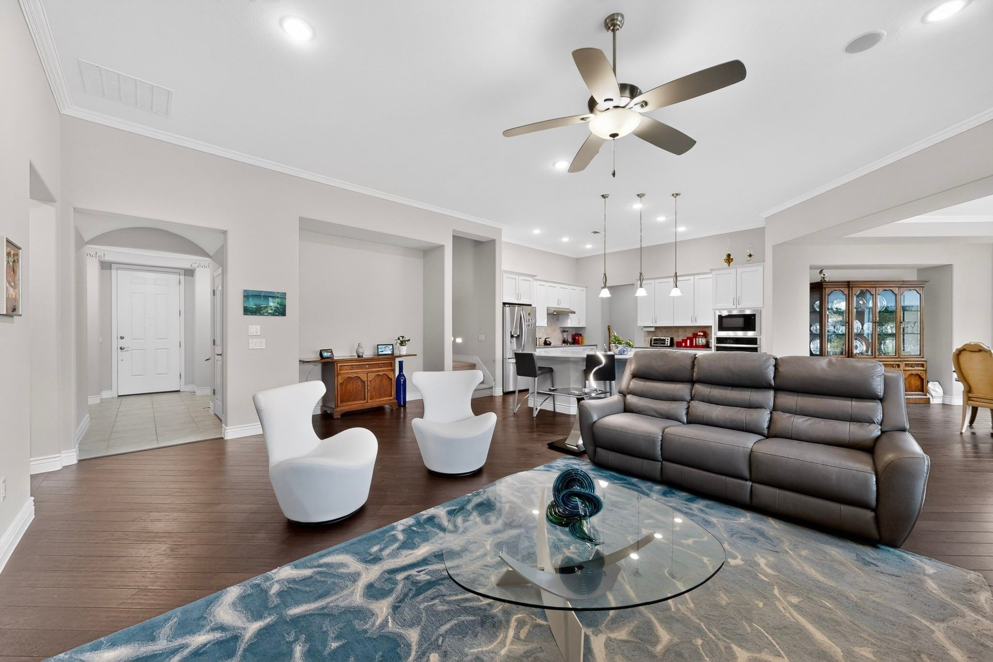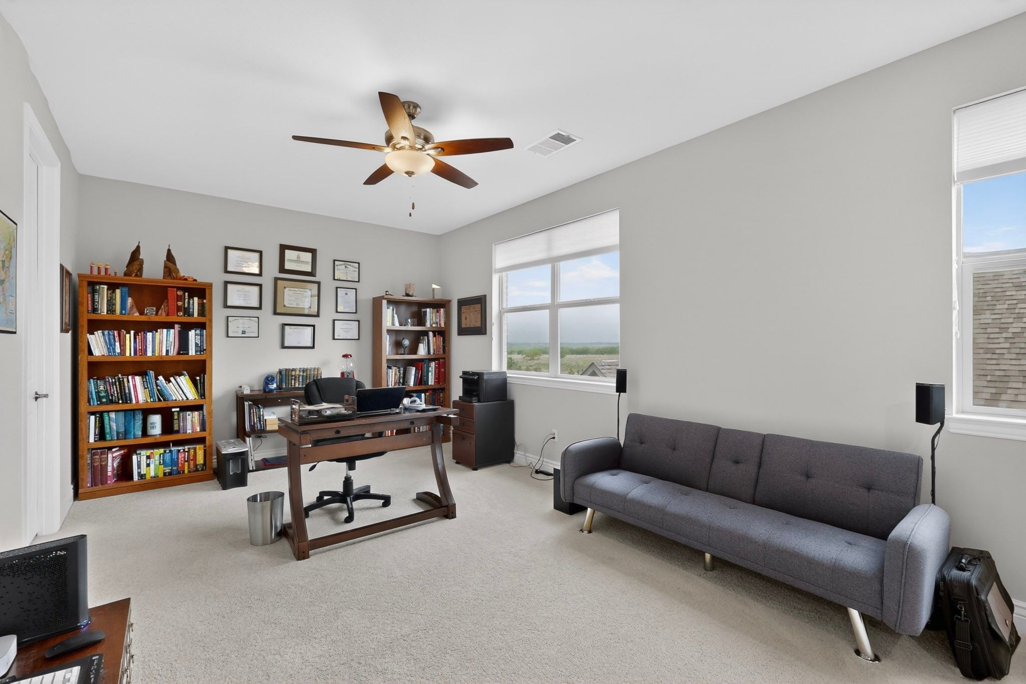 Welcome to this stunning all-brick Ashland two-story home—a rare find in a desirable 55+ community that perfectly blends timeless elegance, thoughtful accessibility, and low-maintenance living. A stately permanent lighted flagpole greets you with quiet patriotism, full three-car garage with keypad. Step inside through the gracious circular foyer and immediately feel at home. Beautiful hardwood floors grace the living areas, including the inviting living room where a ceiling fan and built-in recessed ceiling speakers for relaxed evenings or lively gatherings. The gourmet kitchen is the heart of the home, featuring a generous center island with seating, elegant crown molding, sparkling quartz countertops, designer pendant lighting, and custom maple cabinets with dovetailed soft-close drawers. Every detail has been considered: a convenient trash compactor, electric cooktop, Blanco sink, soap dispenser, a large walk-in pantry, and a butler’s pantry. The dining room offers refined charm with its tray ceiling, crown molding, and bay window. The primary suite, a true sanctuary with a bay window, tray ceiling, crown molding, and ceiling fan. The spa-inspired en-suite bath includes dual quartz vanities, makeup seating area, and a curbless walk-in shower with decorative banding, a bench seat, and an assist bar—thoughtfully designed for comfort. The guest bedroom has a double closet and tub-shower combination. The first-floor office provides ideal space for working from home or quiet reading. Upstairs, an expansive open loft with its own bath offers endless possibilities—whether you envision a guest bedroom, game room, music studio, craft room or a welcoming hangout for the grandkids. This home has been thoughtfully upgraded : pre-wiring for holiday lighting, illuminated stairway steps, generous under-stair storage, a whole-house surge protector, a variable-speed HVAC fan for quiet comfort, and a large patio with TV hookup—perfect for outdoor enjoyment