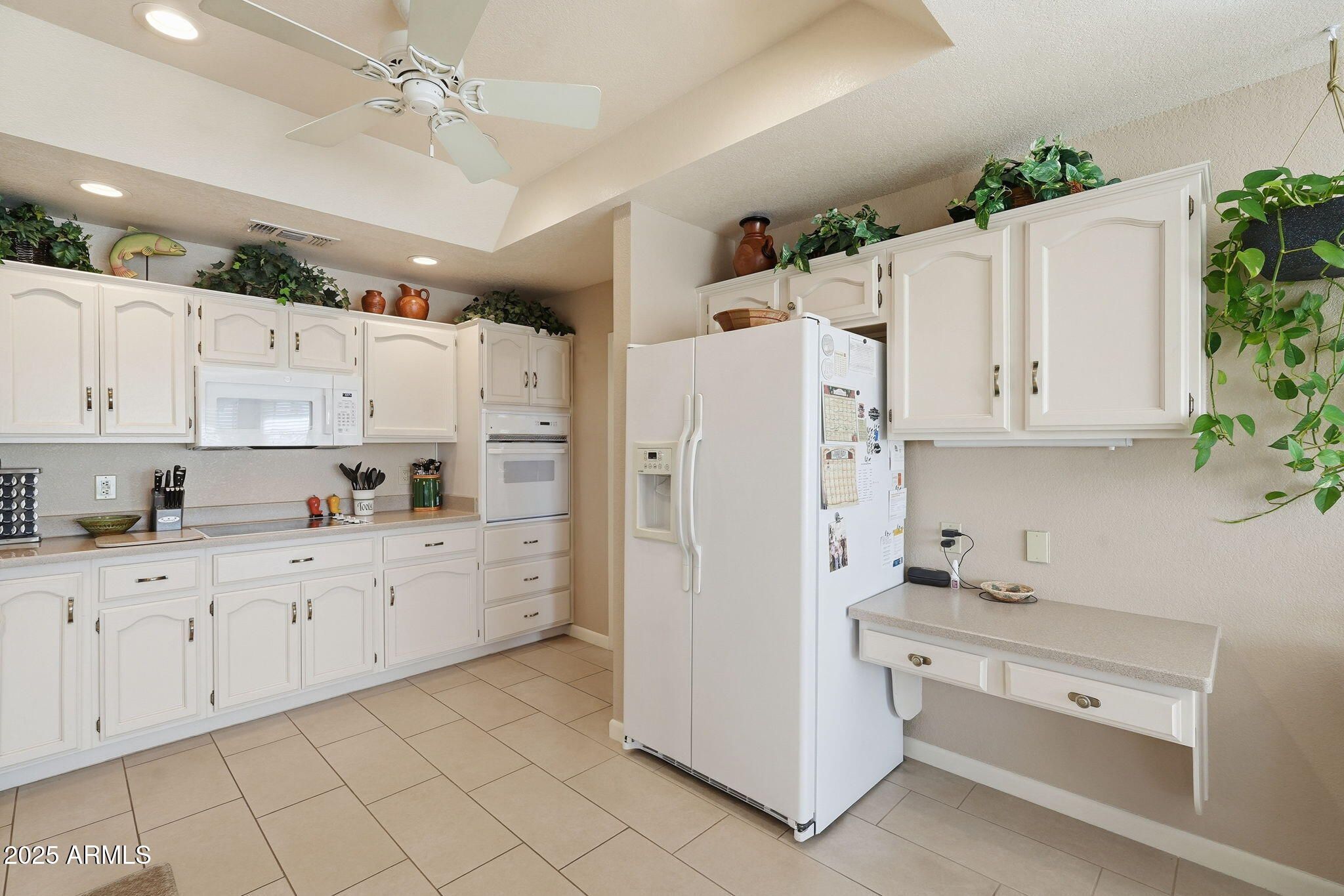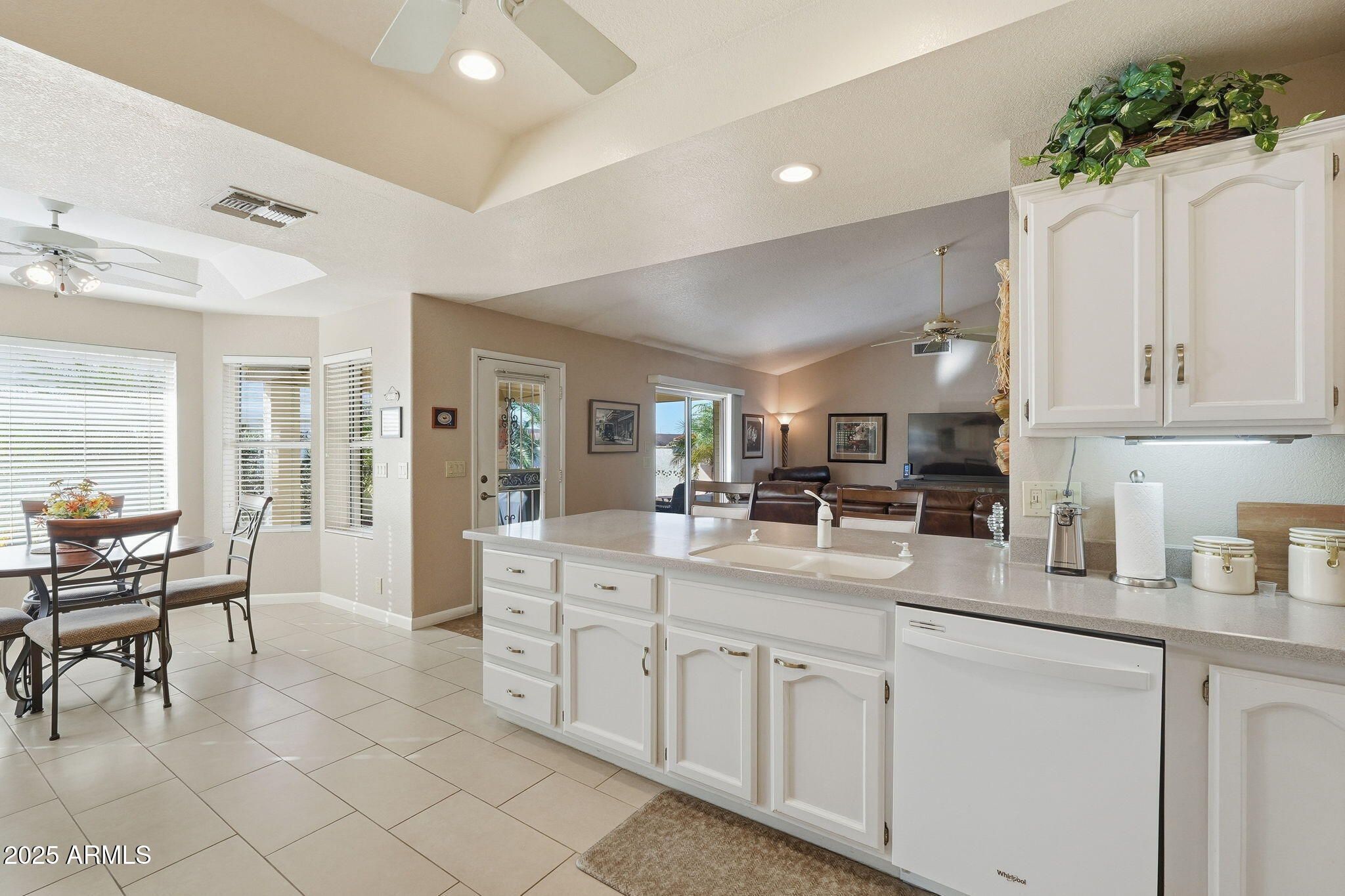 Welcome home to this standout corner-lot, two-bedroom, 2.5-bathroom home featuring the rarely listed double garage plus golf cart garage. This setup is a dream for car enthusiasts, complete with built-in cabinetry and a dedicated workspace—ideal for projects, storage, and displaying that collector car. The front patio and grand entry set the tone as you step inside this well-maintained home, where a large, vaulted living room offers space for a dining area or extra sitting area and flows effortlessly into the kitchen. With views into the living room, the chef's kitchen offers an abundant amount of counter space and cabinetry, along with a sunny dining nook where south-facing light pours in all day long. Just off the kitchen is an extra-large laundry room with a half bath and direct access to the garage; super convenient and thoughtfully designed. The spacious primary suite features south-facing windows and a private bath with dual sinks, painted cabinetry, garden tub, walk-in shower, separate stool room, and a walk-in closet. A comfortable guest bedroom is located down the hall near the guest bath with painted cabinetry and a shower/tub combo. Bonus: two hallway closets between the bedrooms make staying organized a breeze. Relax in the fully fenced, south-facing backyard featuring coated concrete creating the flagstone look under covered patio and low-maintenance turf; your own private outdoor retreat. Major updates offer peace of mind, including a new roof in 2019 with warranty, HVAC replacement in 2018, and a new water heater in 2025. This home combines thoughtful updates, functional spaces, and exceptional indoor-outdoor living, truly a rare find. Top it all off with an amazing amenity-packed community and low annual HOA; this place is truly an adult playground with endless ways to stay active, social, and entertained. This one checks all the boxes and then some!
