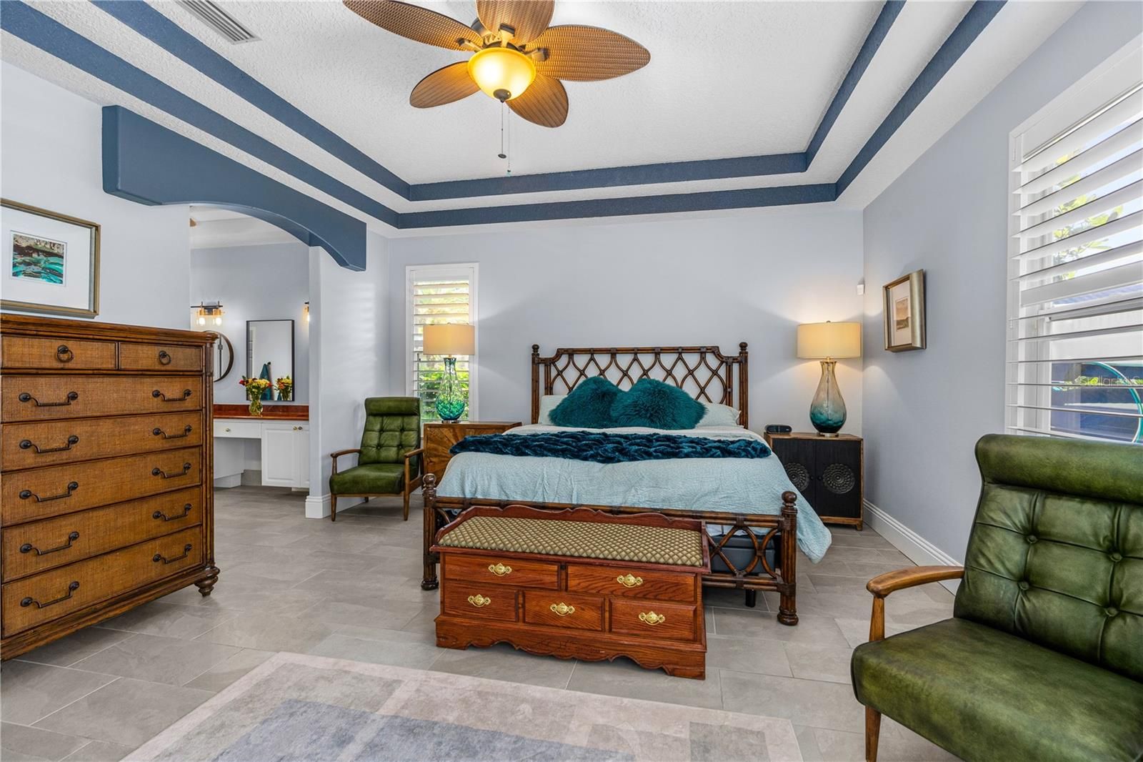 - Ceiling Fan(s), High Ceilings, Kitchen/Family Room Combo, Living/Dining Room, Main Level Primary, Solid Surface Counters, Split Bedrooms, Thermostat, Vaulted Ceiling(s), Walk-In Closet(s), Window Treatments