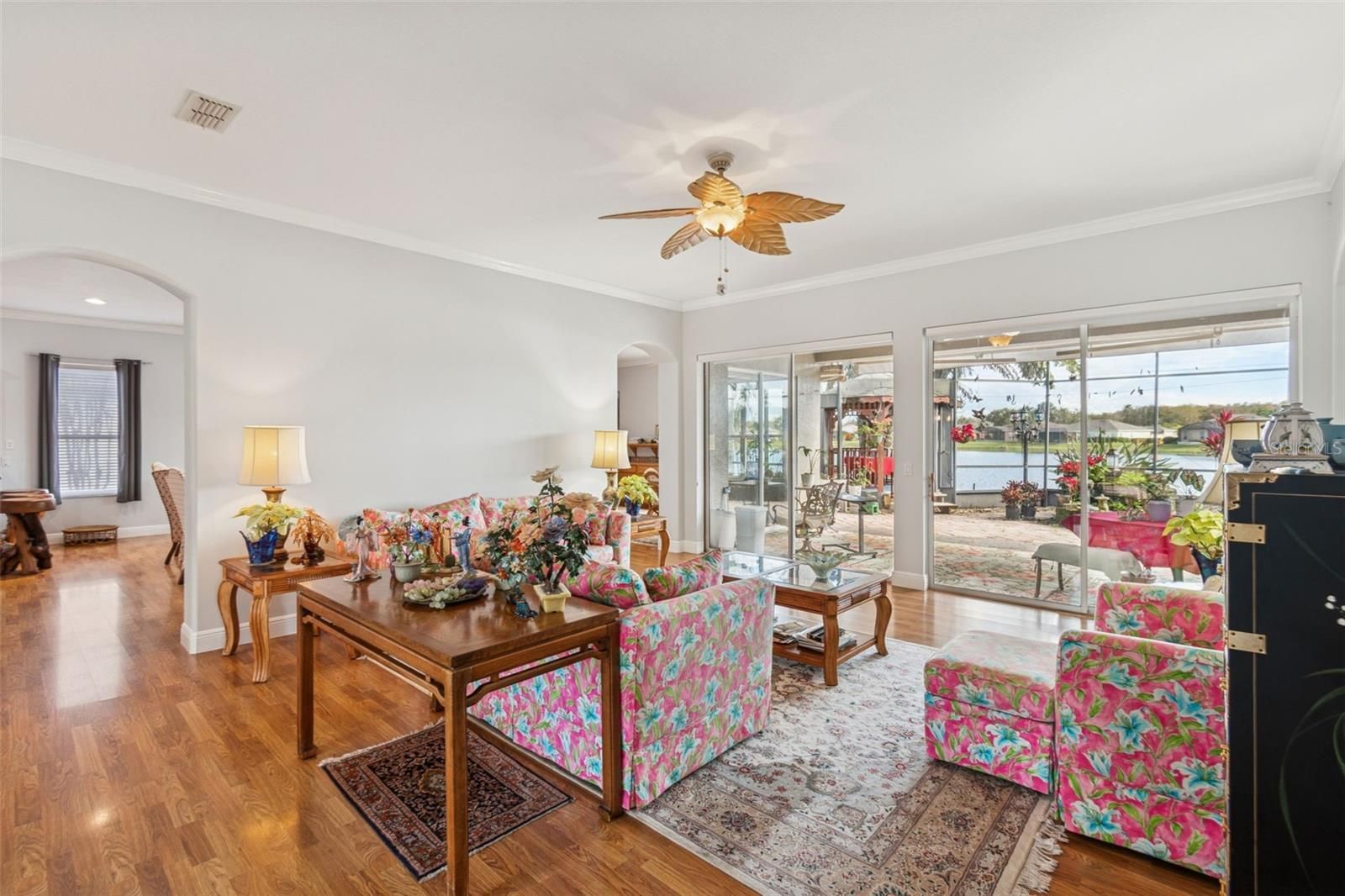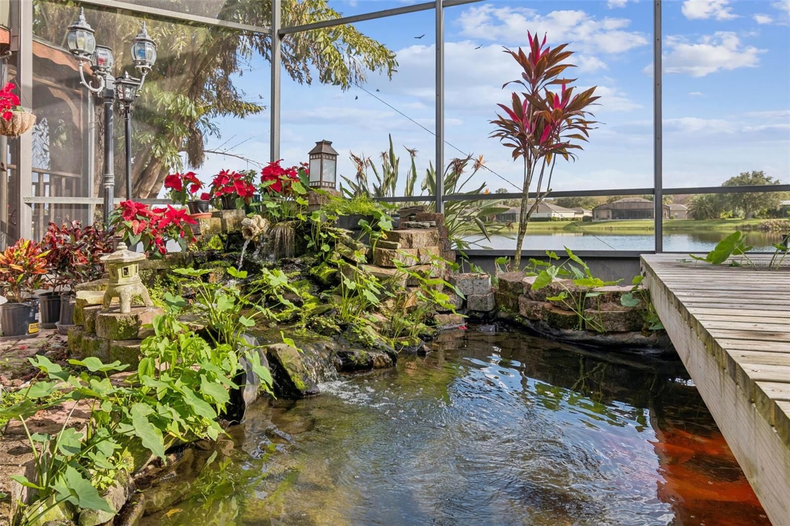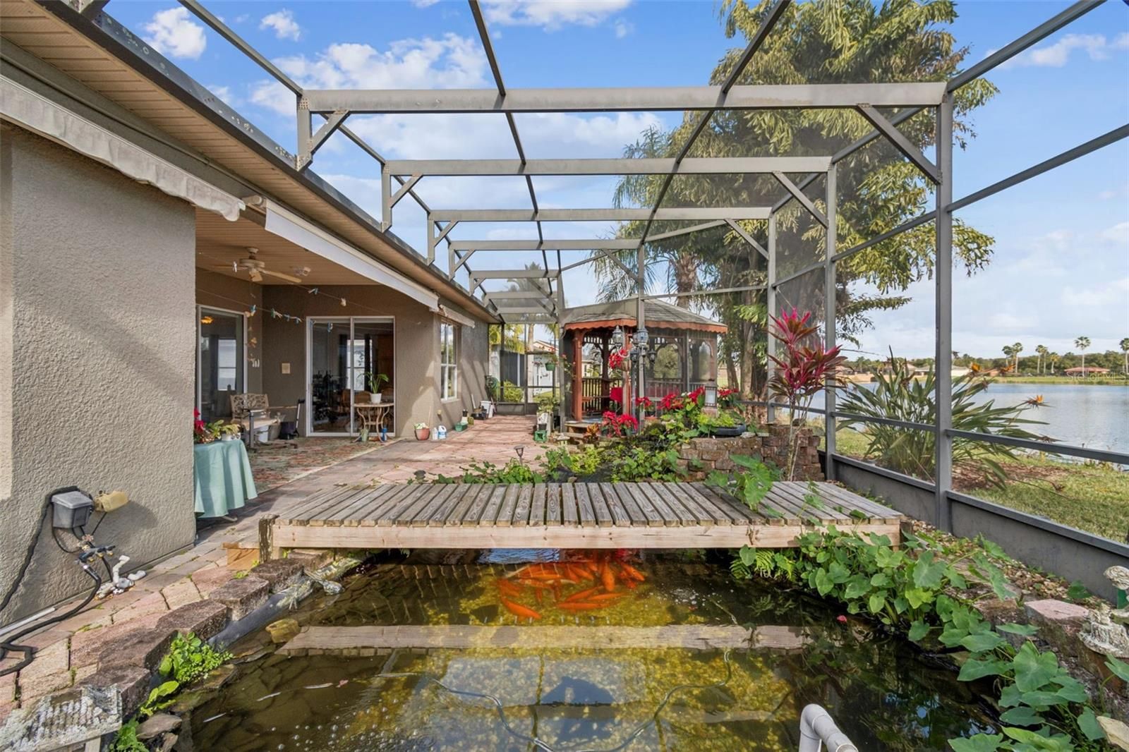 One or more photo(s) has been virtually staged. Beautiful well maintained Rhapsody model located in a quiet neighborhood of Solivita, offering expansive water views from the screened lanai and a peaceful conservation view from the front. This thoughtfully designed home features 3 bedrooms, a living room, dining room, and a Florida room—ideal for both everyday comfort and entertaining. Enter through elegant double leaded glass doors into an open and inviting interior. The gourmet kitchen is a chef’s dream, complete with a cook-top, double ovens, glass-front cabinetry, an eat-at bar, and a center island. The spacious primary bedroom enjoys a private water view and features an en-suite bathroom with a large walk-in closet, oversized walk-in shower, soaking tub, and dual vanities. The living room opens to the covered and screened lanai through sliding glass doors, while the Florida room showcases a custom built-in mirrored shelving cabinet and additional water views. The extended screened lanai is truly the entertainment centerpiece of this home, featuring a gazebo extension and a beautifully established Koi pond with a walk-over bridge—perfect for relaxing or hosting guests. There is no carpet in the home. All living areas feature luxury vinyl plank flooring and crown molding throughout. The laundry room includes custom cabinetry and a utility sink. The 2-car garage offers extra storage and pull-down stairs leading to a floored attic. Upgrades include: In-wall pest control system, water softener, Central Vacume System, HVAC (2023), water heater (2020), and roof (2016). Golf cart and select furniture are optional. This exceptional home truly captures the Solivita lifestyle—don’t miss it! Solivita is a premier 55+ community, offering residents an exceptional lifestyle with state-of-the-art amenities. Enjoy a fully equipped fitness center, dance and aerobics studios, and an impressive array of recreational options including 14 heated swimming pools, two heated spas, tennis courts, pickleball courts, shuffleboard, bocce ball, billiards, and an art gallery. The community also features three on-site restaurants and two championship 18-hole golf courses. With a full calendar of activities and events, there’s always something new to explore and enjoy. This home is conveniently located near a hospital and medical office complex, shopping, dining, and a brand-new shopping center—featuring Sprouts, Outback and other popular retailers—offering the perfect balance of privacy, convenience, and an active lifestyle.