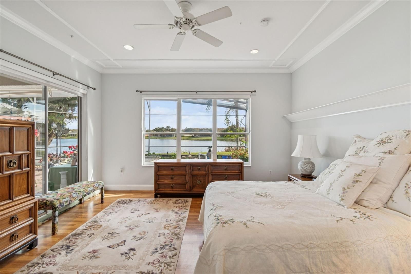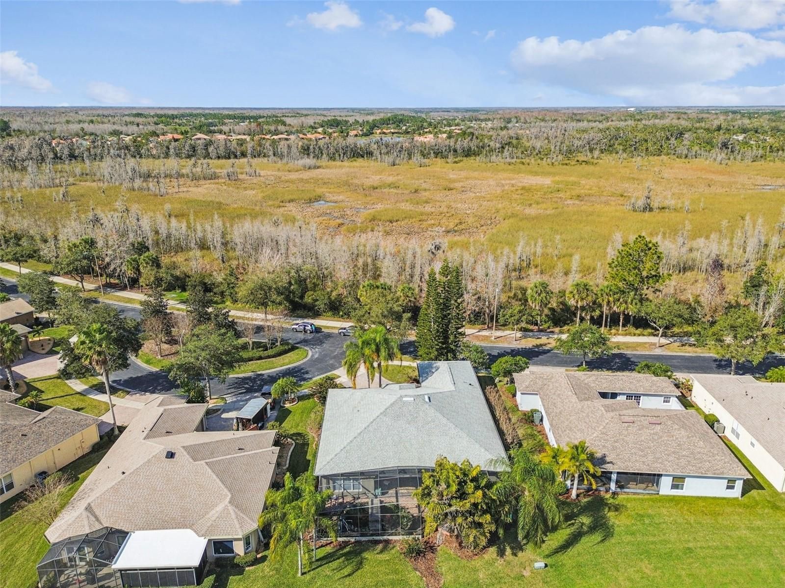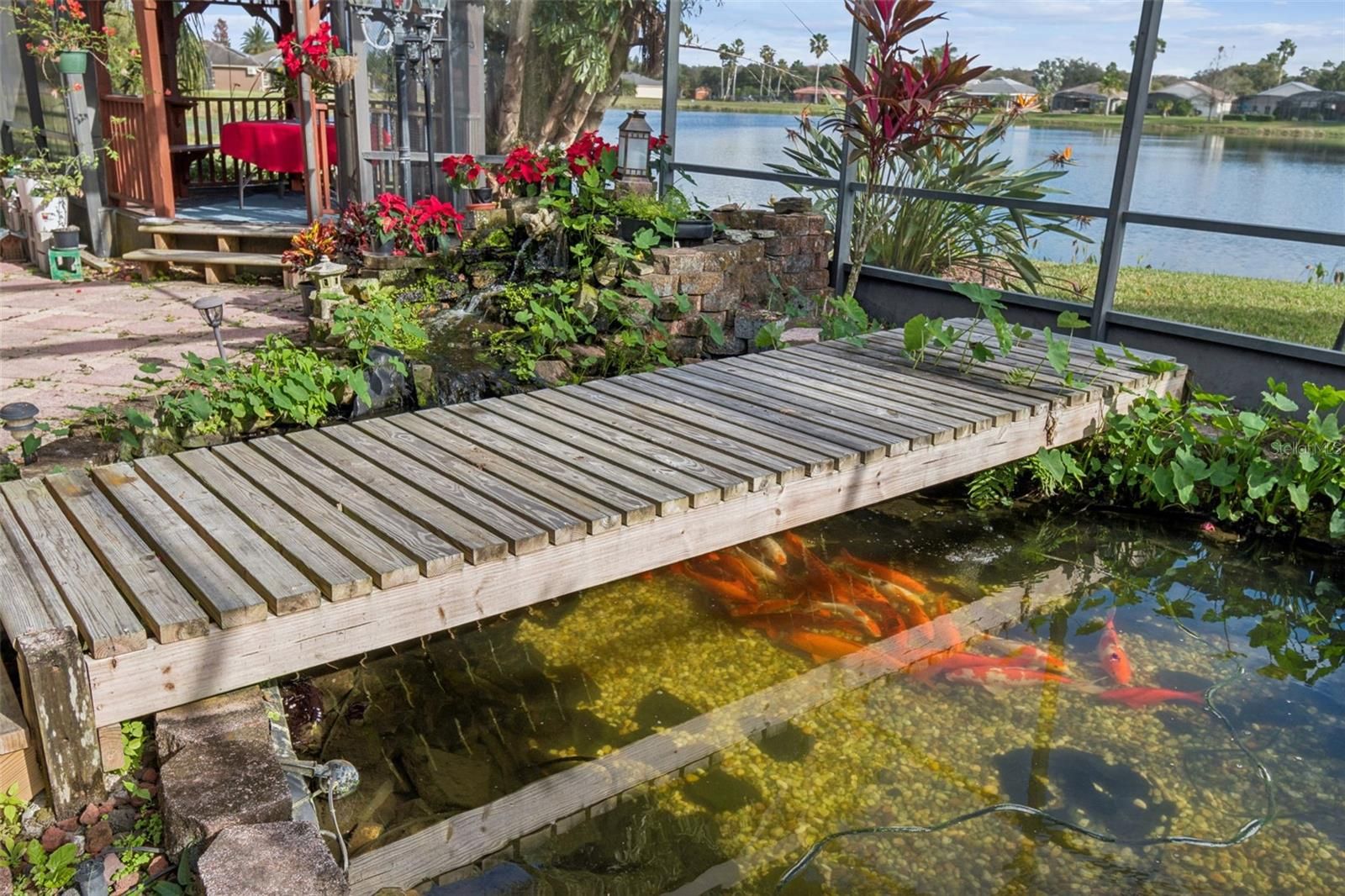 One or more photo(s) has been virtually staged. Beautiful well maintained Rhapsody model located in a quiet neighborhood of Solivita, offering expansive water views from the screened lanai and a peaceful conservation view from the front. This thoughtfully designed home features 3 bedrooms, a living room, dining room, and a Florida room—ideal for both everyday comfort and entertaining. Enter through elegant double leaded glass doors into an open and inviting interior. The gourmet kitchen is a chef’s dream, complete with a cook-top, double ovens, glass-front cabinetry, an eat-at bar, and a center island. The spacious primary bedroom enjoys a private water view and features an en-suite bathroom with a large walk-in closet, oversized walk-in shower, soaking tub, and dual vanities. The living room opens to the covered and screened lanai through sliding glass doors, while the Florida room showcases a custom built-in mirrored shelving cabinet and additional water views. The extended screened lanai is truly the entertainment centerpiece of this home, featuring a gazebo extension and a beautifully established Koi pond with a walk-over bridge—perfect for relaxing or hosting guests. There is no carpet in the home. All living areas feature luxury vinyl plank flooring and crown molding throughout. The laundry room includes custom cabinetry and a utility sink. The 2-car garage offers extra storage and pull-down stairs leading to a floored attic. Upgrades include: In-wall pest control system, water softener, Central Vacume System, HVAC (2023), water heater (2020), and roof (2016). Golf cart and select furniture are optional. This exceptional home truly captures the Solivita lifestyle—don’t miss it! Solivita is a premier 55+ community, offering residents an exceptional lifestyle with state-of-the-art amenities. Enjoy a fully equipped fitness center, dance and aerobics studios, and an impressive array of recreational options including 14 heated swimming pools, two heated spas, tennis courts, pickleball courts, shuffleboard, bocce ball, billiards, and an art gallery. The community also features three on-site restaurants and two championship 18-hole golf courses. With a full calendar of activities and events, there’s always something new to explore and enjoy. This home is conveniently located near a hospital and medical office complex, shopping, dining, and a brand-new shopping center—featuring Sprouts, Outback and other popular retailers—offering the perfect balance of privacy, convenience, and an active lifestyle.