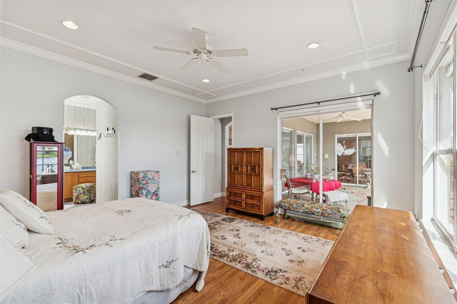 - Ceiling Fan(s), Crown Molding, Eat-in Kitchen, In-Wall Pest Control, Kitchen/Family Room Combo, Open Floorplan, Main Level Primary, Solid-Wood Cabinets, Stone Counters, Thermostat, Walk-In Closet(s), Window Treatments