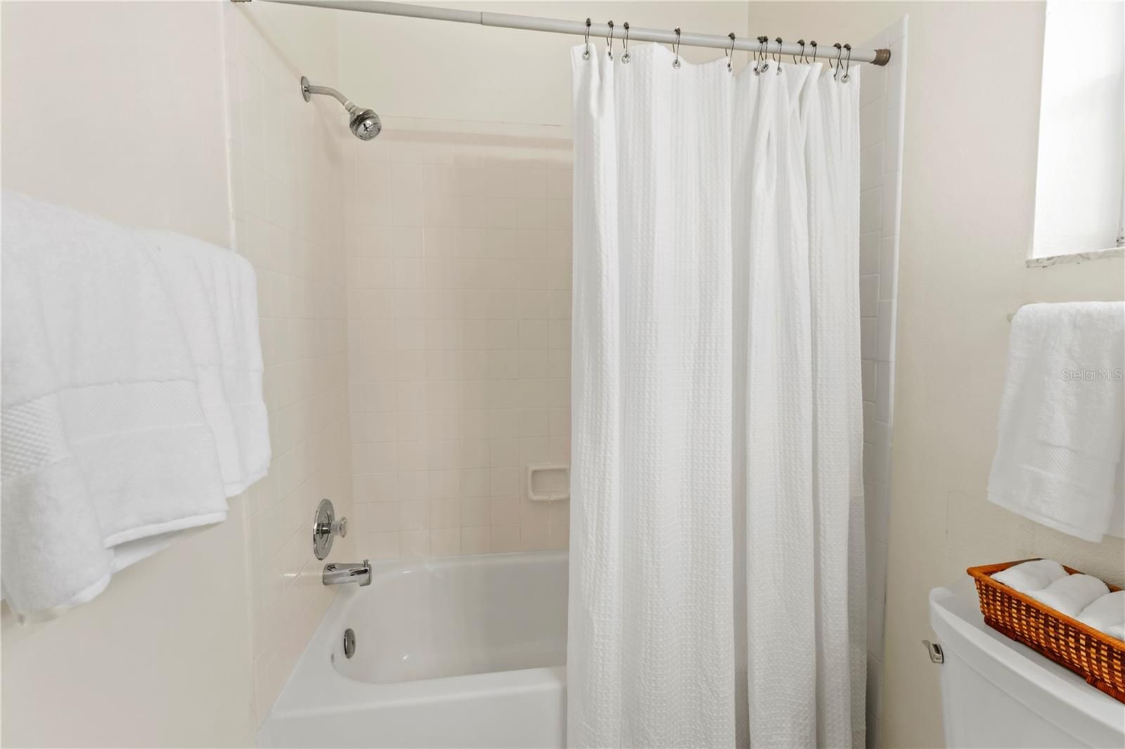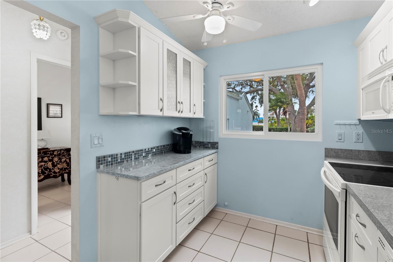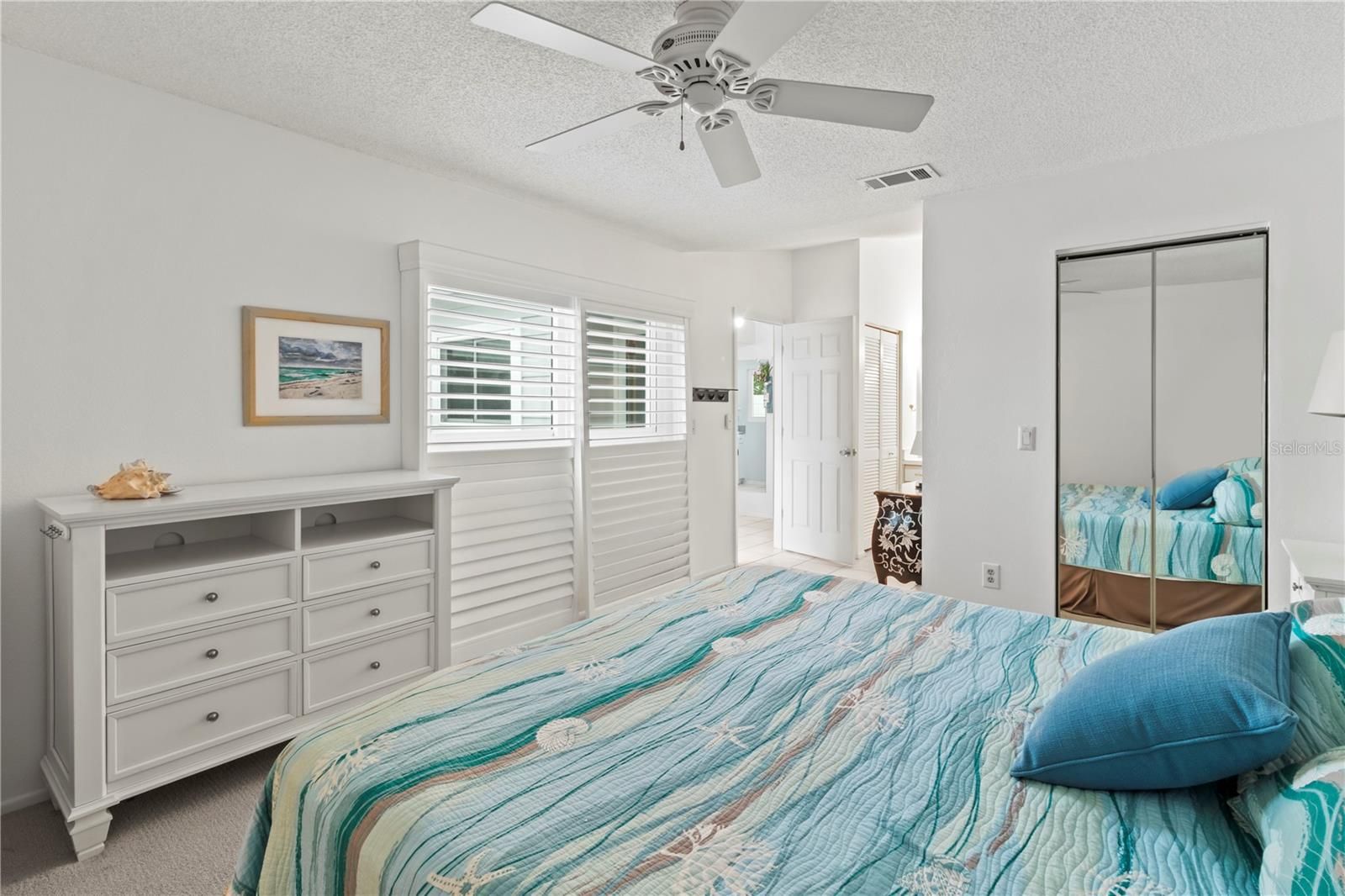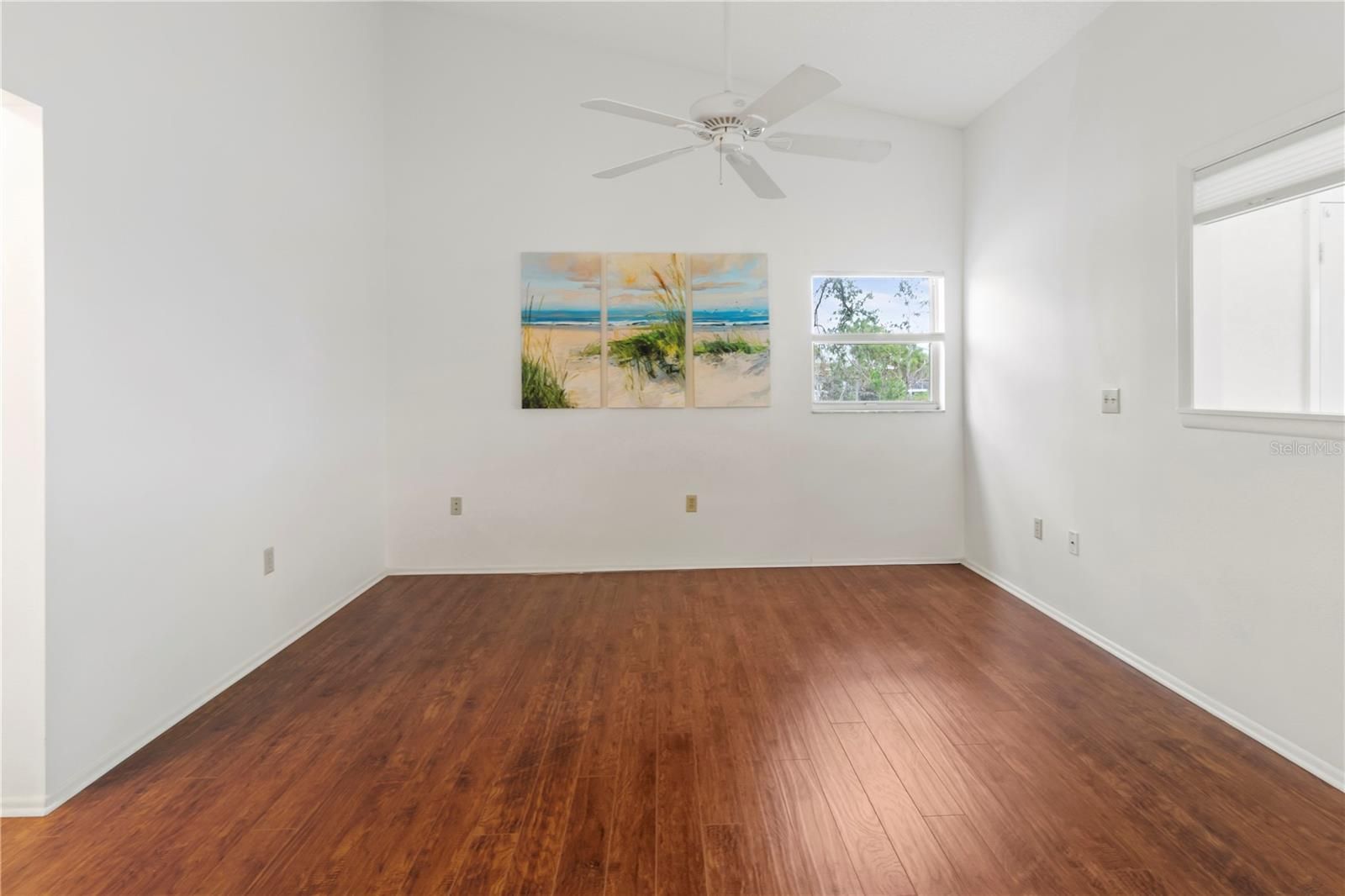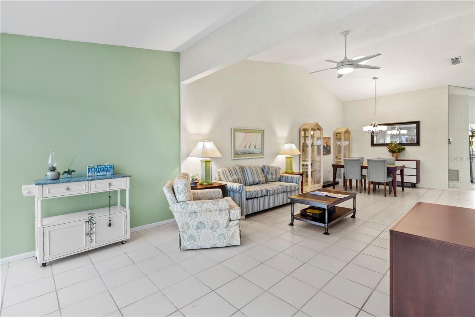 - Cathedral Ceiling(s), Ceiling Fan(s), Living/Dining Room, Window Treatments