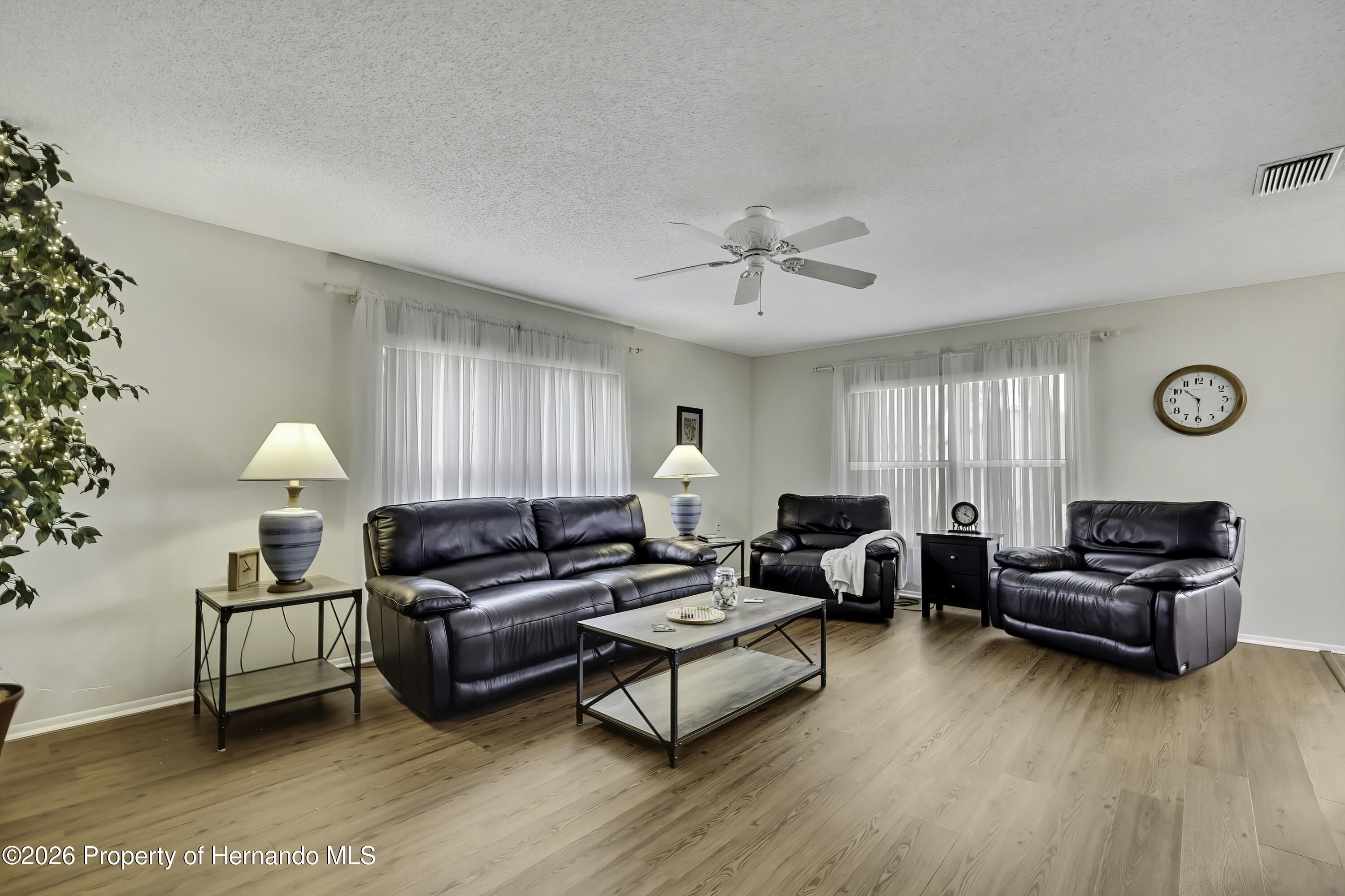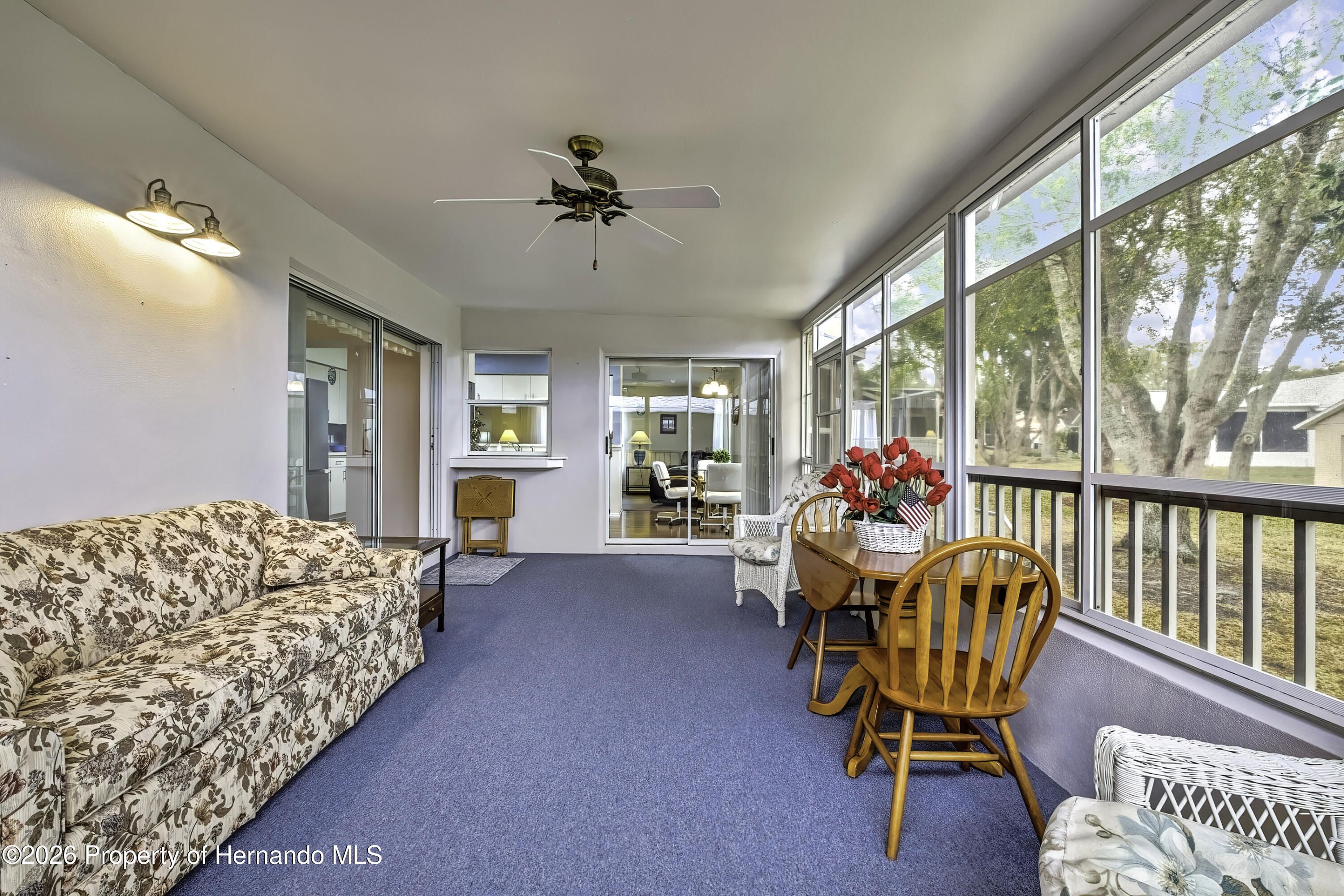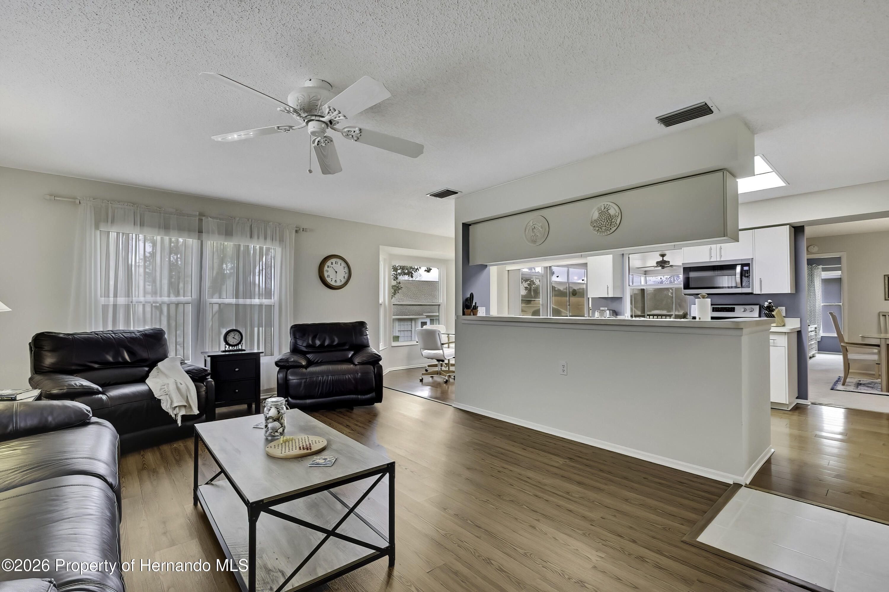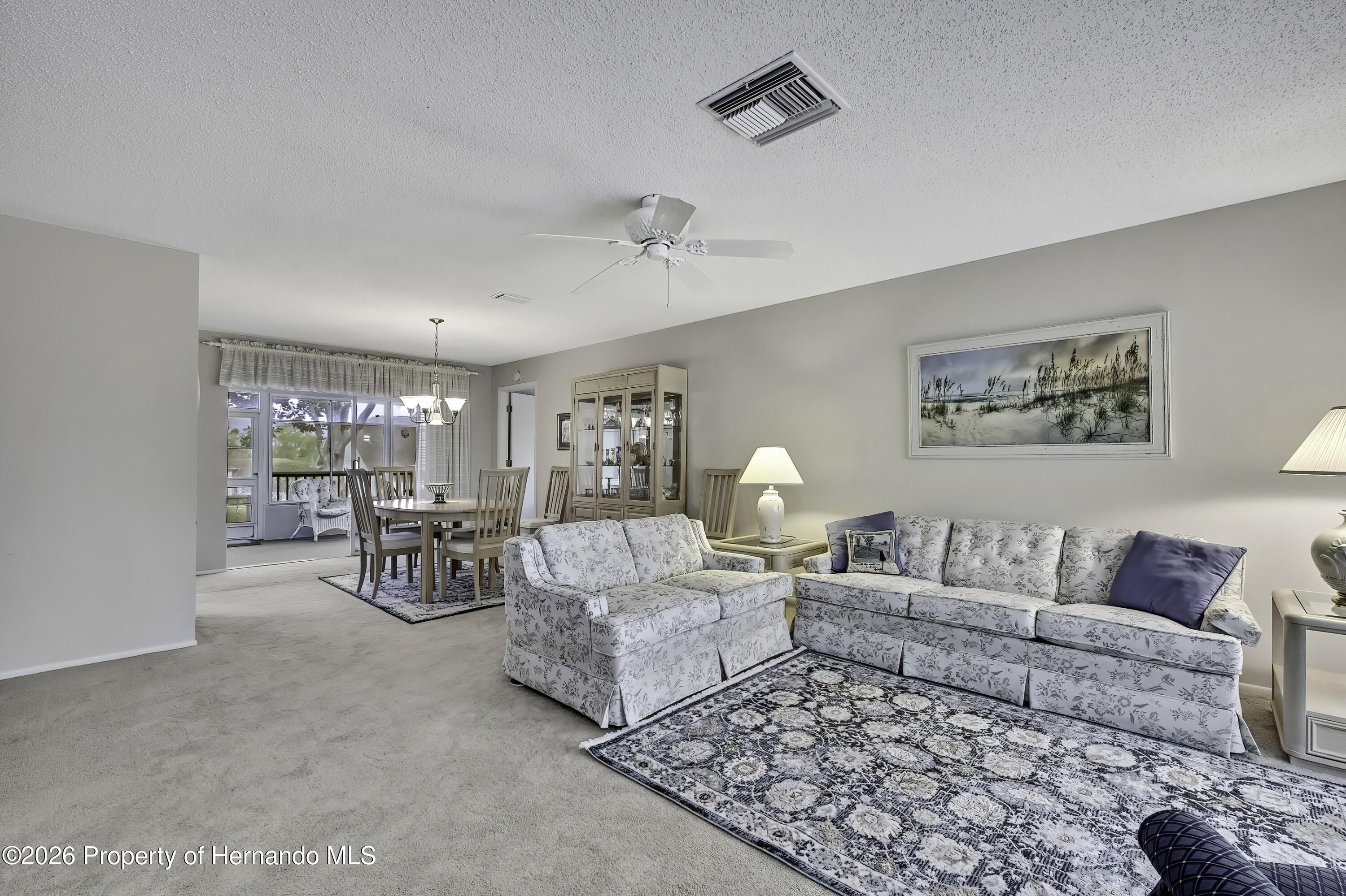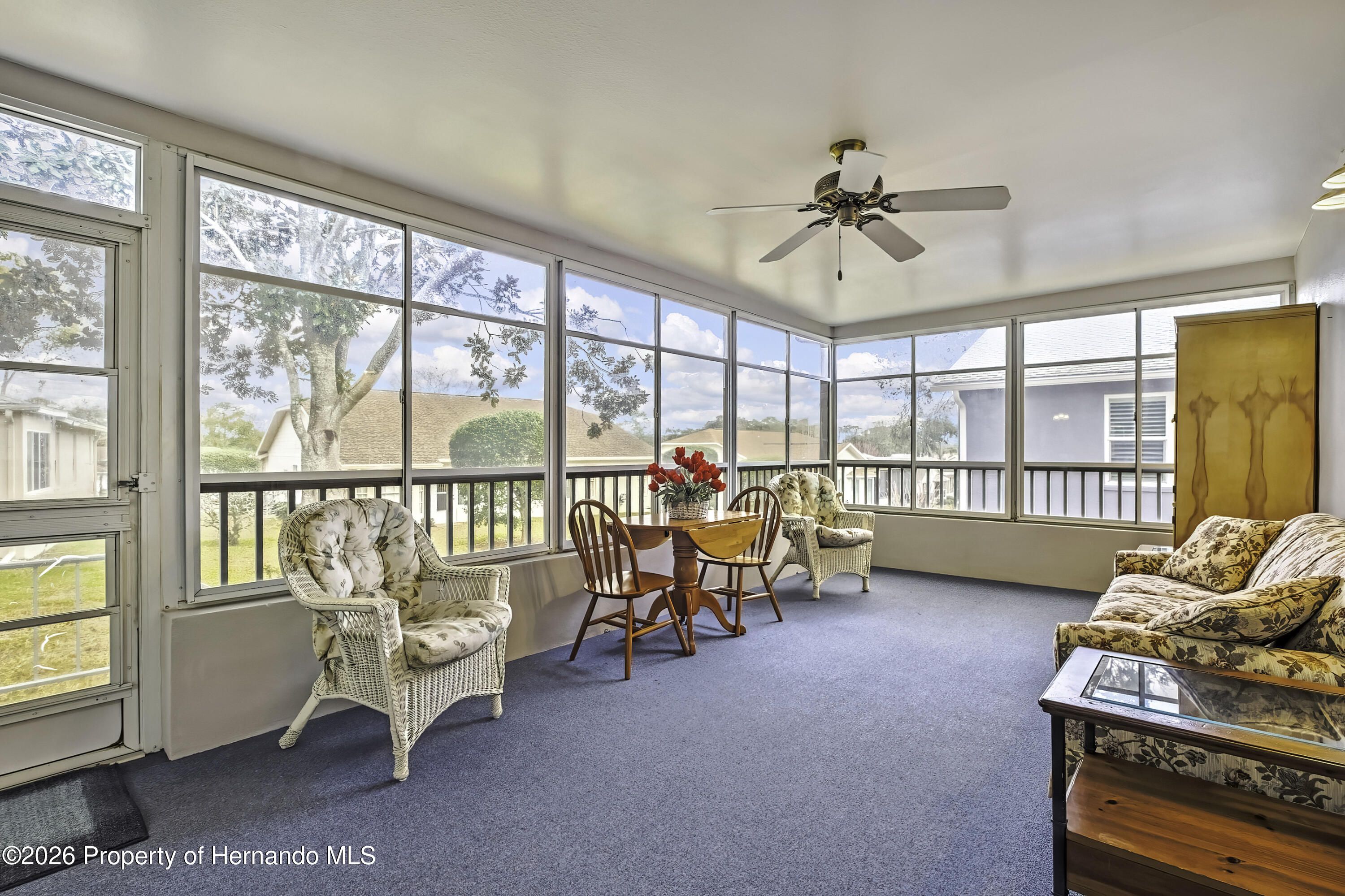 Beautifully maintained and fully furnished turnkey home featuring 2 bedrooms, 2 baths, a 2-car garage, and 1,788 sq. ft. of living space. Perfectly situated on a lovely, winding, tree-lined street in the award-winning 55+ Timber Pines Golf Community! A welcoming living and dining room greet you as you enter, leading to a bright, spacious kitchen that will delight any chef. The kitchen offers abundant cabinet and counter space, stainless steel appliances, a breakfast bar, and a cheerful breakfast nook with a bay window. A large family room just off the kitchen provides plenty of additional space to relax or entertain. The calming primary bedroom easily accommodates large furniture and includes a walk-in closet. The primary bath features dual sinks and a walk-in shower. A generous guest bedroom offers flexibility for visitors, a home office, or a craft room. Major updates include: • All new double-pane windows (2024) • New A/C (2022) with a 10-year transferable warranty • Roof replaced in 2014 Timber Pines is a 55+ active, gated community offering 4 golf courses, a Country Club, a high-end restaurant and bar with multiple TV screens, 2 pools, a fitness center, tennis and pickleball courts, bocce ball, a billiards room, and more than 100 clubs. Spectrum cable (with 2 boxes) and high-speed internet are included in the HOA. Come view this beautifully maintained, fully furnished, turnkey, and competitively priced home today!