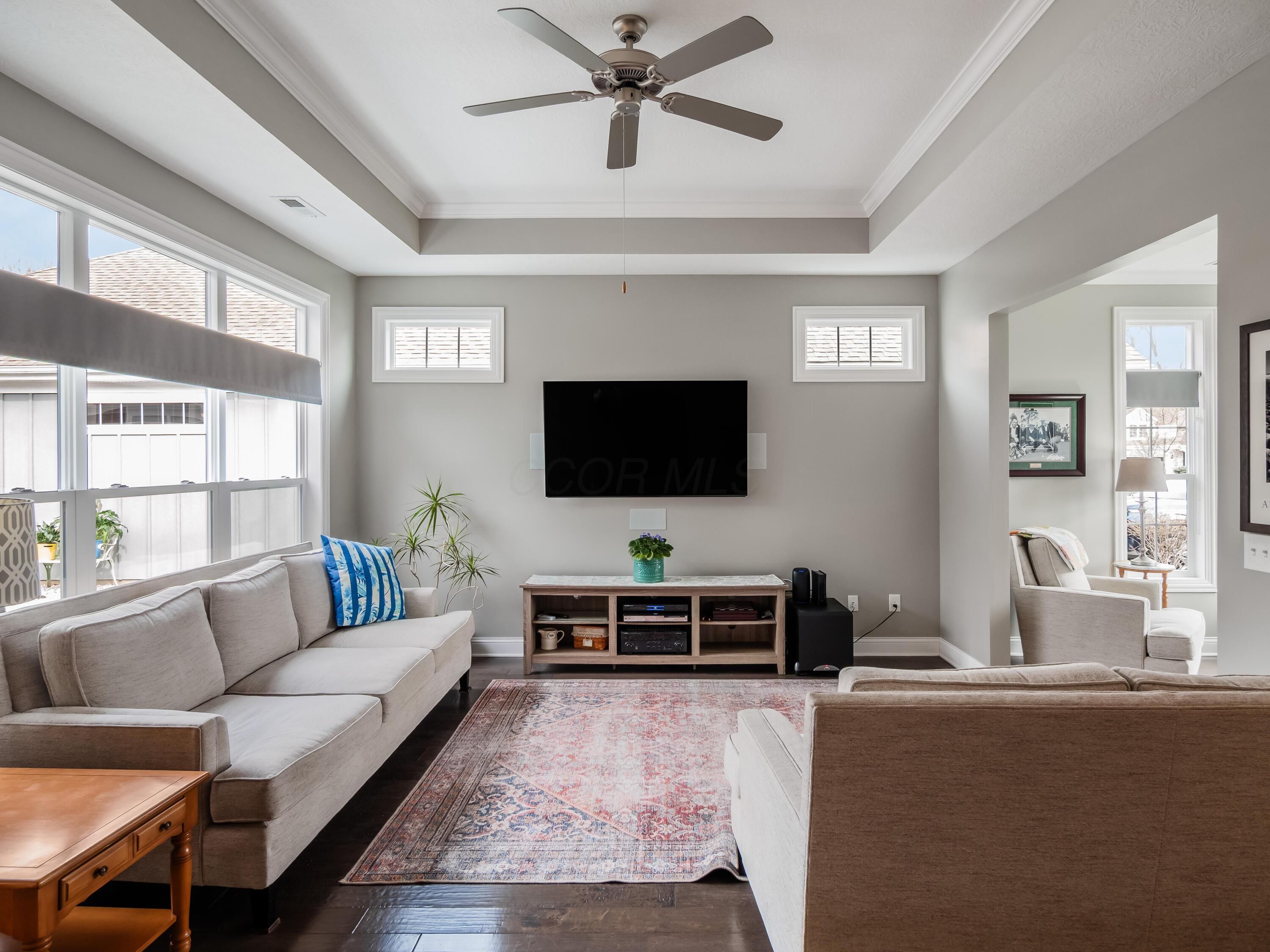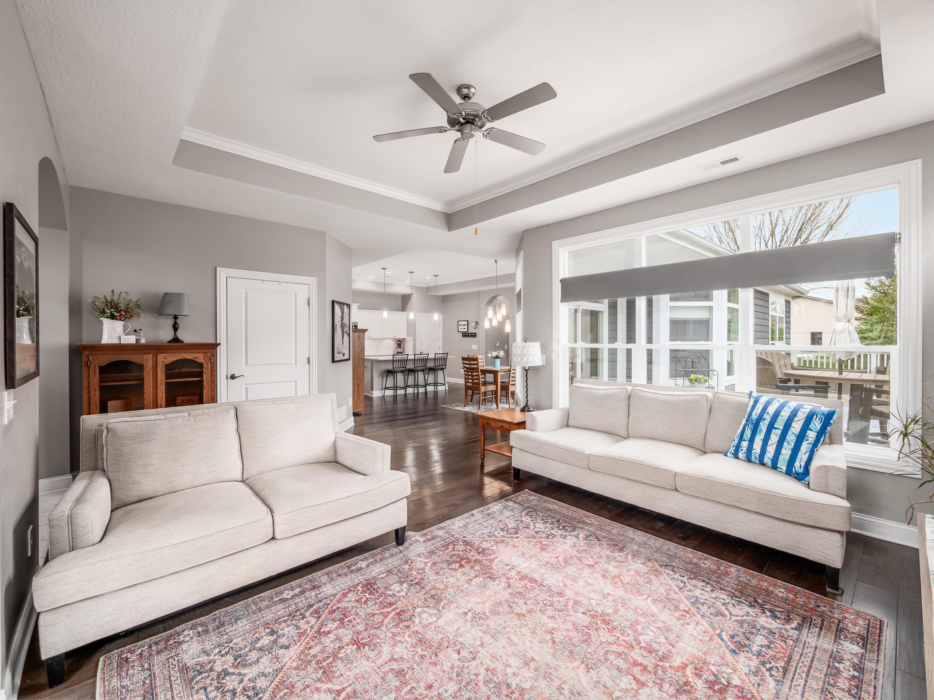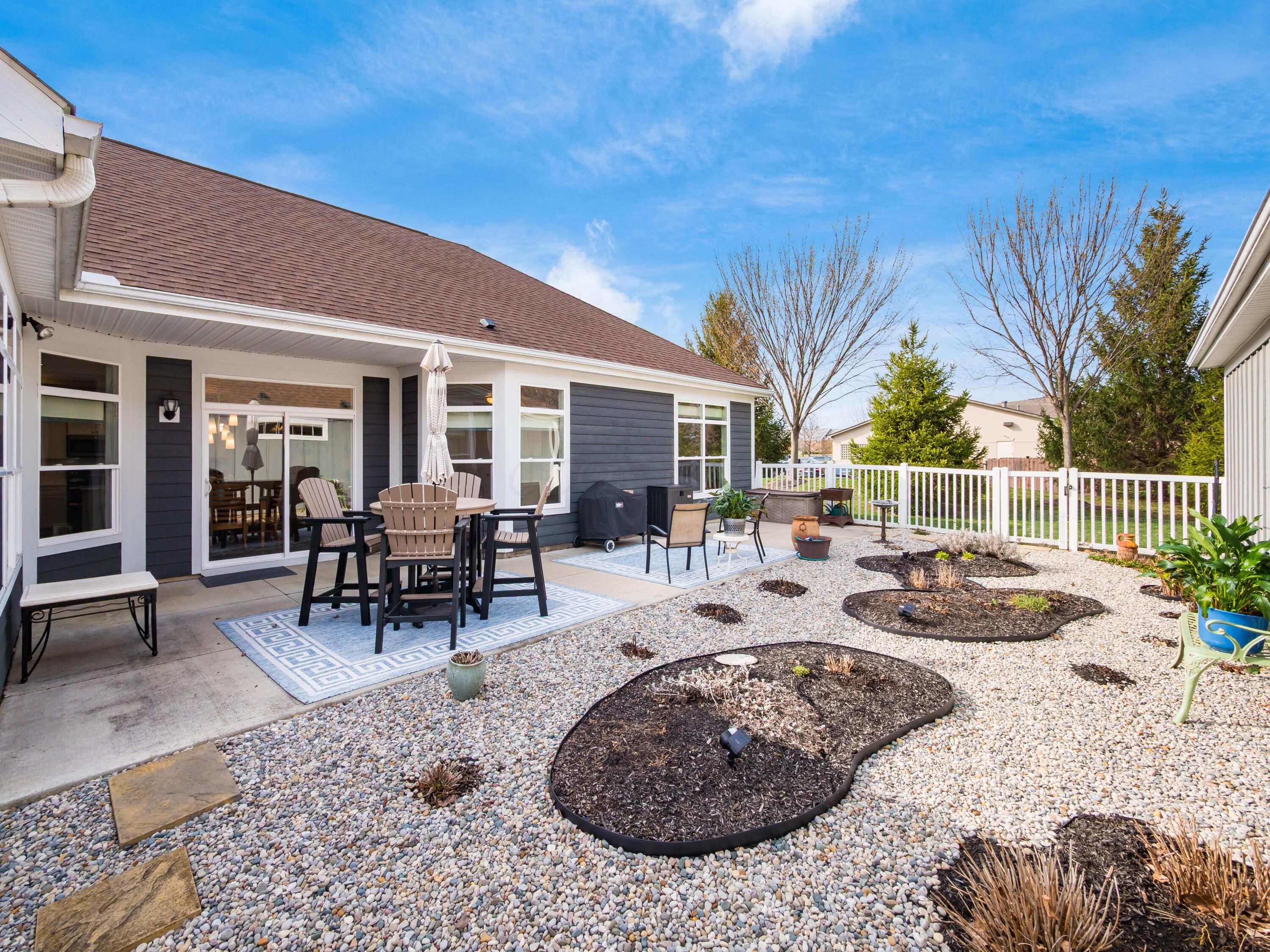 Simplify in Style! This Desirable Epcon Palazzo ranch in Courtyards at Hidden Ravines in Lewis Center has it all! One floor living at its finest! A thoughtful floor plan with flexibility. Inviting tile foyer welcomes you to this thoughtful floorpan with lovely warm neutral decor. Tons of natural light in all areas including the living room with Tray ceiling and opens to 4-season room. Beautiful custom blinds highlight the numerous windows. Kitchen with quartz countertops and SS appliances with spacious pantry countertop eating space opens to the dining area. From there to the patio with numerous perennials and huge patio and courtyard extending your entertainment space for family and friends! Numerous upgrades! Solid wood doors and 5 1/2'' baseboards throughout! Guest bedroom has added cabinetry for tons of extra storage or perfect for home office or craft area! Roomy owner's suite has tray ceilings and upgraded shower and huge custom closet to die for! This home is meticulously maintained and well planned! So much more! Close to shopping, tons of restaurants and I71 & 270. Updated clubhouse with pool and numerous activities for this close knit community! A must see!