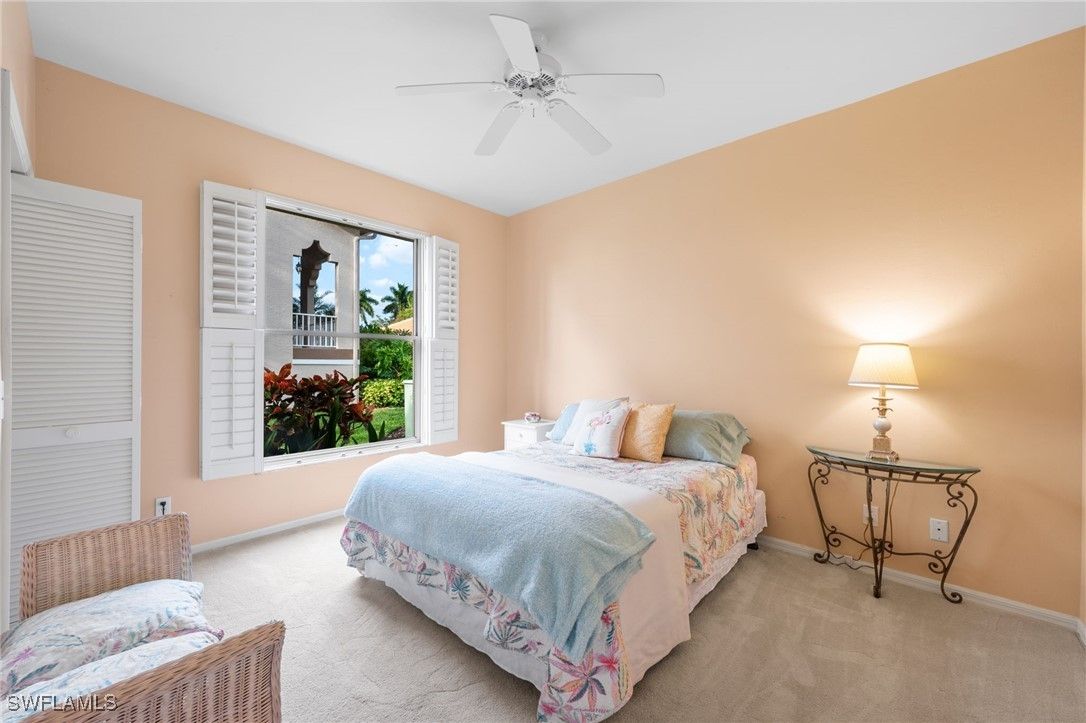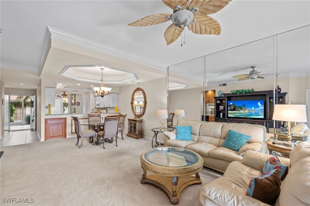 Stunning Golf Course Views at The Verandas | Lely Resort. Experience the epitome of Florida living in this meticulously maintained first-floor condominium located at 8015 Tiger Cove. Situated within the prestigious Verandas at Tiger Cove, this 3- bedroom, 2-bathroom residence combines architectural elegance with peaceful golf course vistas. This home has a bright & airy living space with soaring ceilings that create an expansive, sun-drenched atmosphere throughout the main living areas. Sophisticated details are displayed throughout the home. The interior is accented by elegant tray ceilings with crown molding and a convenient wet bar, perfect for entertaining guests. There are three generously sized bedrooms that offer plenty of room for family or a home office, featuring plush carpeting for a cozy, quiet feel. Enjoy the unique cross-breeze layout with both a welcoming front entry lanai and a private rear lanai off the living area. The owners have recently replaced the AC unit, washer, garage door opener and roof to ensure efficiency and lower maintenance costs. Electric hurricane shutters are included for quick and easy peace of mind. Relax on your back lanai and take in the beautiful Florida sunsets overlooking the lush greens of the Flamingo Golf Course. The Tiger Cove neighborhood has its own pool, basketball court and tennis/pickleball court. As a resident, you also have the optional opportunity to unlock the doors to the famed “Eight-time Club of the Year” Players Club and Spa. Imagine your weekends spent by the cascading 22-foot waterfall pool, enjoying drinks at the tiki hut, or challenging friends on the premier tennis and pickleball courts. With gourmet restaurants, a state- of-the-art fitness center, a full spa, and three championship golf courses all at your fingertips. This home perfectly blends luxury upgrades with a world-class resort lifestyle. Start living your best life today. Live, Laugh, and Love the Lely Lifestyle where every day feels like a vacation.