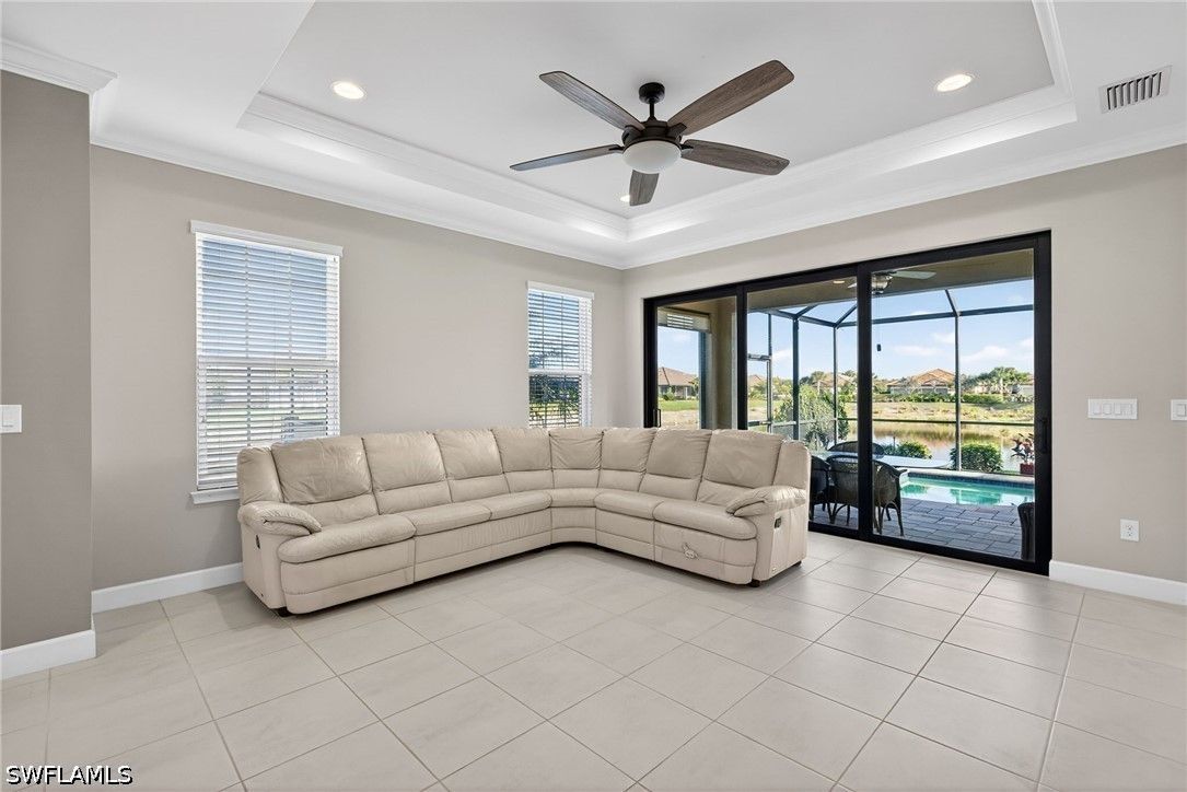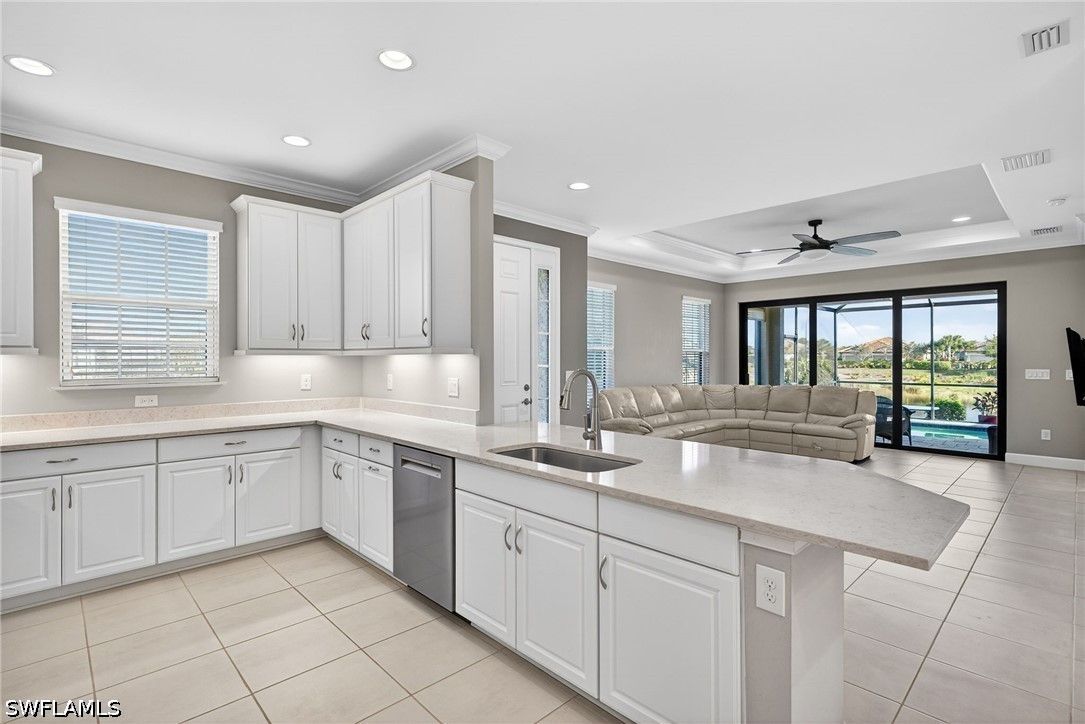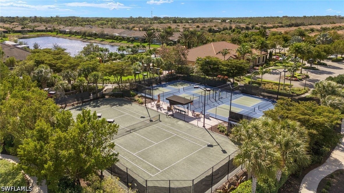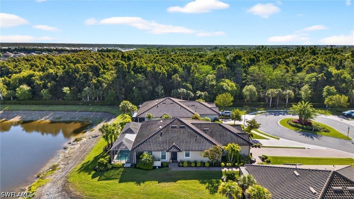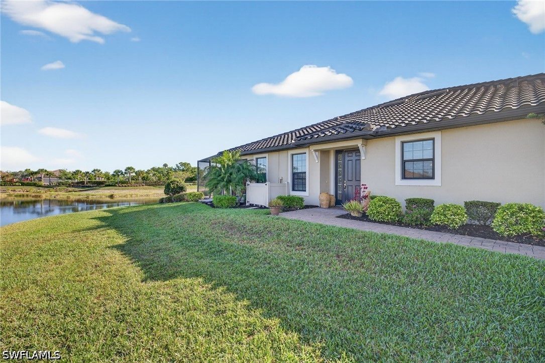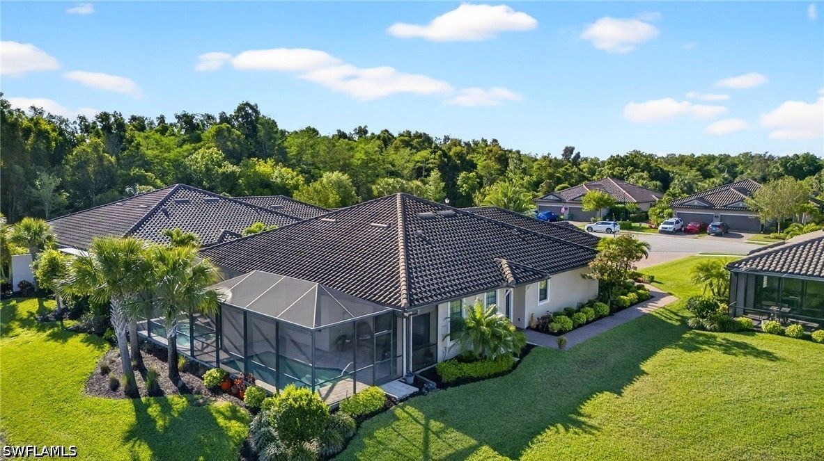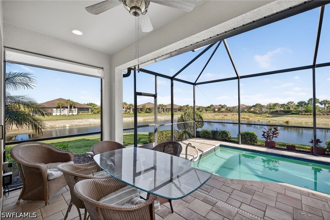 Tucked away on a quiet cul-de-sac, this beautifully maintained 2+den villa offers the perfect blend of privacy, comfort, and everyday convenience. Overlooking a tranquil lake, the home features a private heated pool, creating an ideal setting for relaxing afternoons and evenings. Inside, the layout is both functional and inviting, with an abundance of natural light. This home is equipped with impact-resistant windows and doors for added peace of mind. The spacious kitchen includes white-shaker cabinetry with organized slide-out racks and quartz countertops with generous counter space. Select rooms have been freshly painted, offering a light and refreshed feel throughout. The extended driveway provides added flexibility for guests and additional parking, an uncommon and valuable feature within the community. Located just minutes from the upcoming Costco and directly across from the rapidly growing Hacienda Lakes corridor, residents will enjoy immediate access to everyday essentials including dining, shopping, gas stations, and popular spots like First Watch, with even more commercial conveniences on the way. The community itself is known for its vibrant yet relaxed lifestyle, offering a lakefront clubhouse with a resort-style pool and spa, resistance training pool, fitness center, pickleball, tennis, bocce, and a dog park. This community includes natural gas, low HOA fees under $400/month and a full calendar of social activities. Close to I-75, 20 minutes to downtown Naples 5th Ave and beaches and minutes to Publix, Walmart and more!