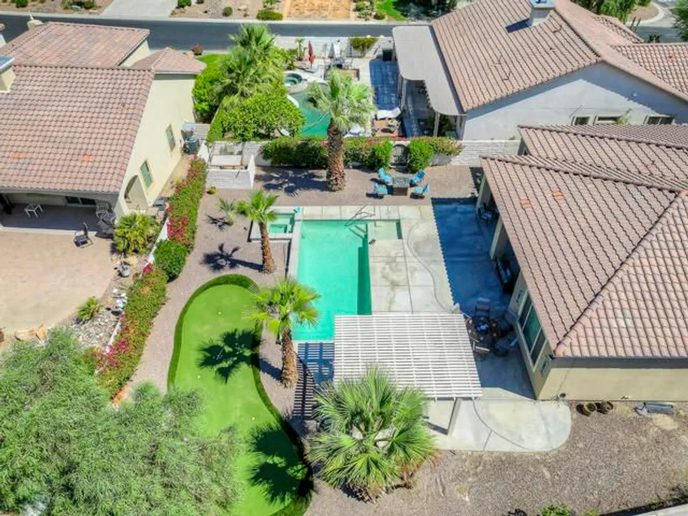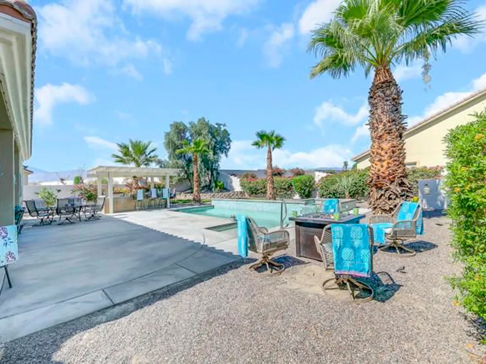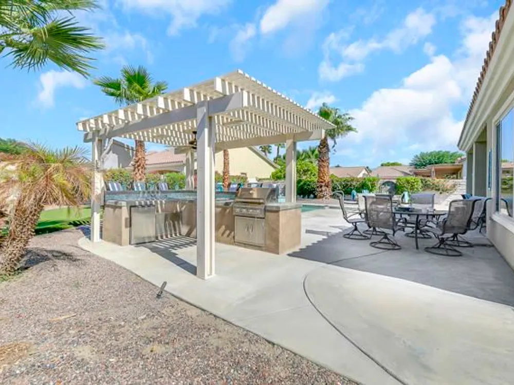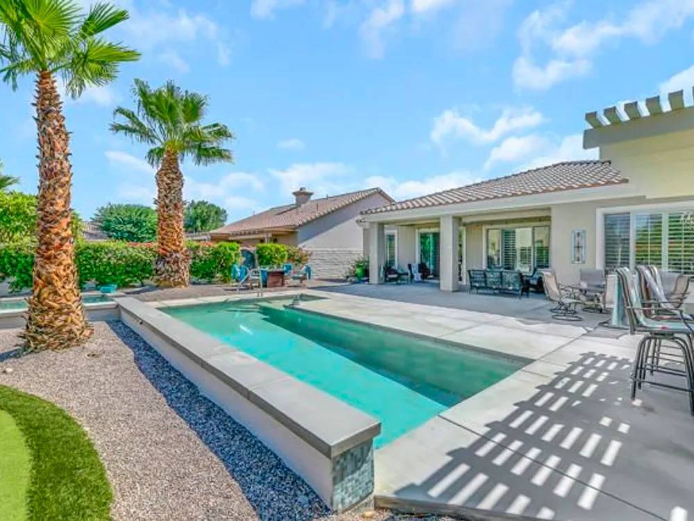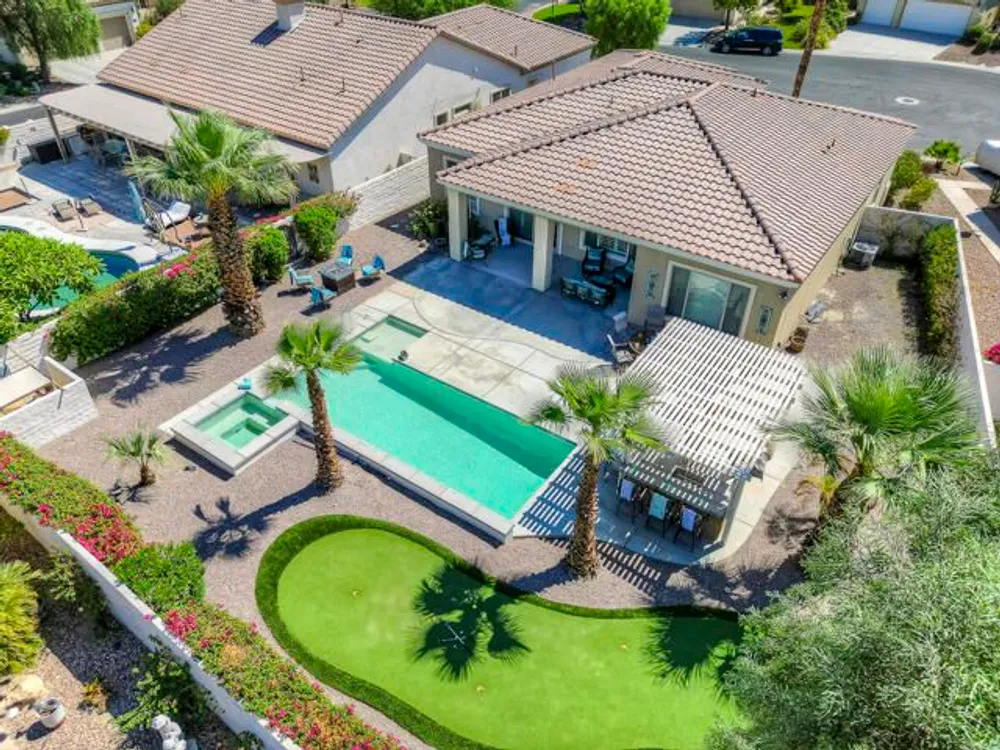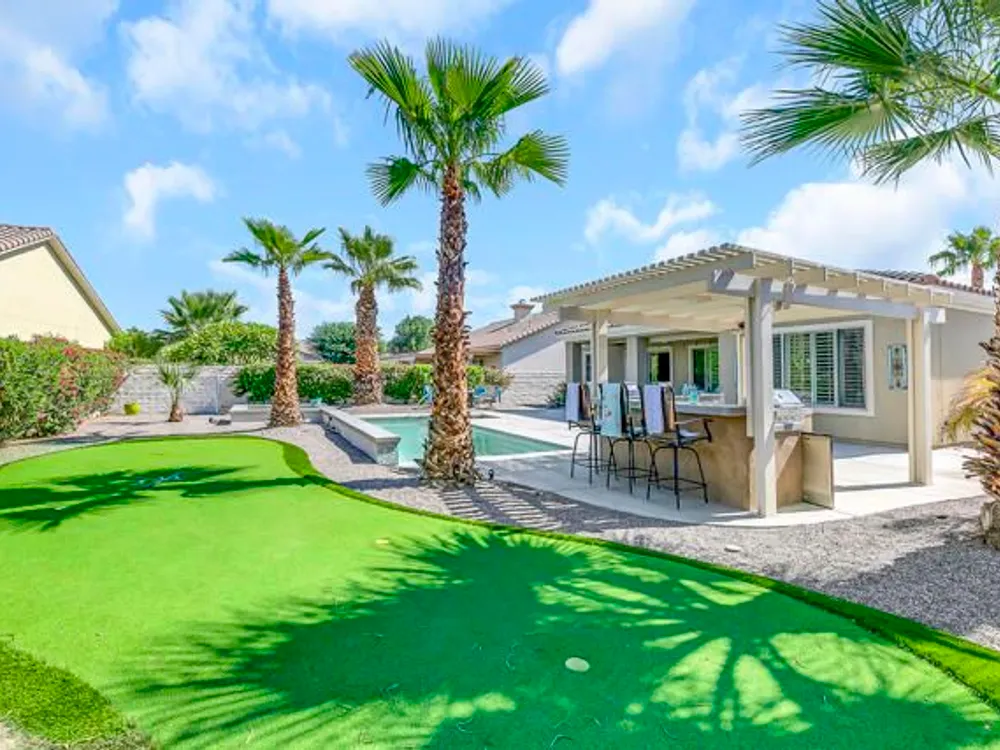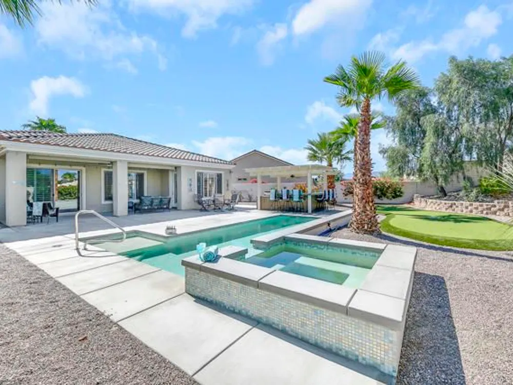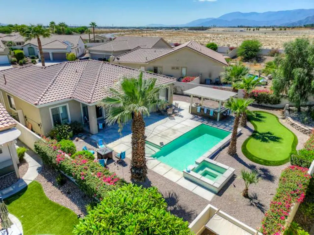 Welcome to your desert retreat in Sun City Shadow Hills. This popular San Emilio plan 2BD + Den, 2BA welcomes you with 10-ft ceilings and sun-filled spaces. The chef's kitchen is made for gathering featuring expansive granite counters, an 8-ft island, freshly painted white cabinetry, a roomy pantry off the breakfast nook, and a full suite of LG stainless appliances including dishwasher, cooktop, microwave, refrigerator, and double ovens. Throughout the home, you'll find plantation shutters and luxury vinyl flooring.Slide open the doors from the living room or the private primary suite and step into a resort backyard on a 9,148 SF lot: salt-water PebbleTec pool with tanning shelf, spa, and an outdoor kitchenette/bar equipped with a mini-fridge, sink, drawers, lighting & TV beneath an Alumawood pergola, plus a putting green and misting system with surround sound. Bask in glowing west-facing sunsets and peekaboo mountain views. The primary suite features a walk-in closet and step-in shower; the guest bath offers a tub/shower combo. A 2-car garage + golf-cart space and a dedicated laundry room with sink and storage add everyday ease. Welcome home to vibrant, low-maintenance living in a premier 55+ community!